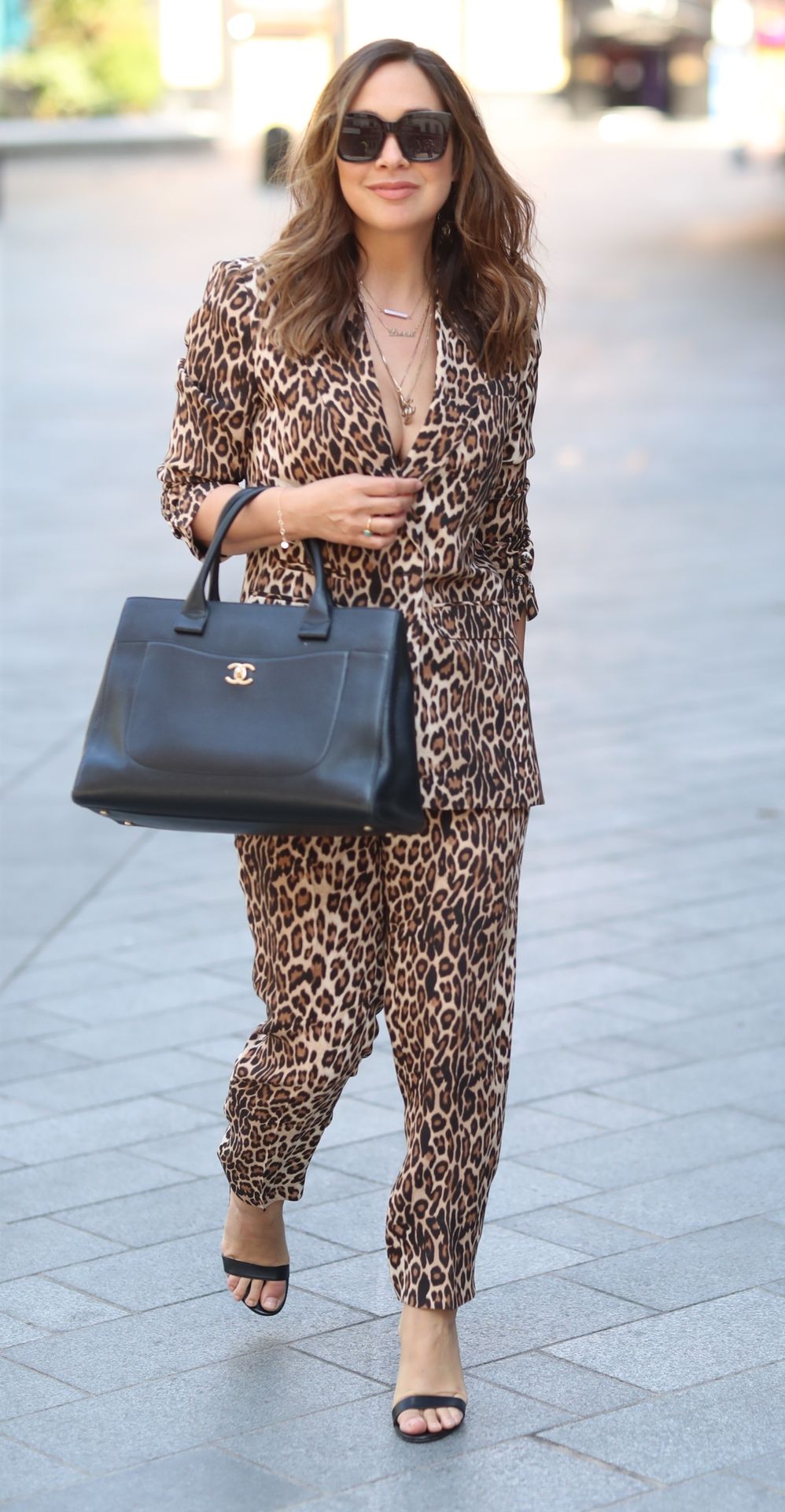 La chanteuse Myleene Klass arrive aux studios Global pour son émission Smooth Radio à Londres, portant un costume pantalon imprimé léopard ainsi qu’un sac Chanel, 21/05/2020.