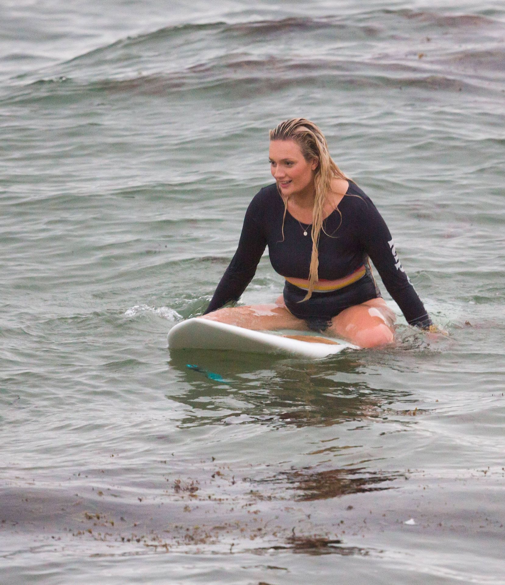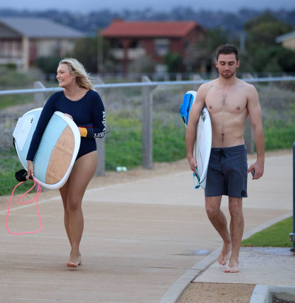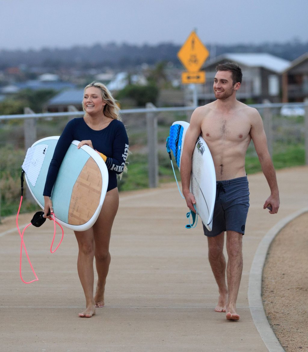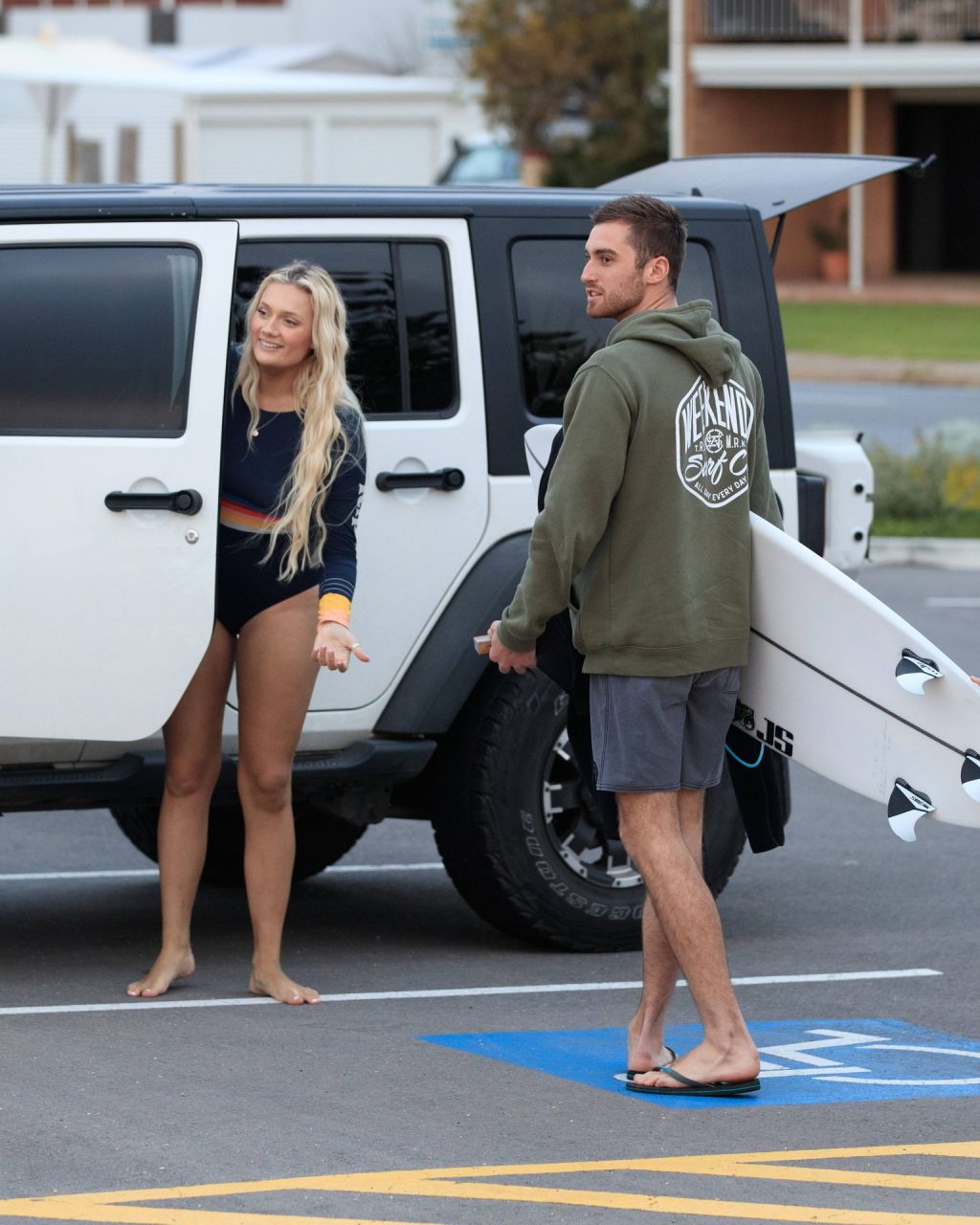 Talia a bravé des conditions plus fraîches à la plage de Southport en arrivant avec un ami et sa petite sœur. Elle était là pour lui apprendre quelques astuces de surf. Talia est arrivée à la plage dans un jeep blanc et en est sortie avec une planche longue sous un bras.