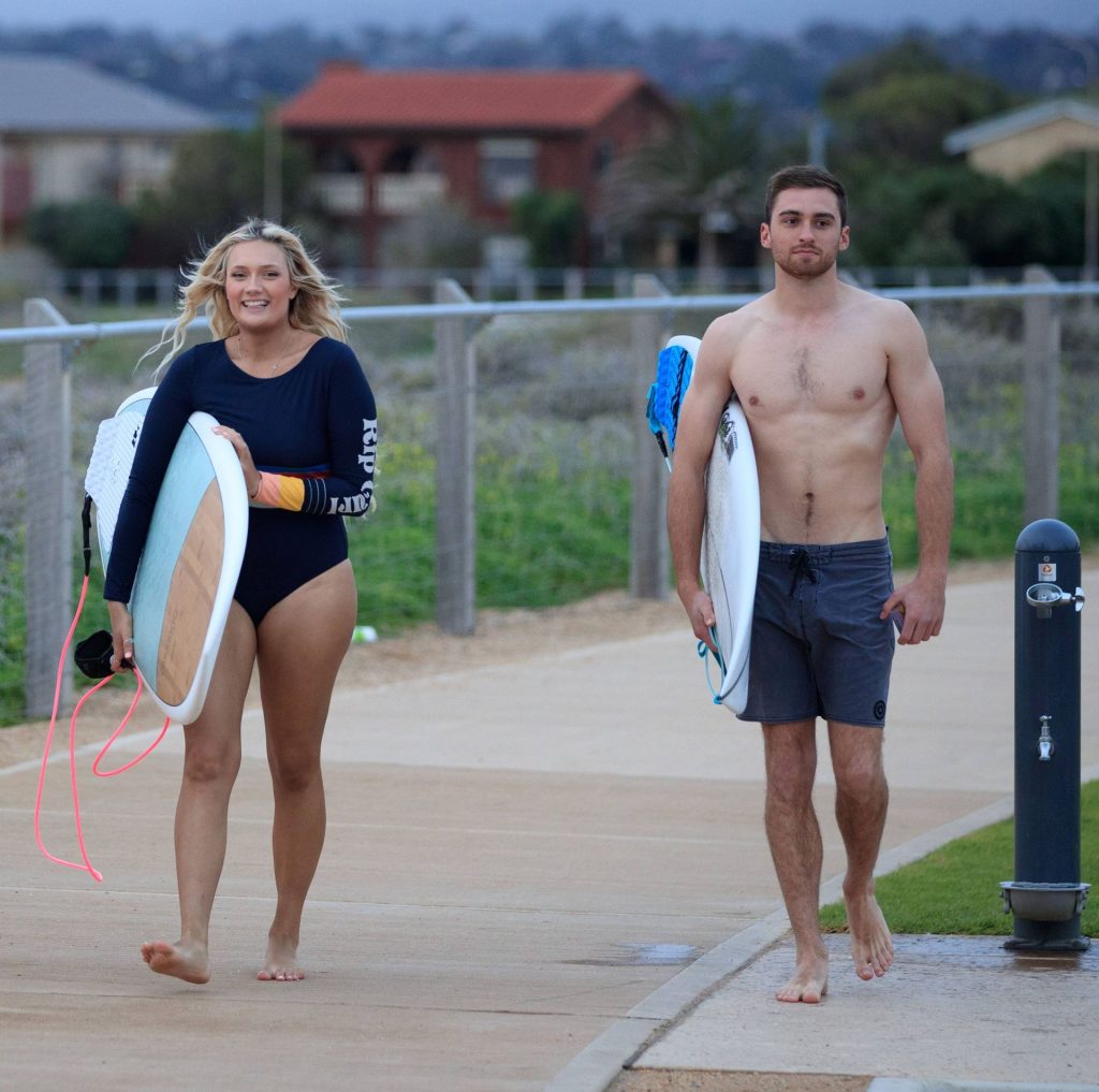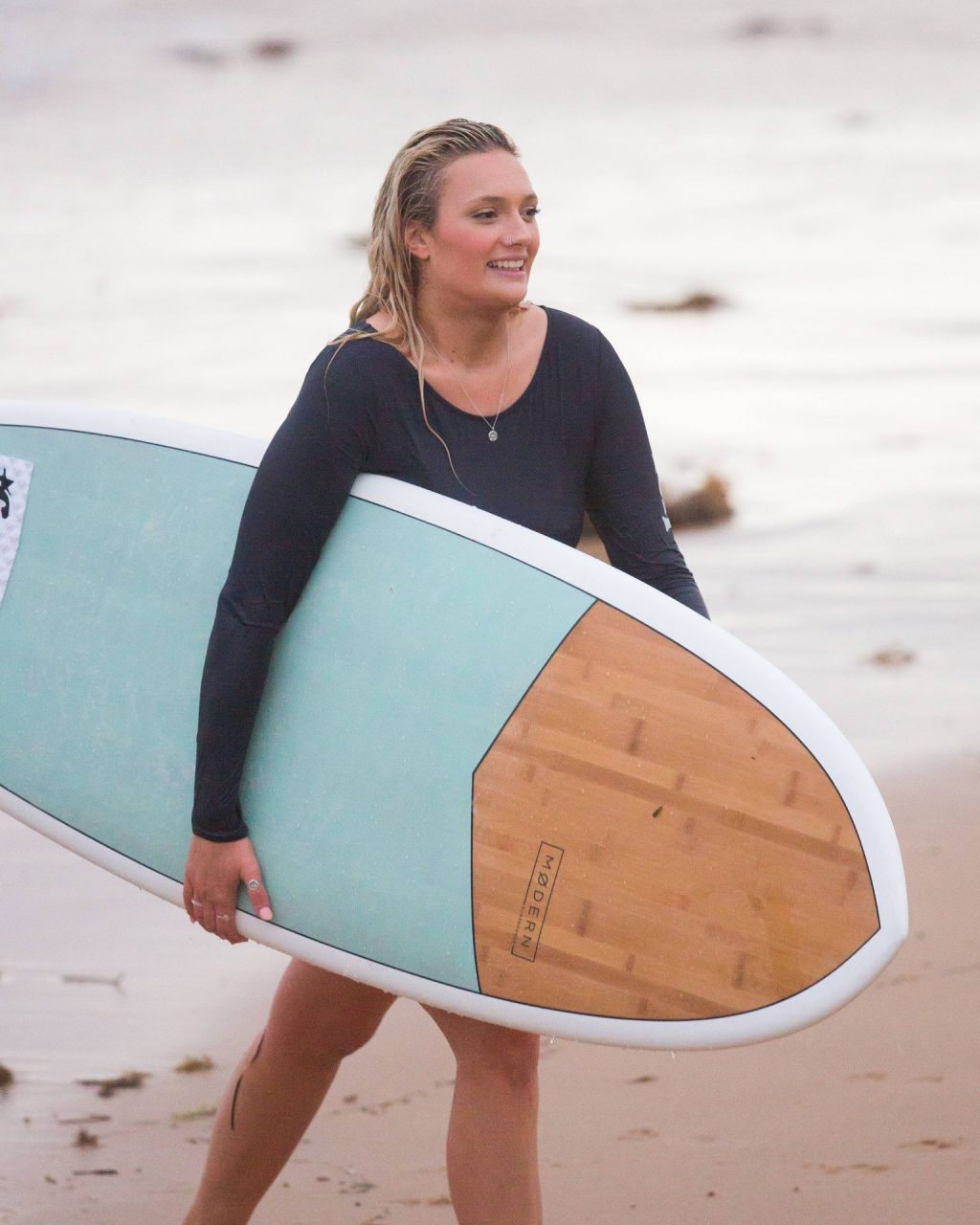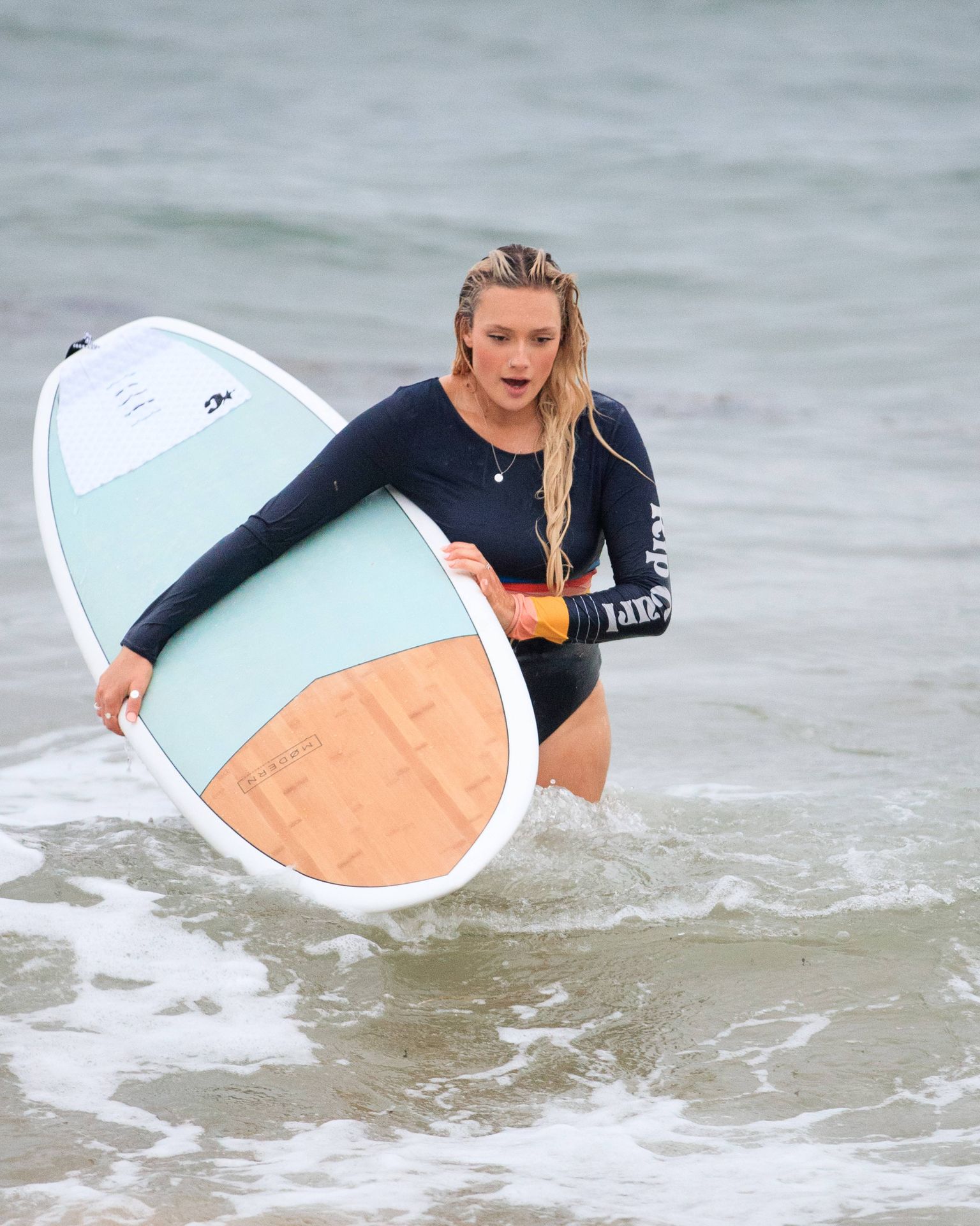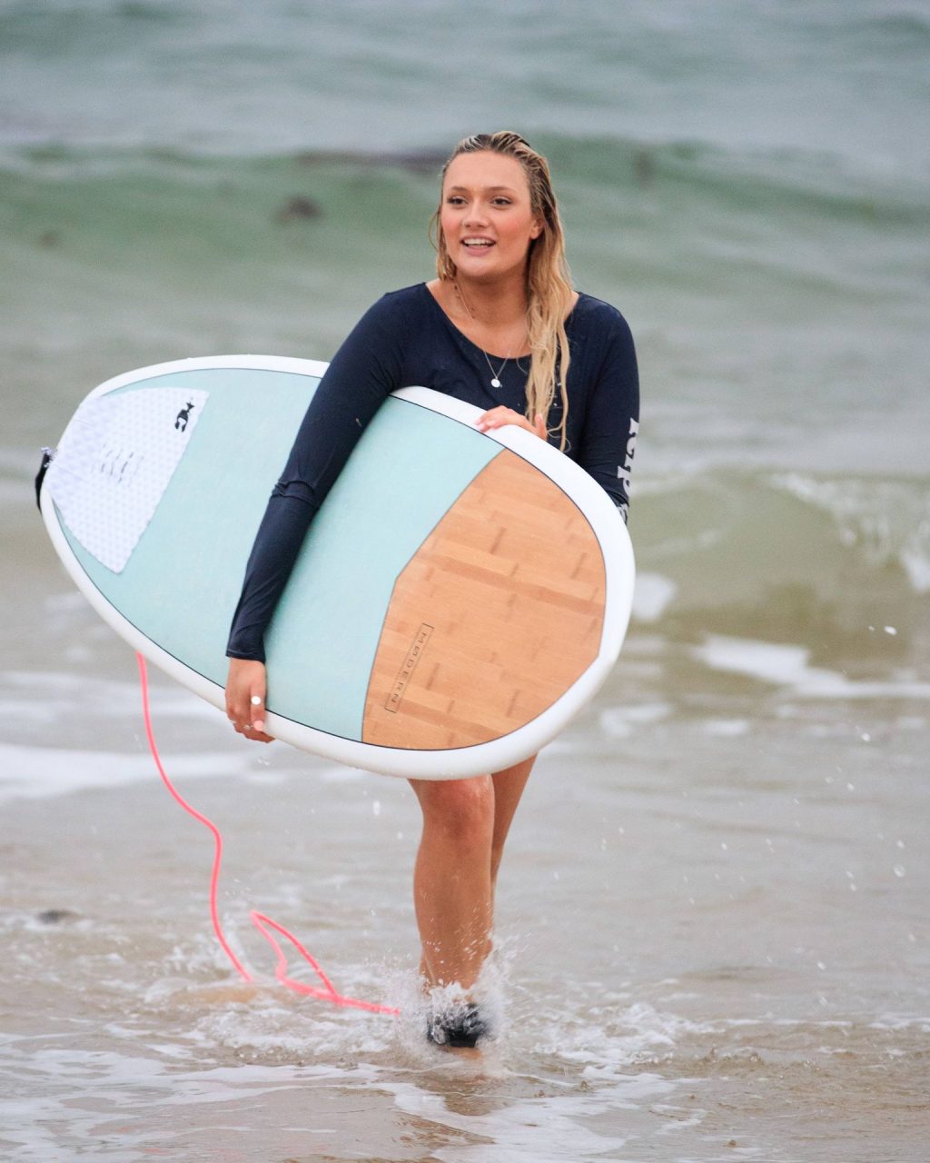 Talia a bravé des conditions plus fraîches à la plage de Southport en arrivant avec un ami et sa petite sœur. Elle était là pour lui apprendre quelques astuces de surf. Talia est arrivée à la plage dans un jeep blanc et en est sortie avec une planche longue sous un bras.
