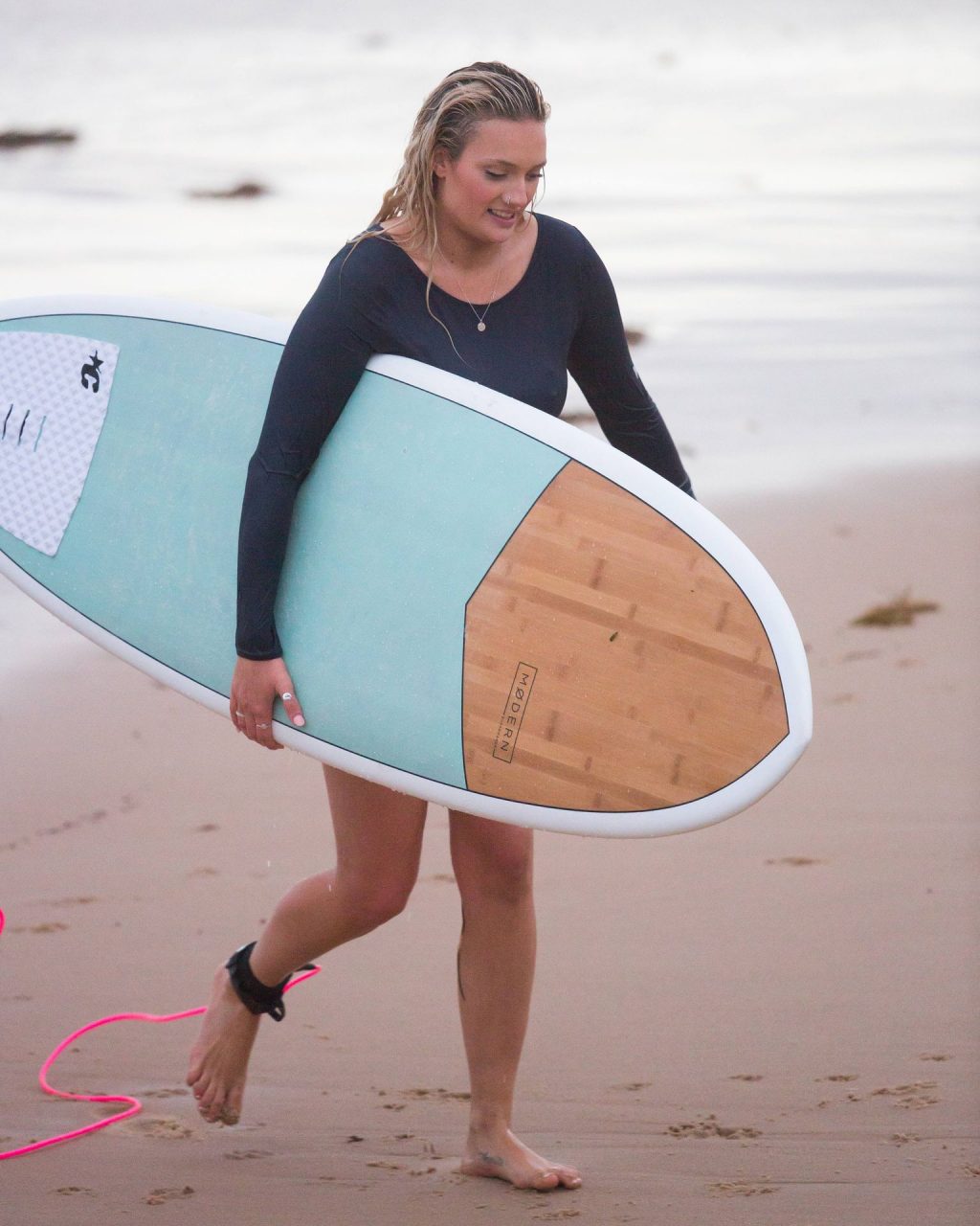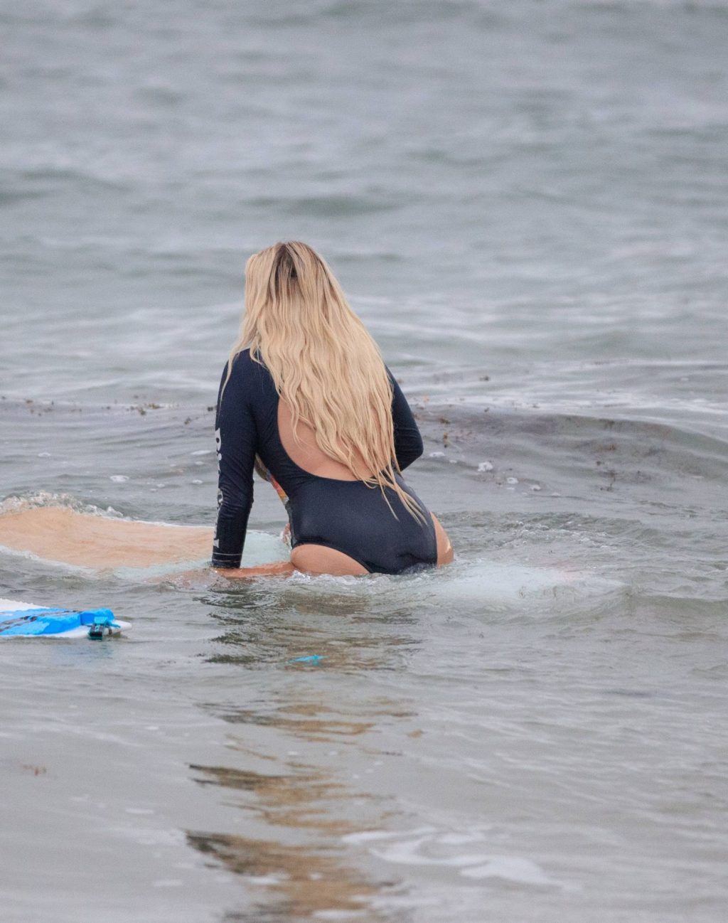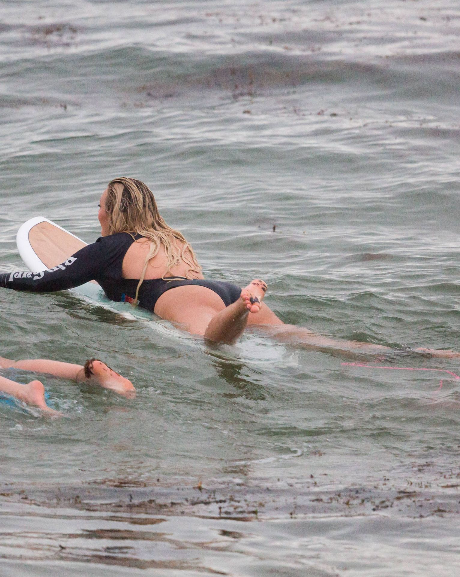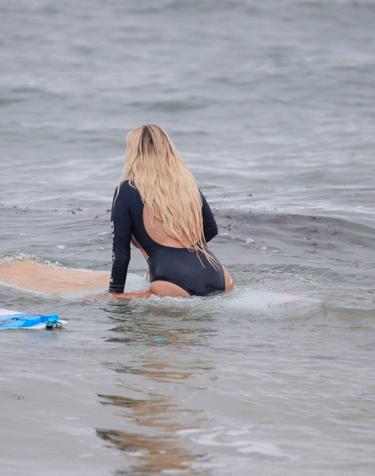 Talia a bravé des conditions plus fraîches à la plage de Southport en arrivant avec un ami et sa petite sœur. Elle était là pour lui apprendre quelques astuces de surf. Talia est arrivée à la plage dans un jeep blanc et en est sortie avec une planche longue sous un bras.