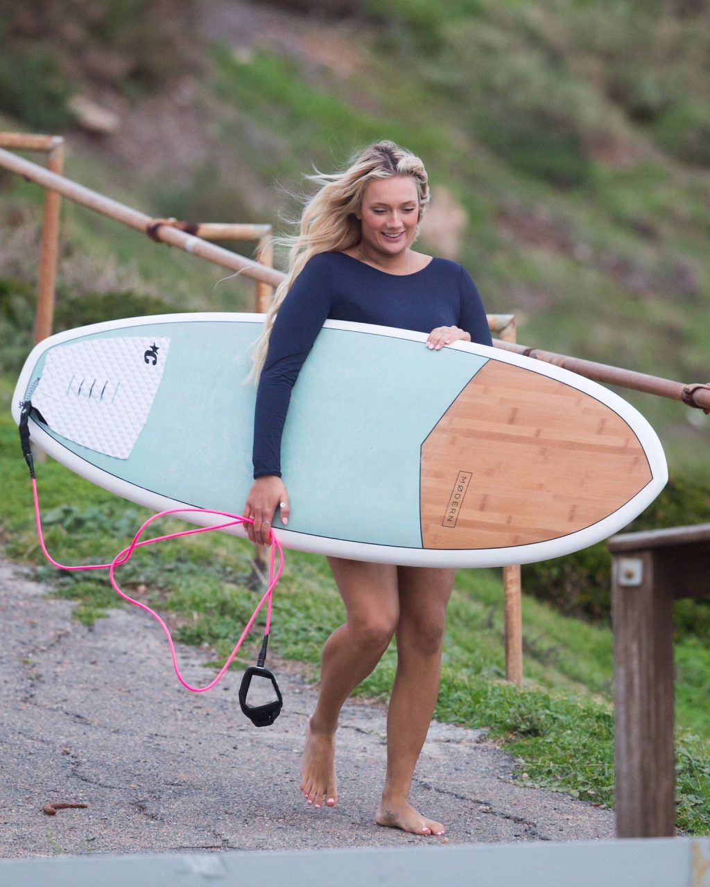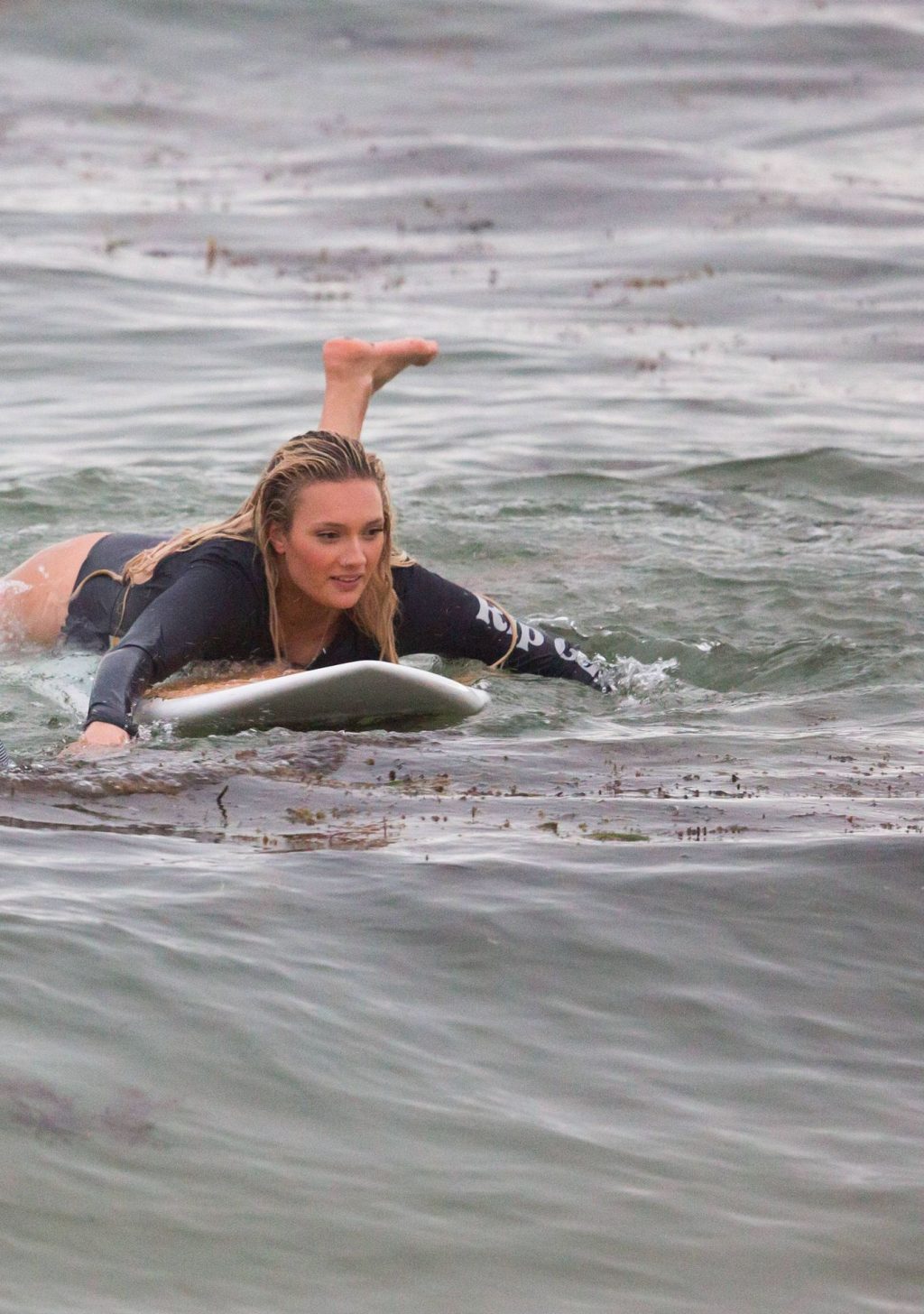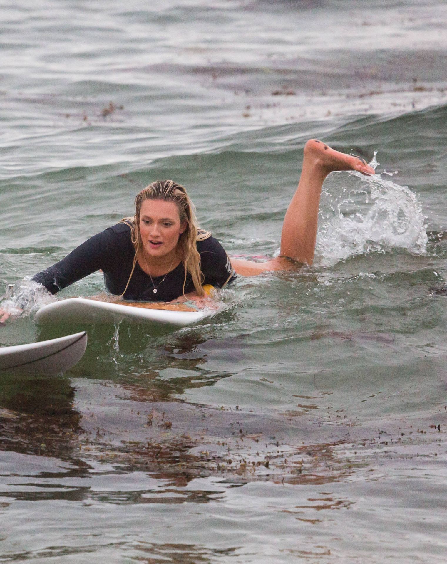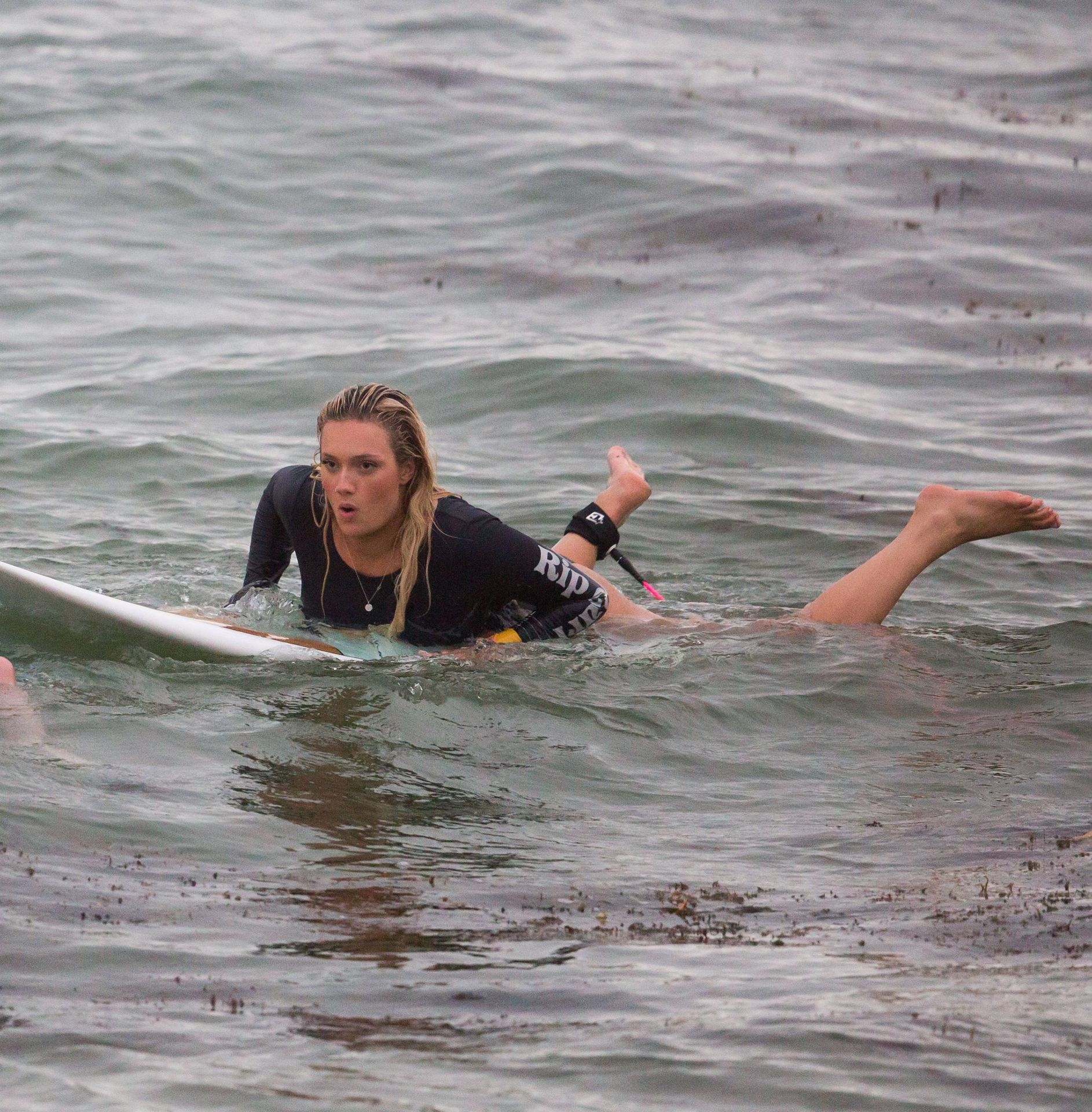 Talia a bravé des conditions plus fraîches à la plage de Southport en arrivant avec un ami et sa petite sœur. Elle était là pour lui apprendre quelques astuces de surf. Talia est arrivée à la plage dans un jeep blanc et en est sortie avec une planche longue sous un bras.
