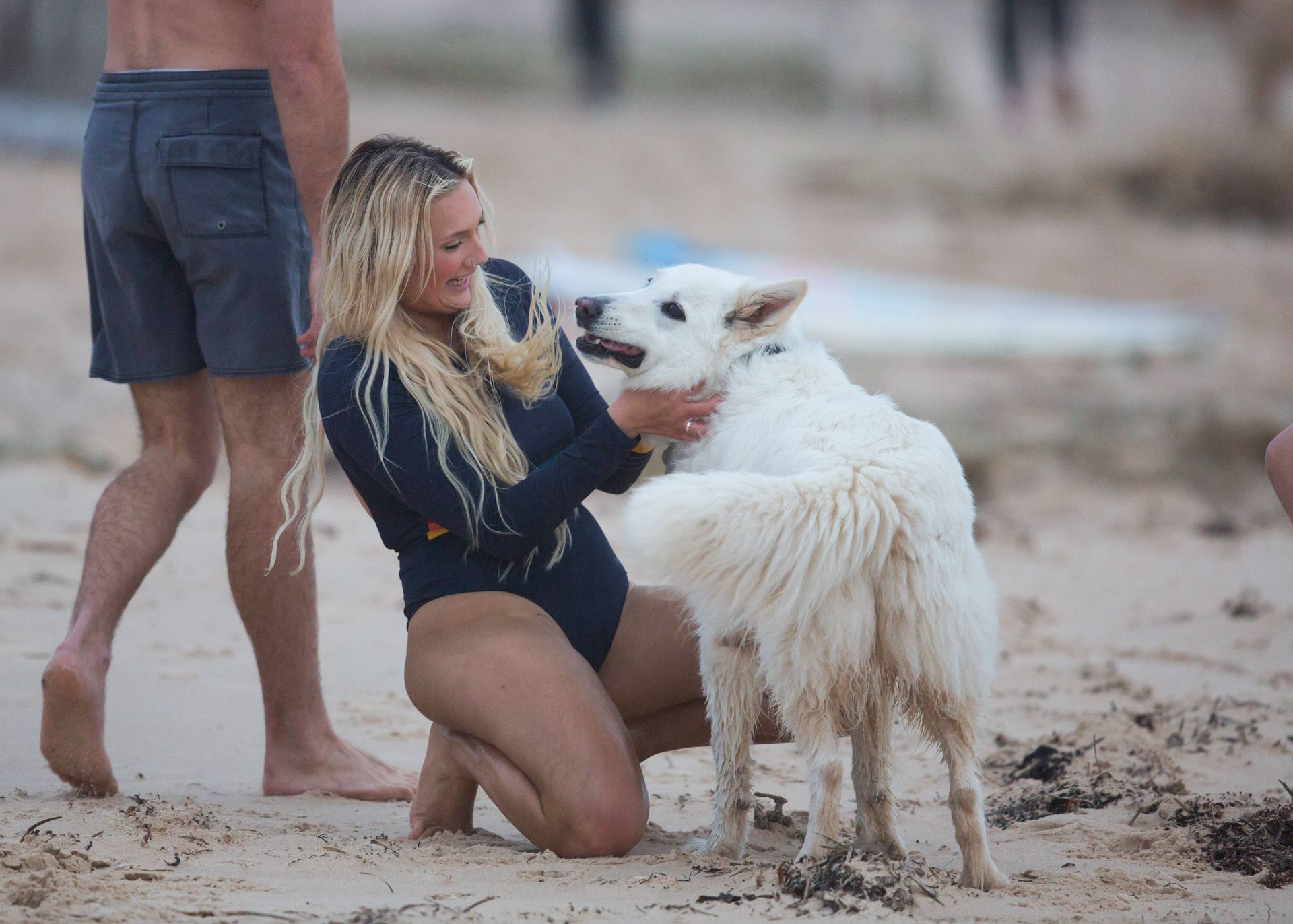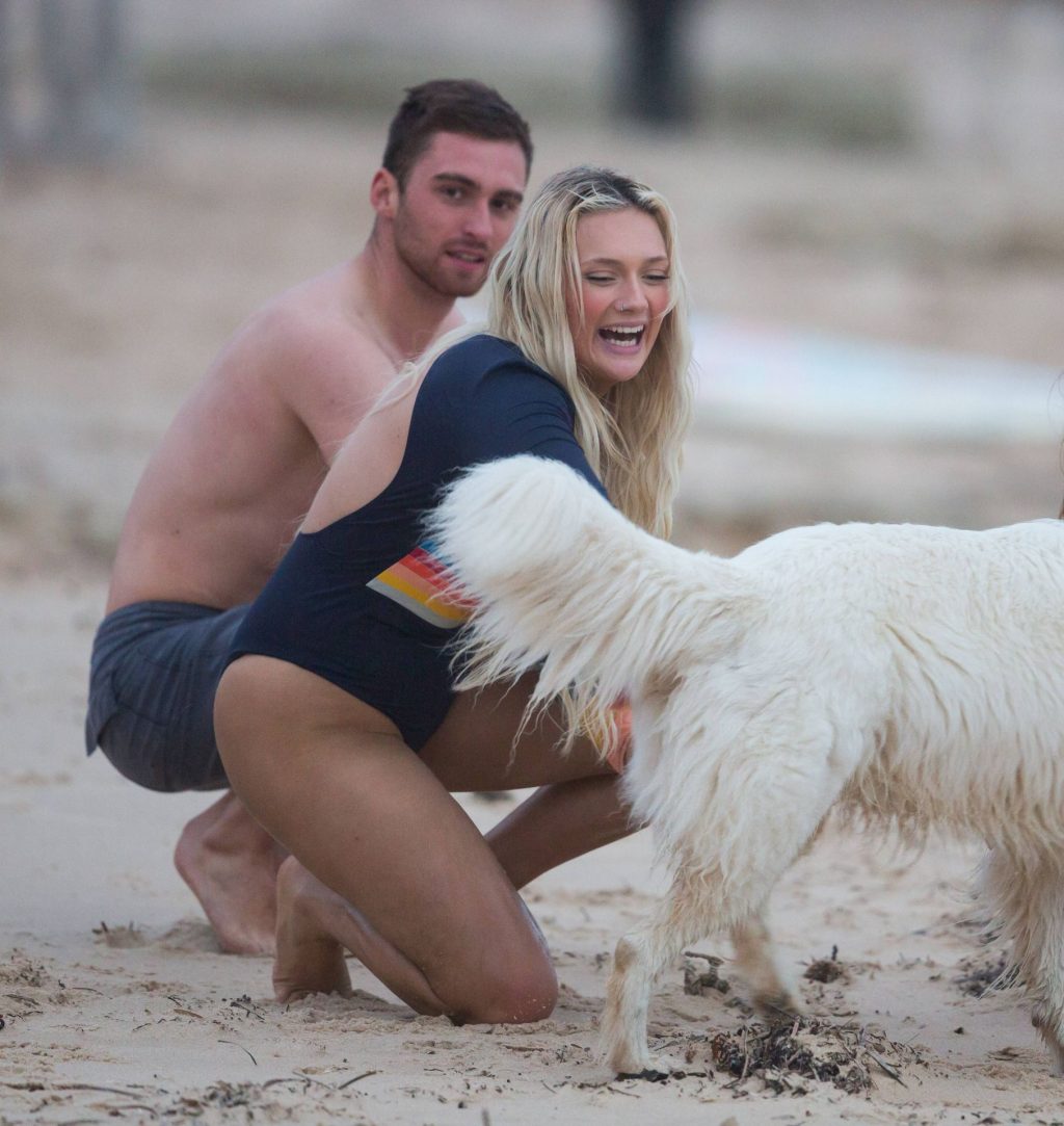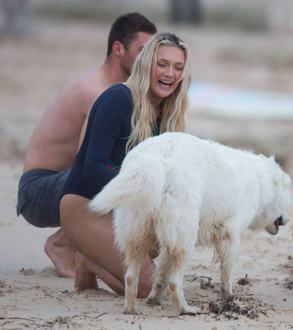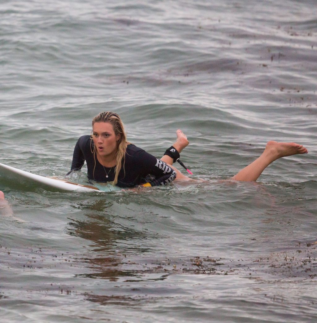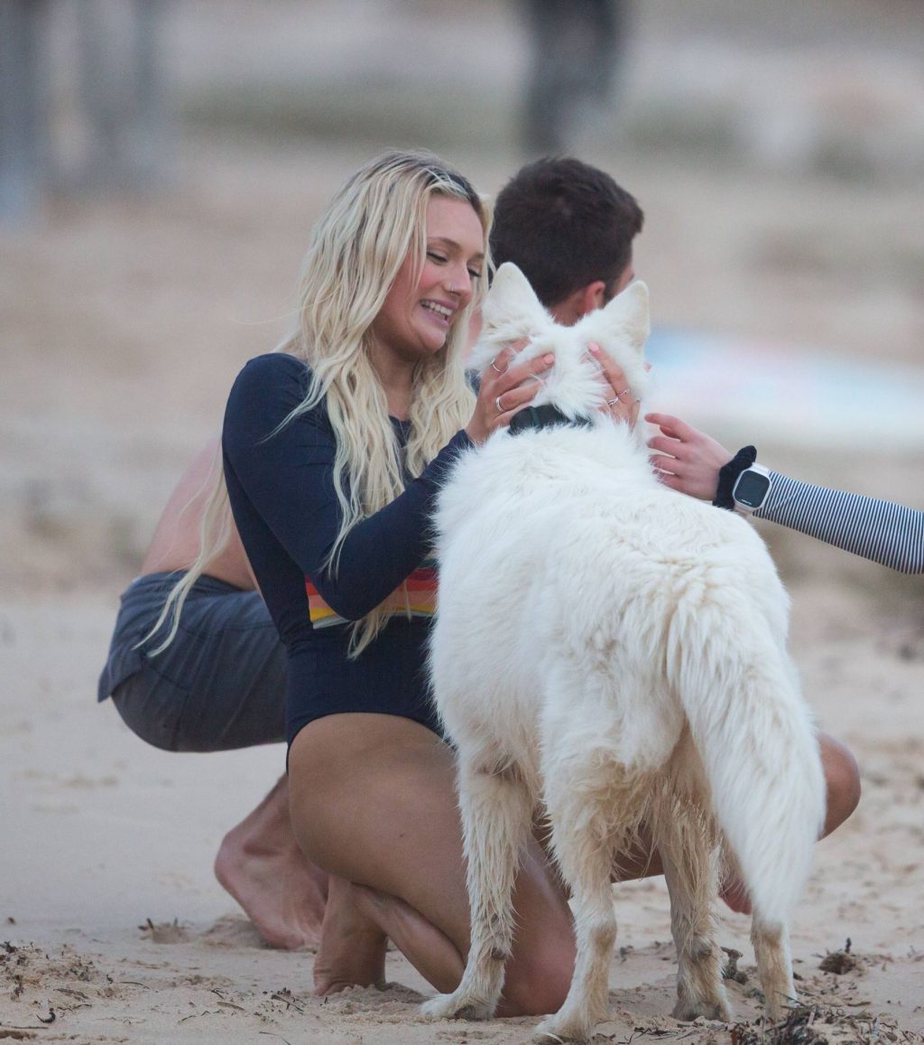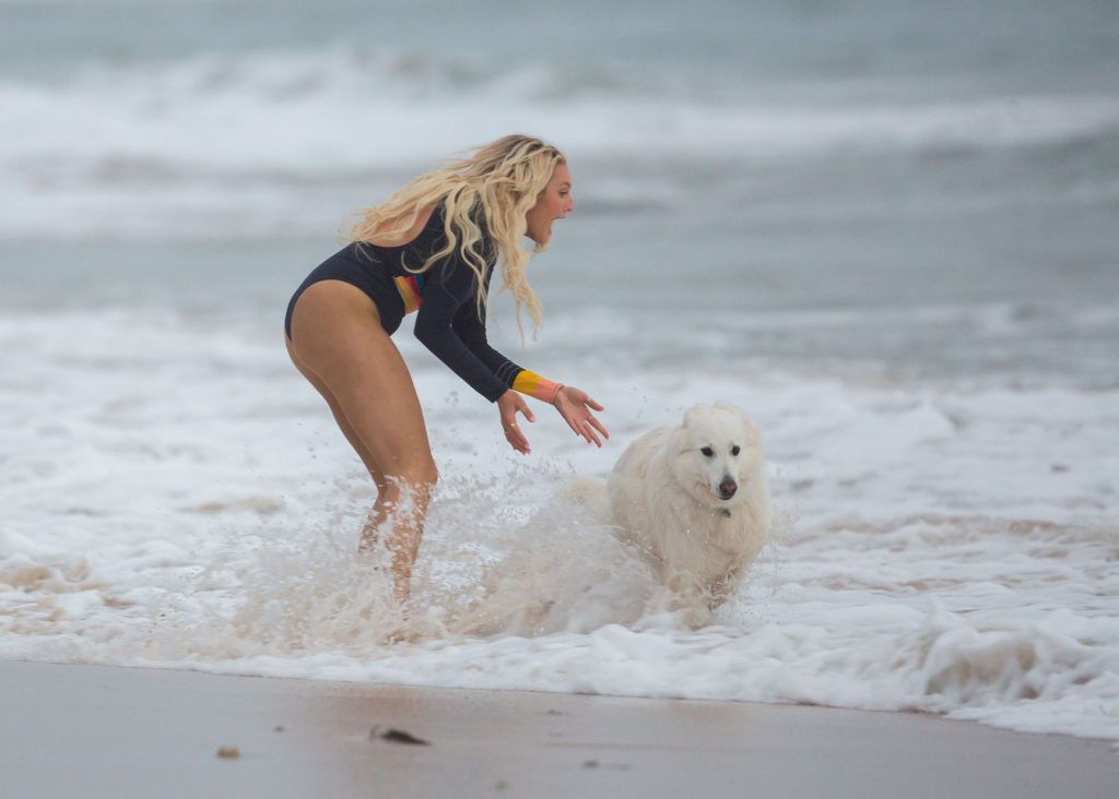 Talia a amené le chien de sa famille à la plage pour l’occasion et semblait s’amuser à courir avec le chien avant de se baigner dans l’océan. Les vagues n’étaient pas particulièrement grandes ce jour-là, alors Talia est sortie de l’eau et a décidé d’essayer un autre jour.