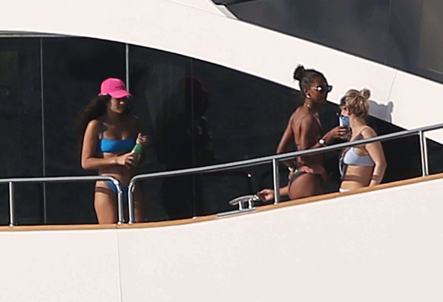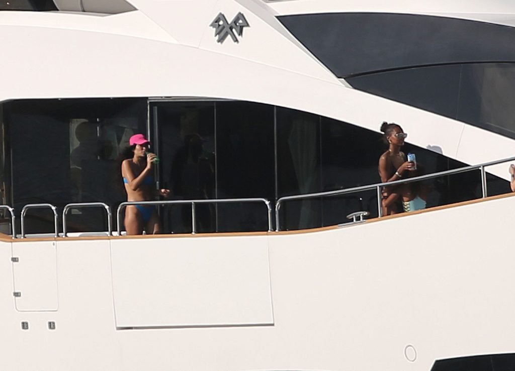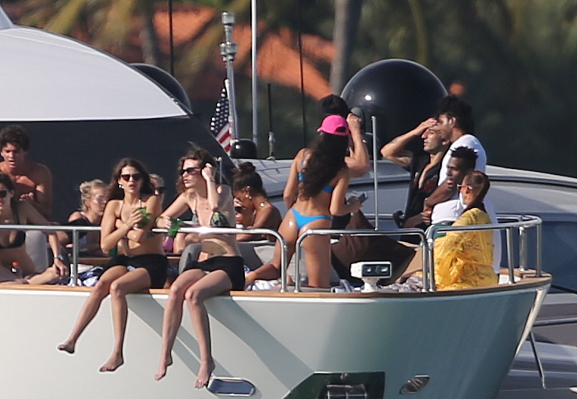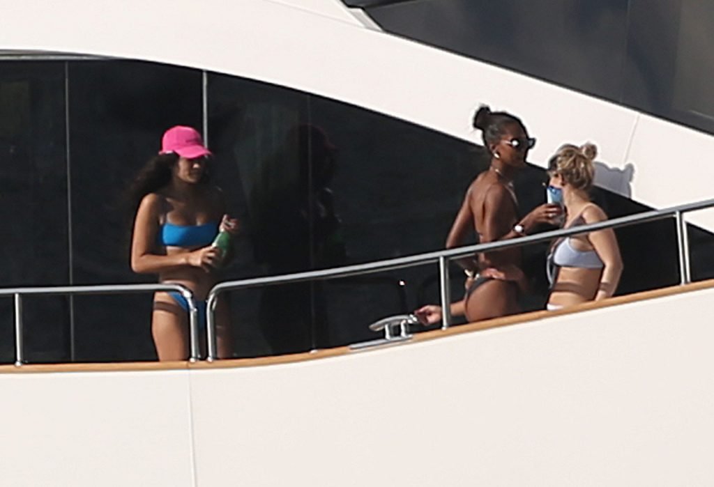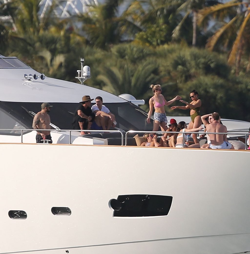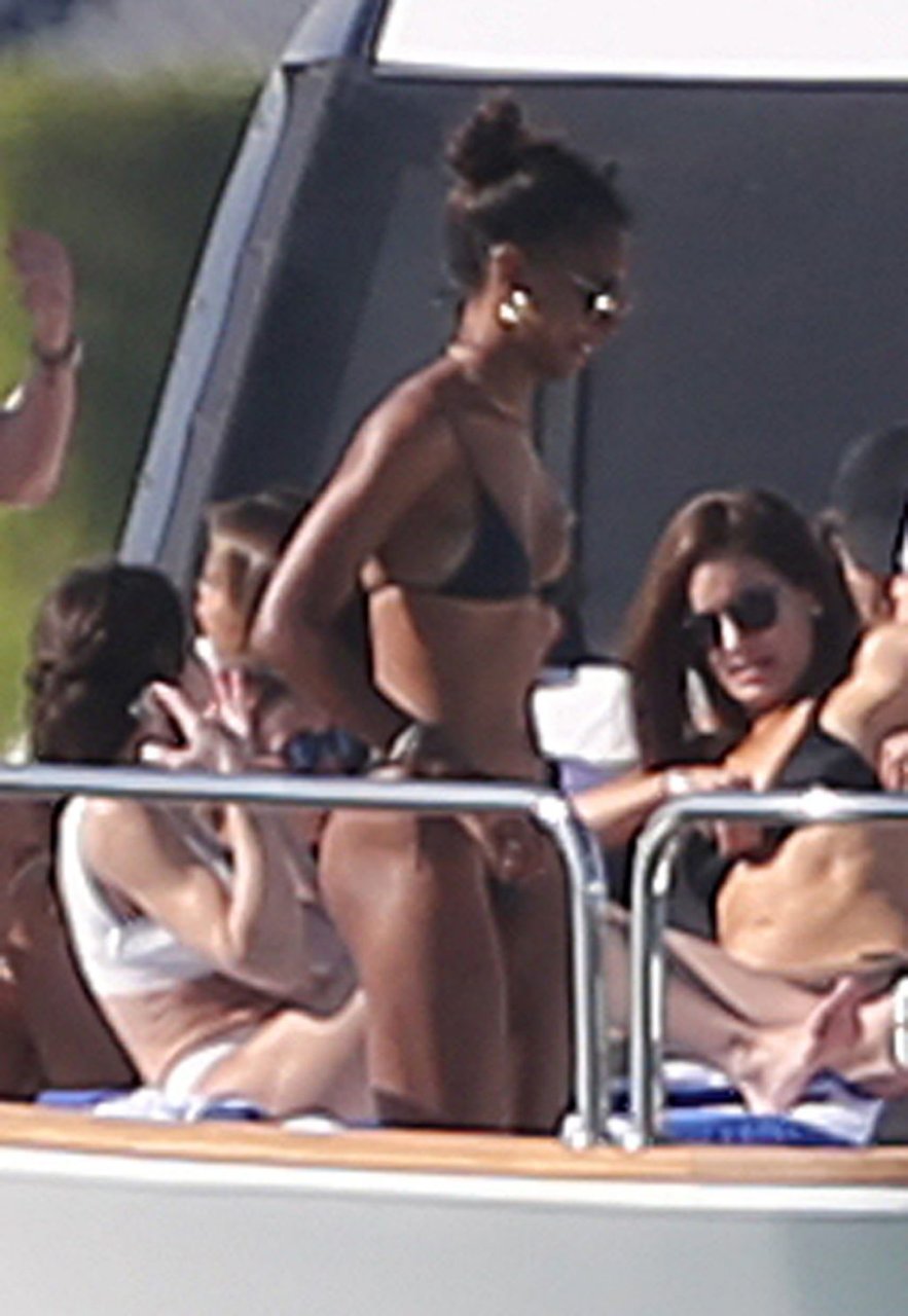 Les mannequins Jasmine Tookes (en bikini noir) et Shanina Shaik (en bikini bleu) célèbrent l’anniversaire de Jasmine sur un yacht à Miami, 01/02/2019.