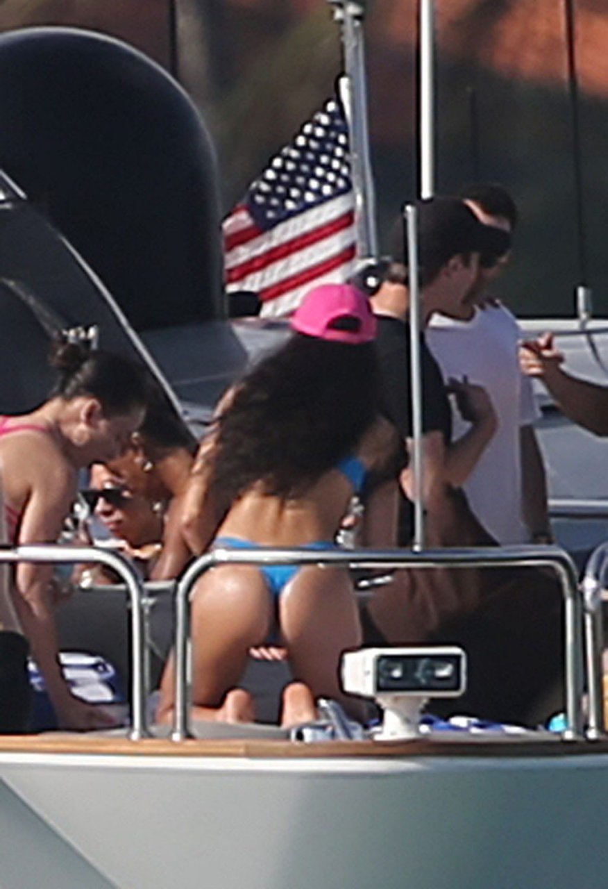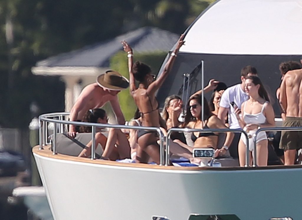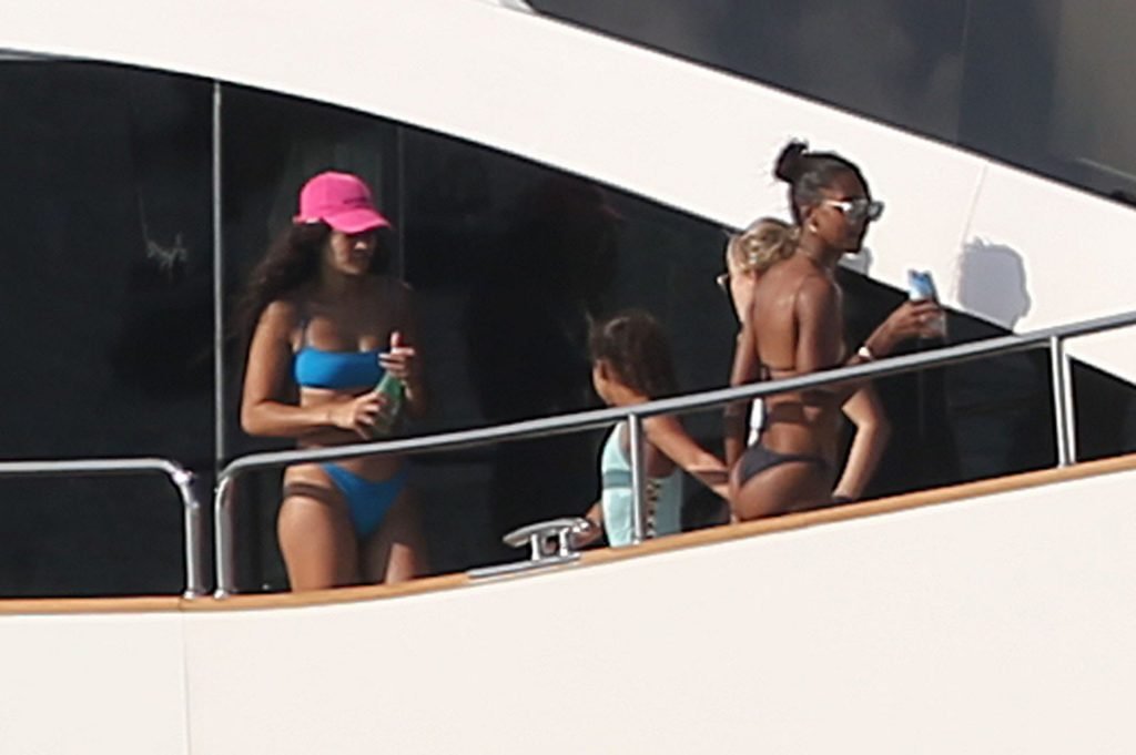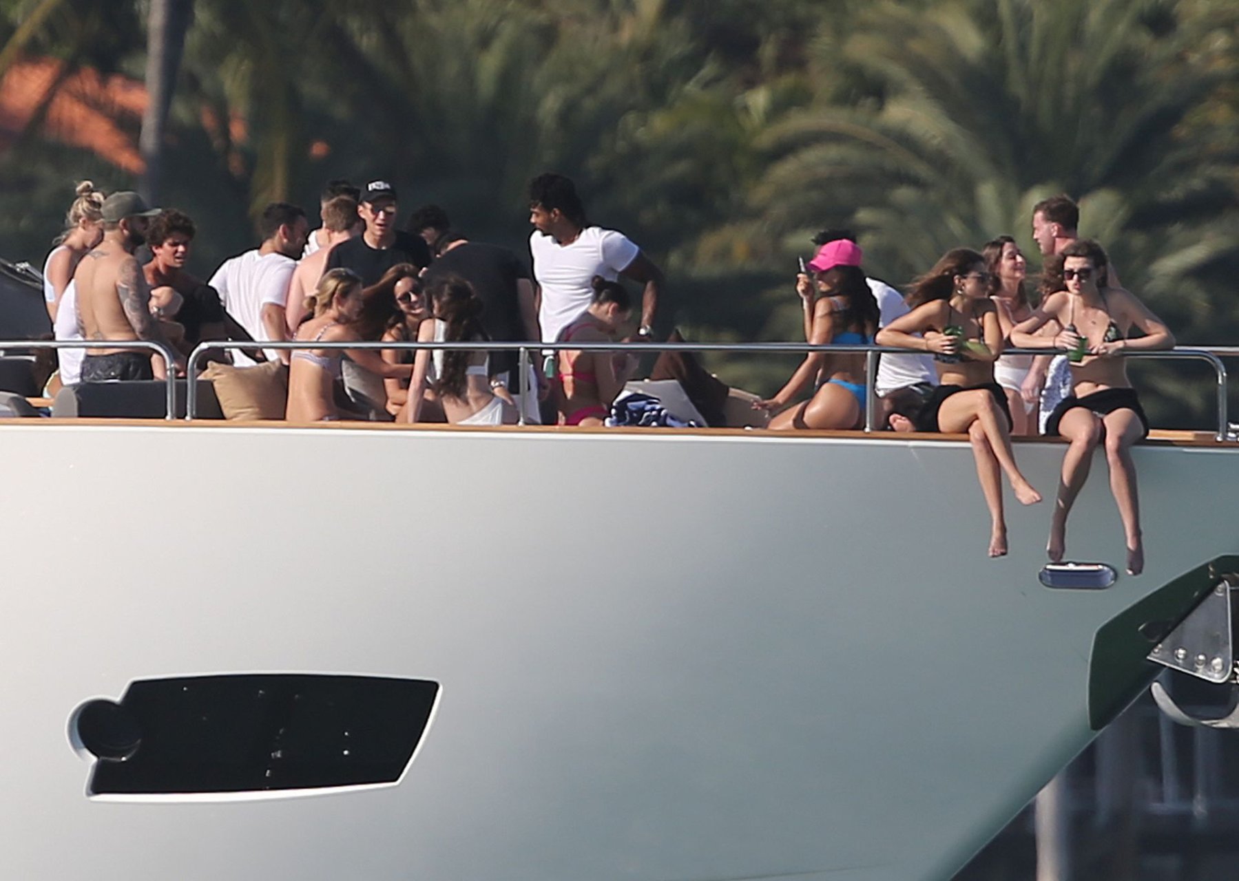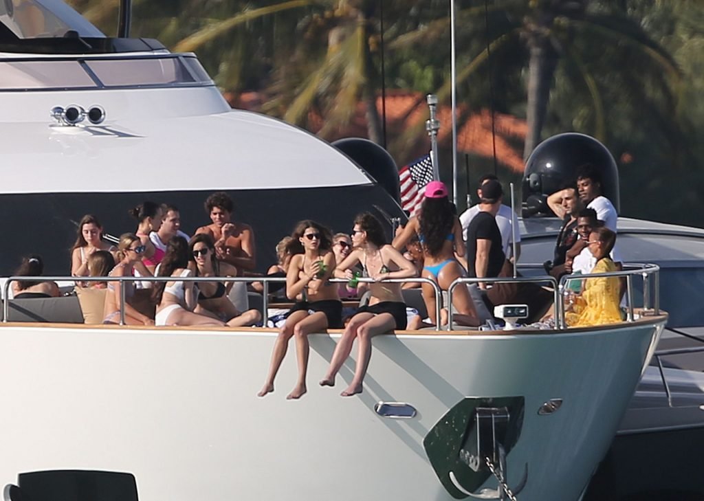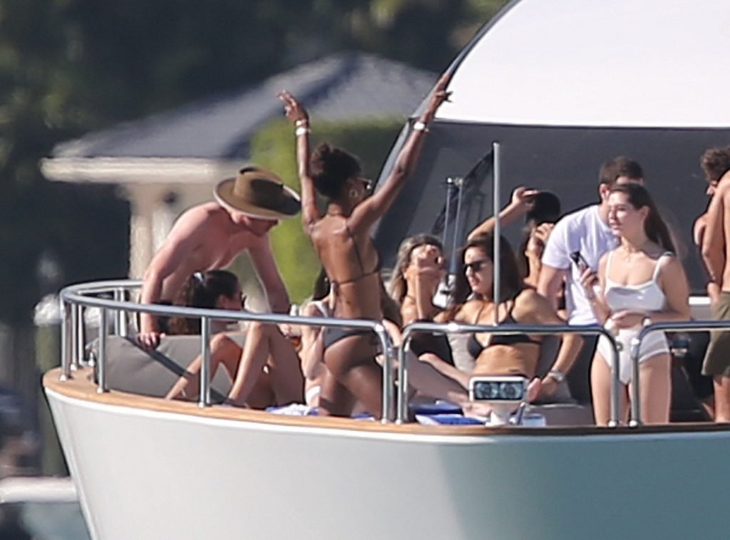 Les mannequins Jasmine Tookes (en bikini noir) et Shanina Shaik (en bikini bleu) célèbrent l’anniversaire de Jasmine sur un yacht à Miami, 01/02/2019.