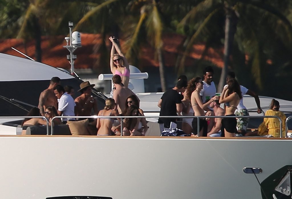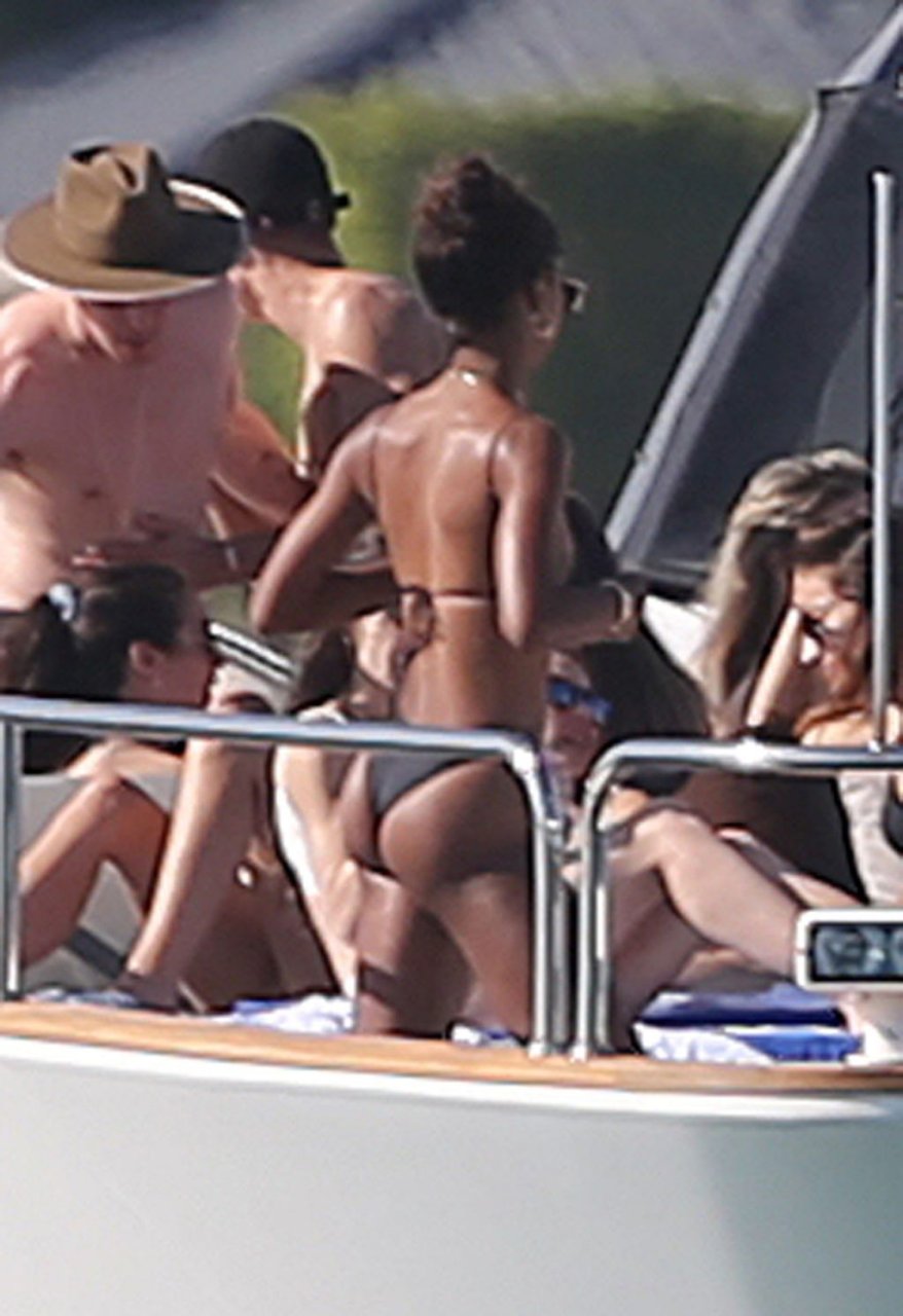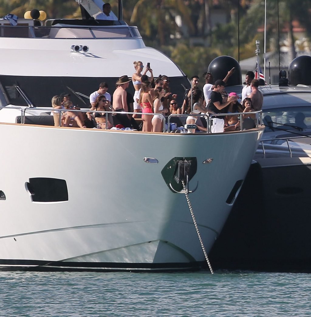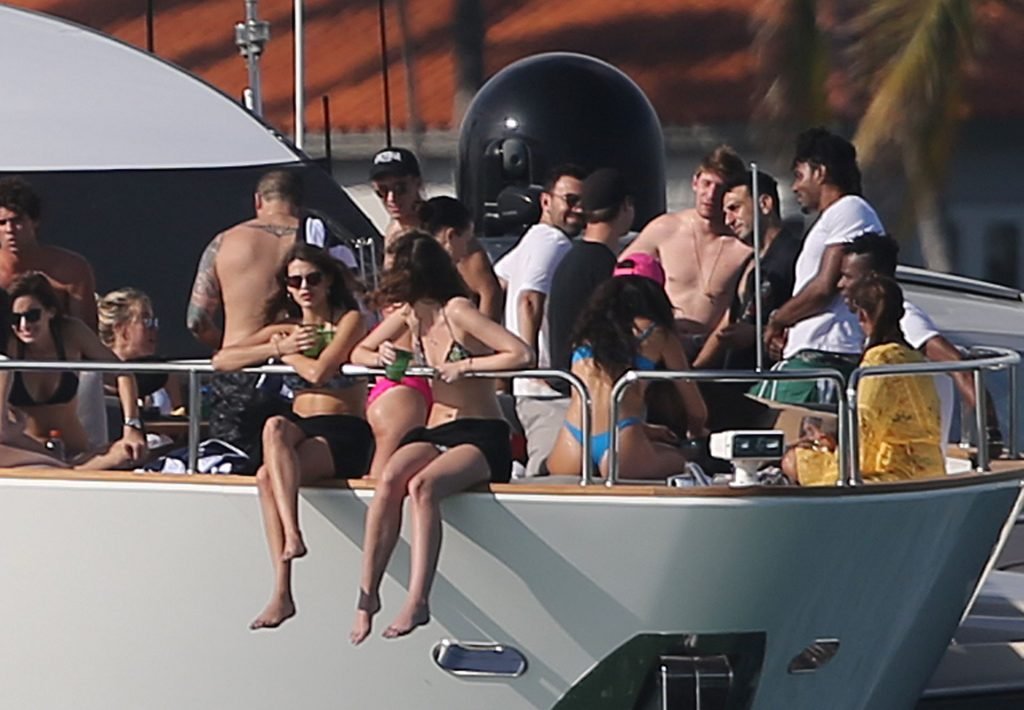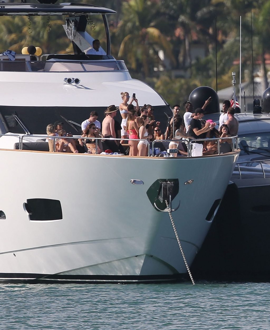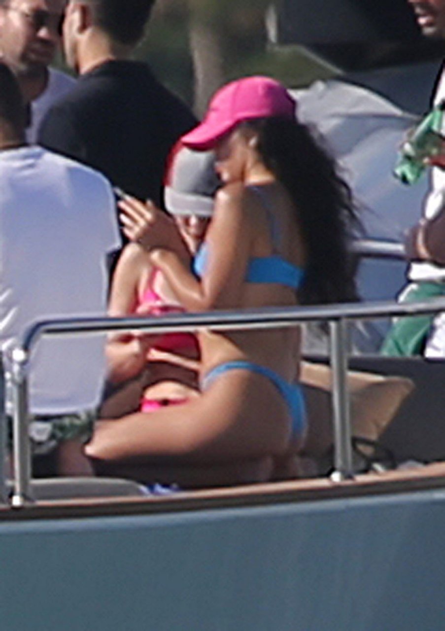 Les mannequins Jasmine Tookes (en bikini noir) et Shanina Shaik (en bikini bleu) célèbrent l’anniversaire de Jasmine sur un yacht à Miami, 01/02/2019.
