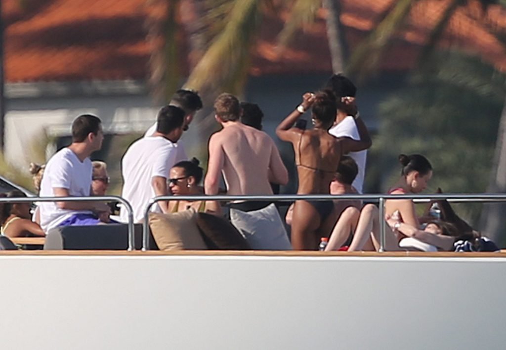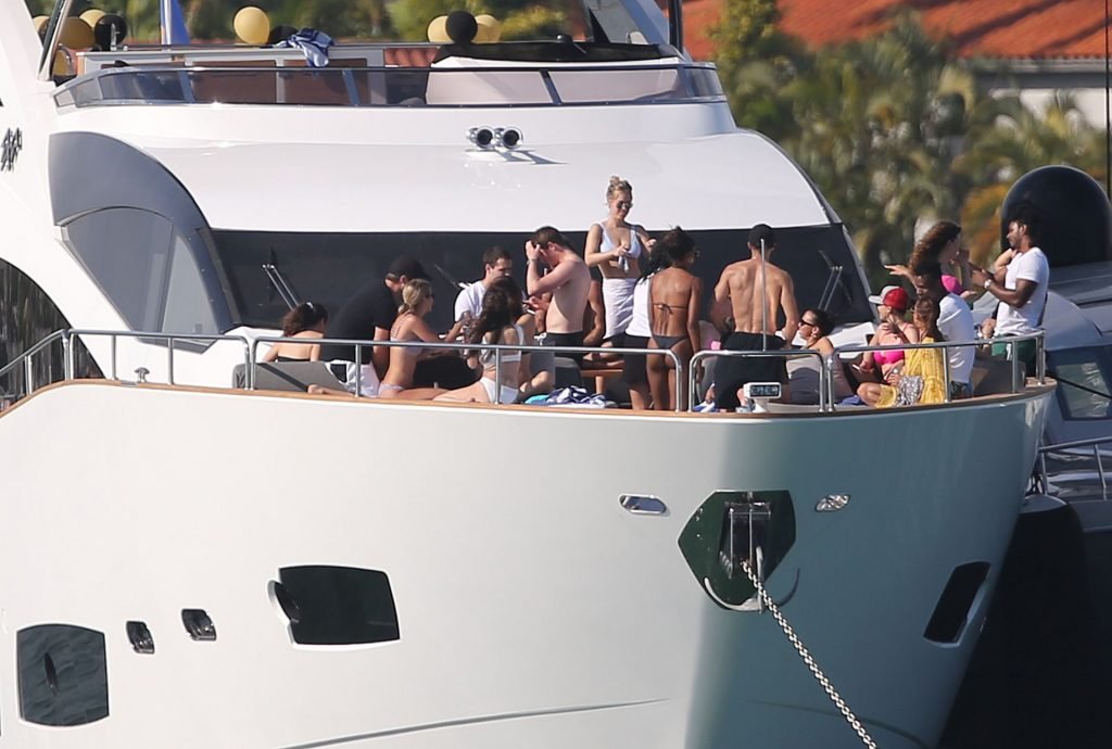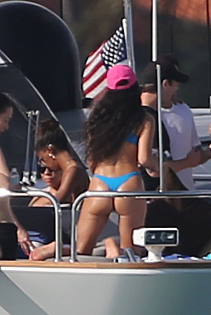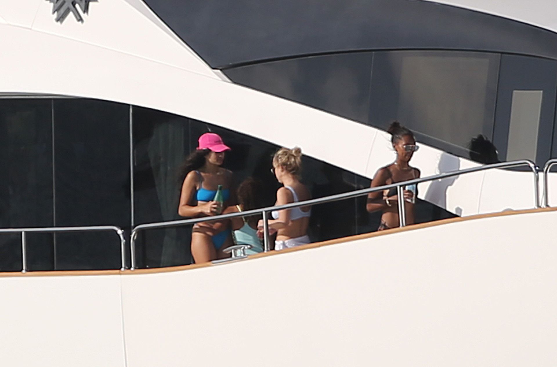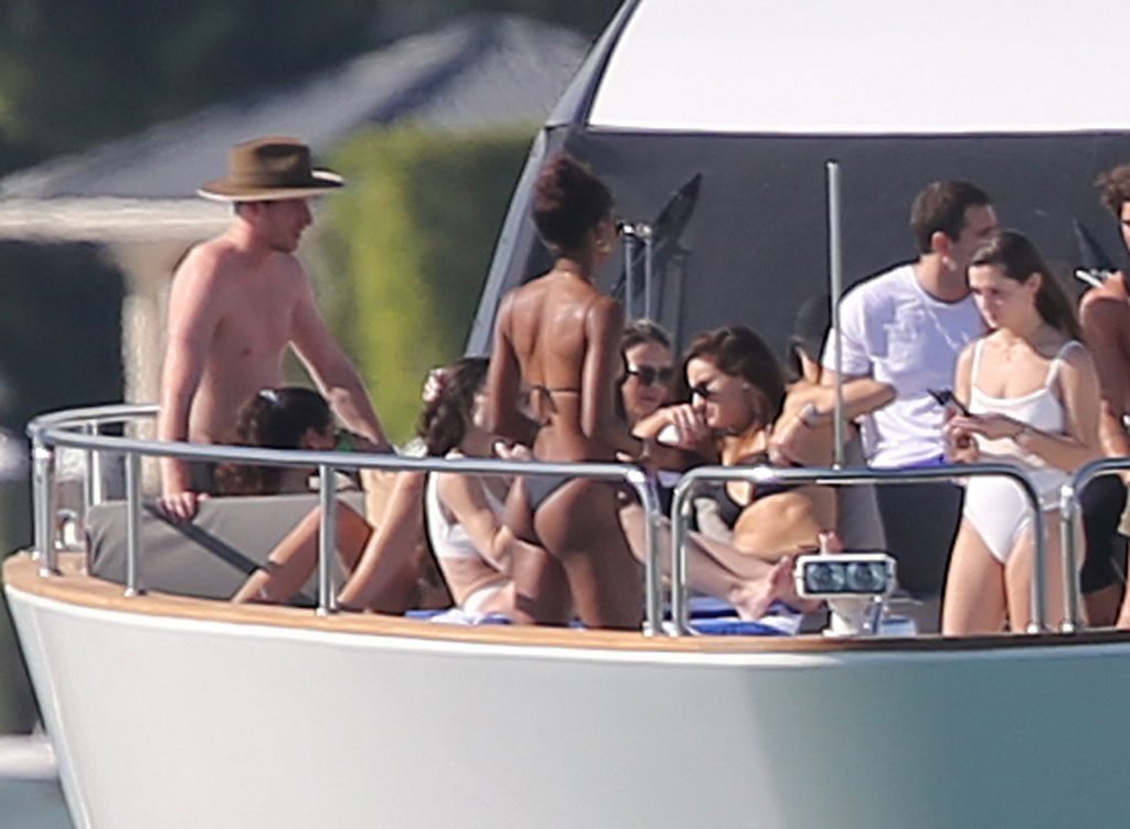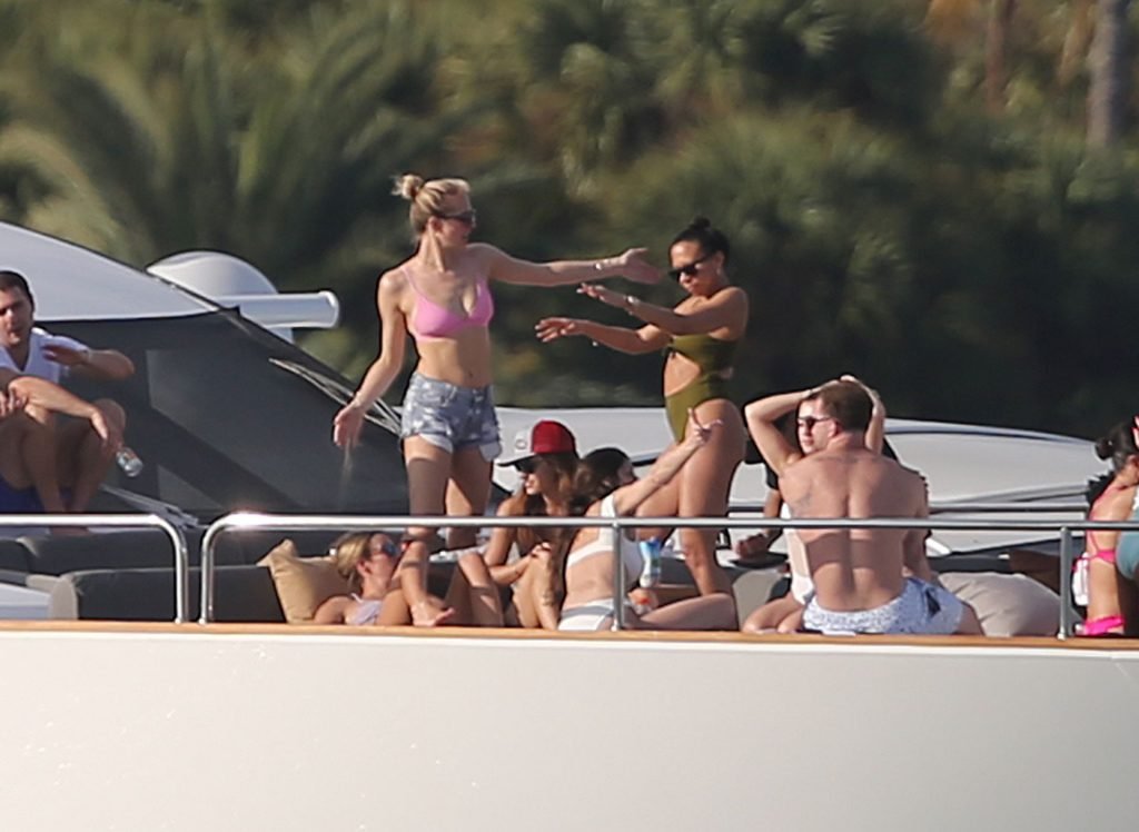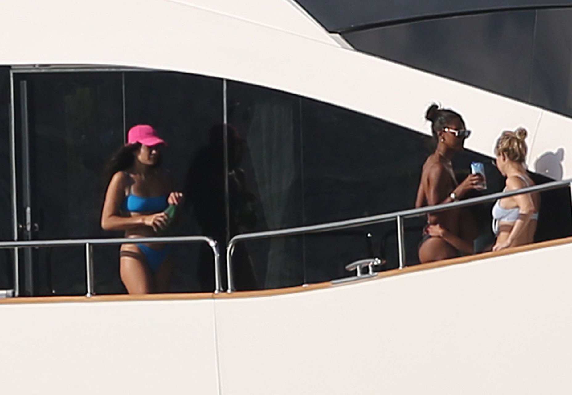 Les mannequins Jasmine Tookes (en bikini noir) et Shanina Shaik (en bikini bleu) célèbrent l’anniversaire de Jasmine sur un yacht à Miami, 01/02/2019.