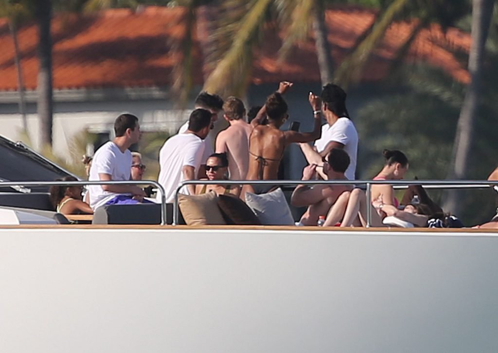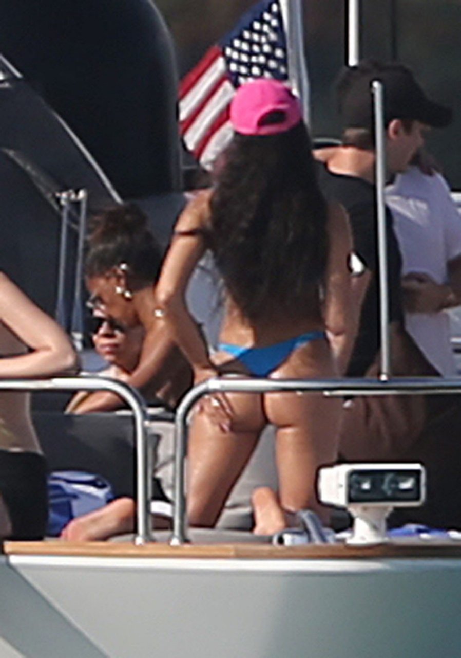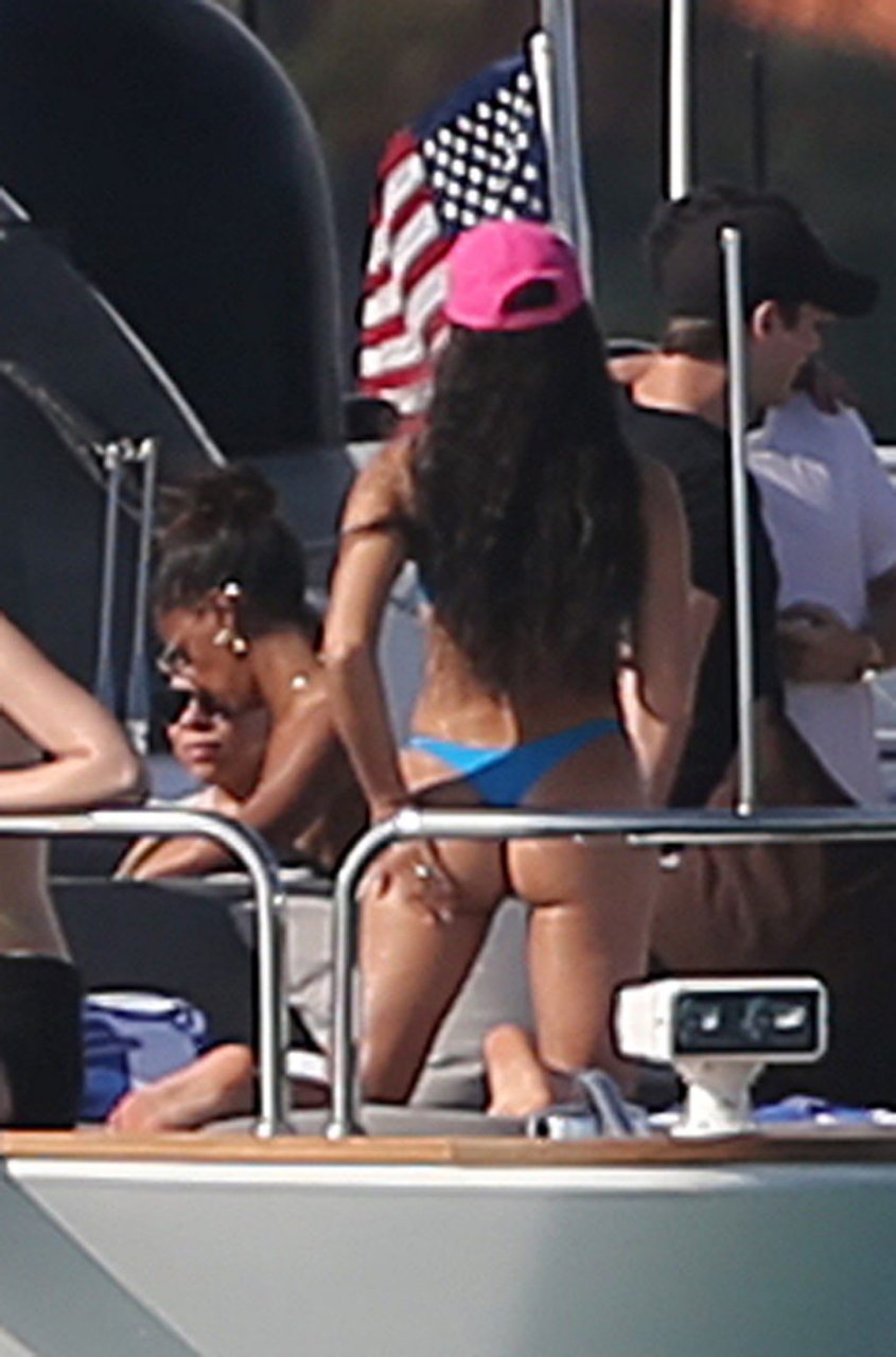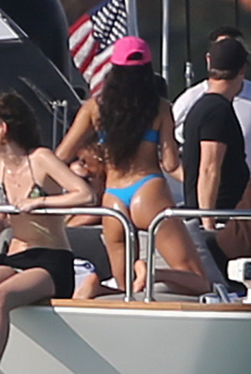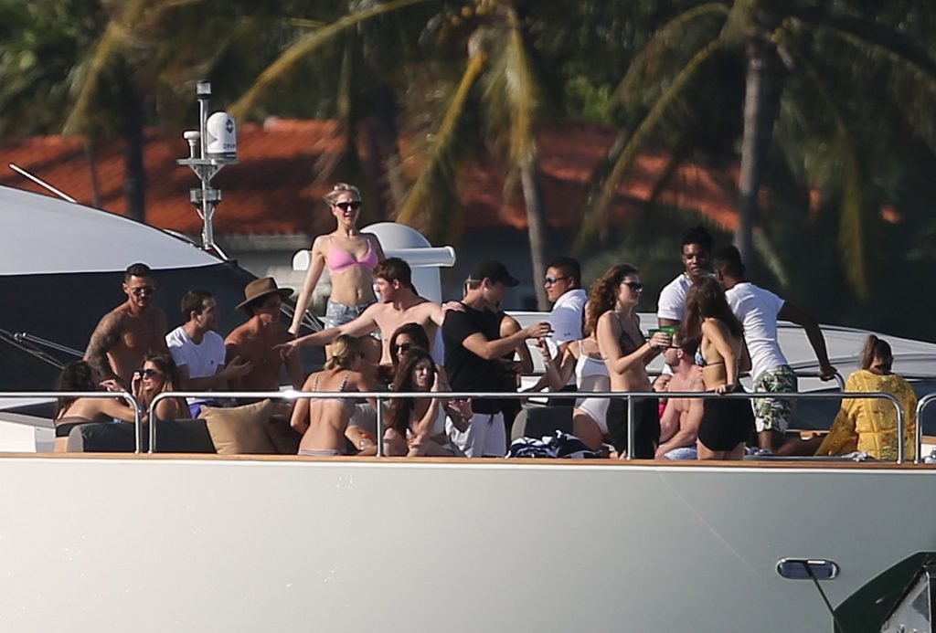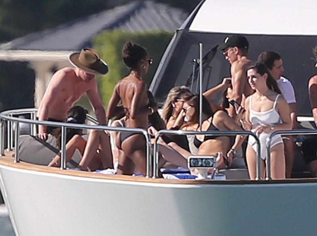 Les mannequins Jasmine Tookes (en bikini noir) et Shanina Shaik (en bikini bleu) célèbrent l’anniversaire de Jasmine sur un yacht à Miami, 01/02/2019.
