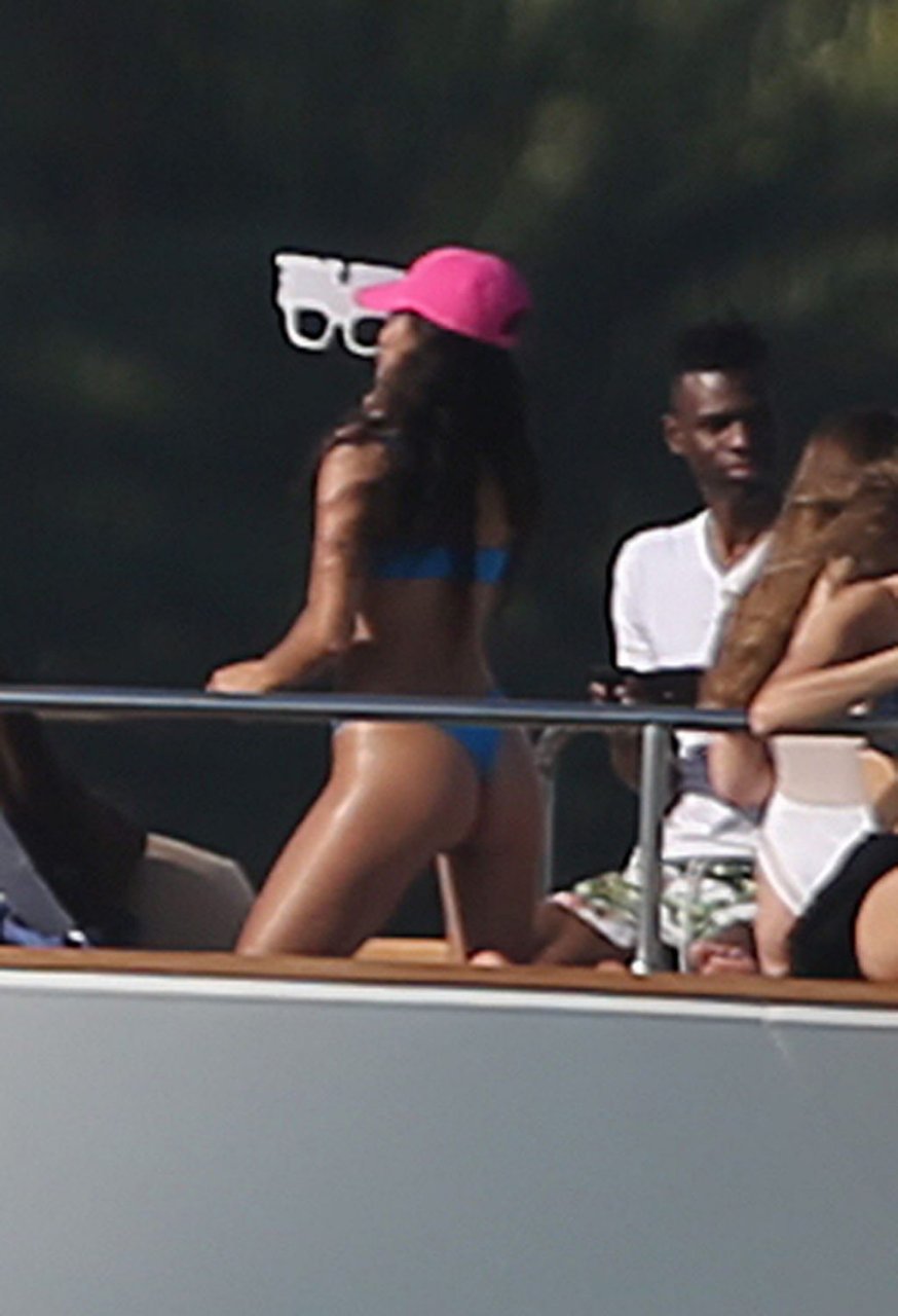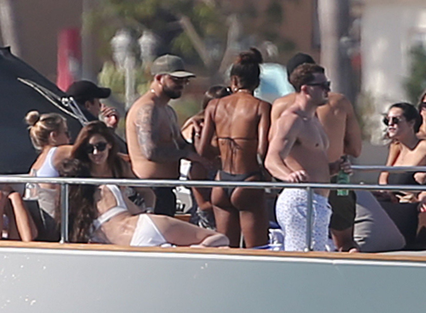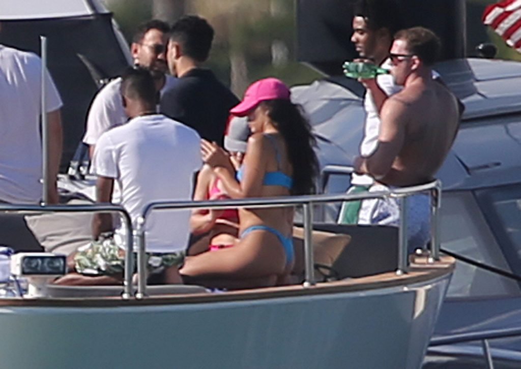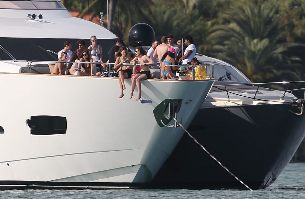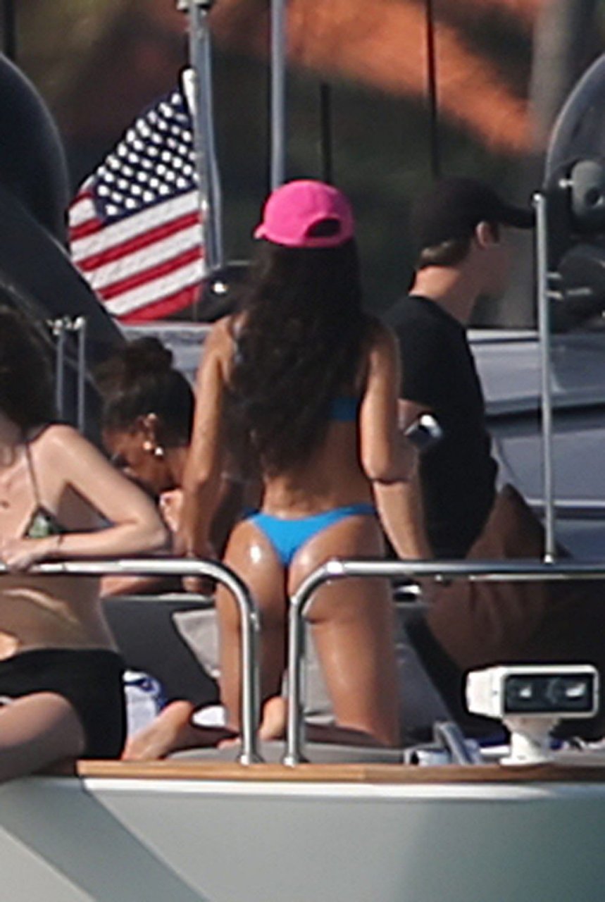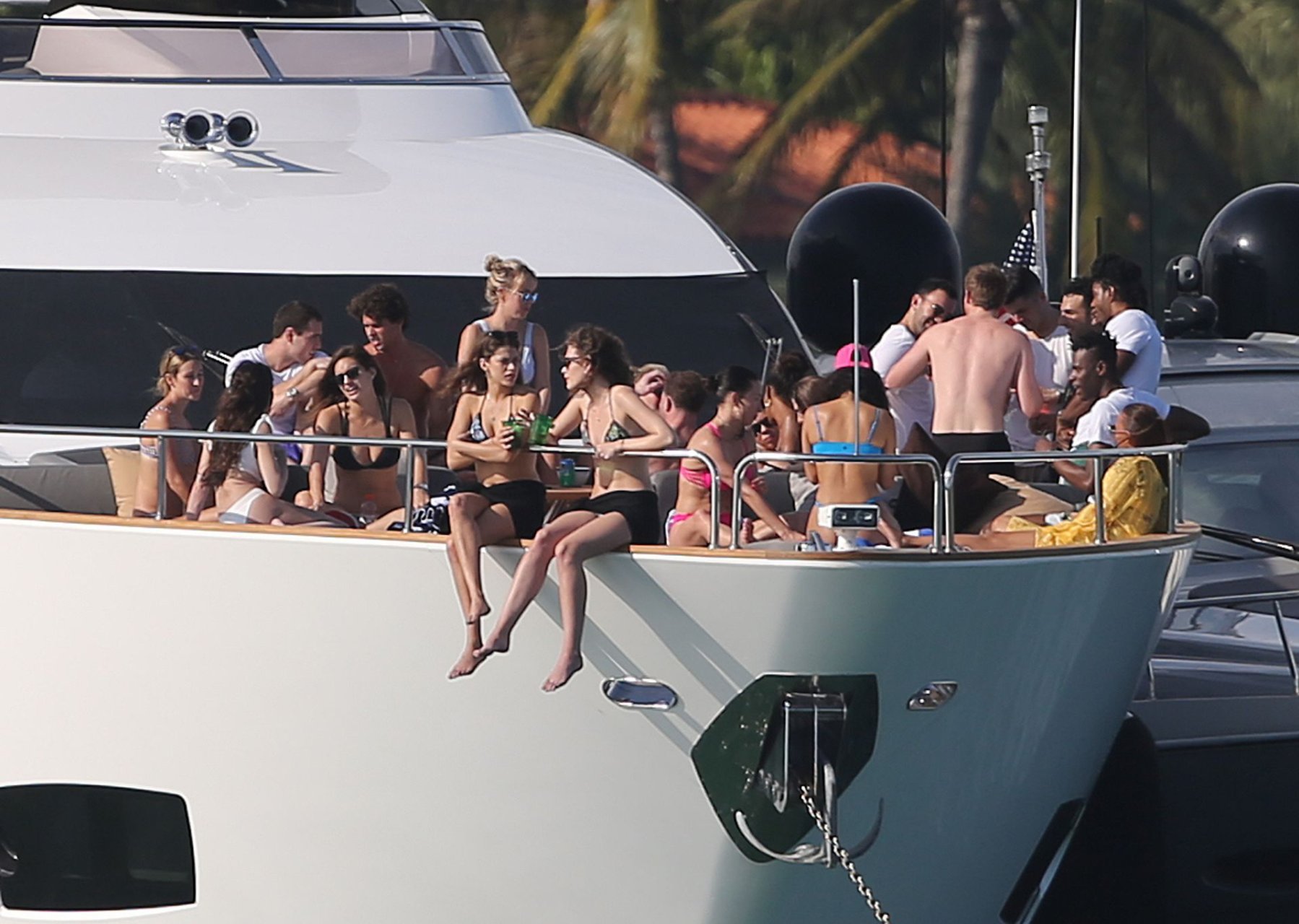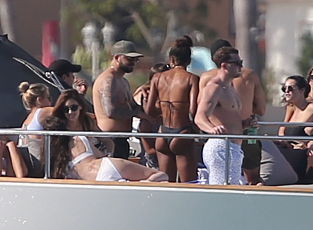 Les mannequins Jasmine Tookes (en bikini noir) et Shanina Shaik (en bikini bleu) célèbrent l’anniversaire de Jasmine sur un yacht à Miami, 01/02/2019.