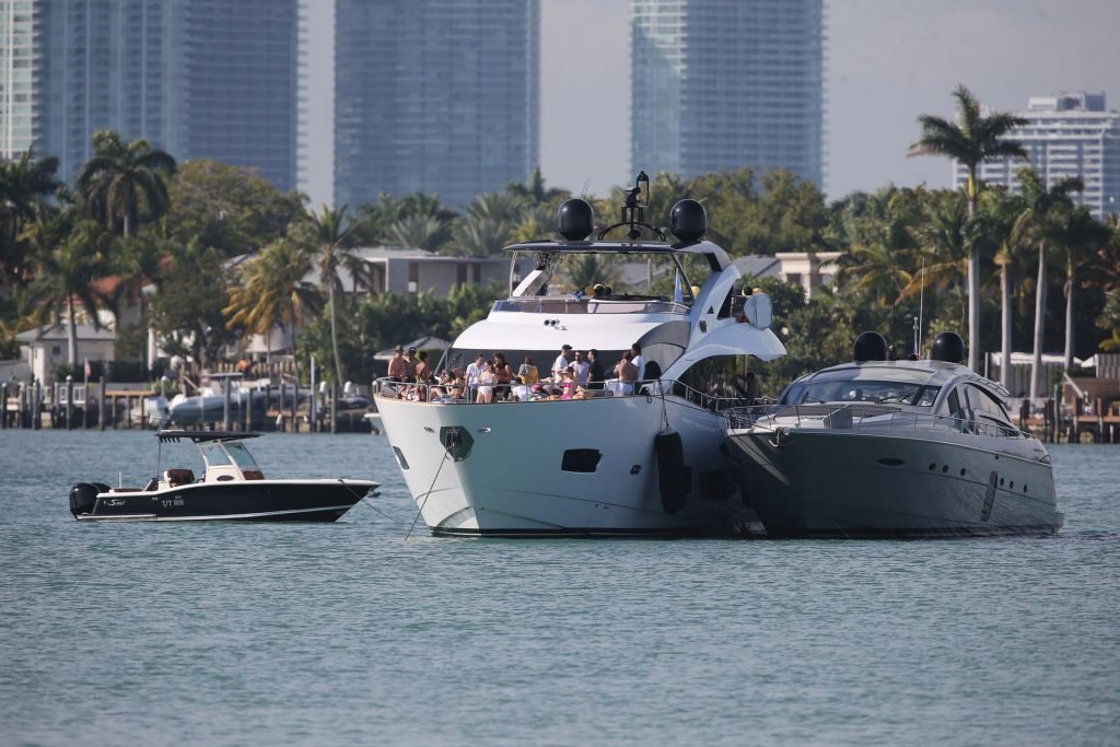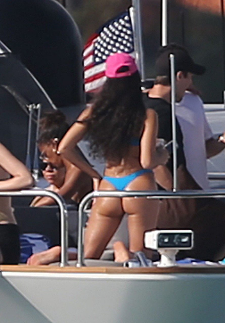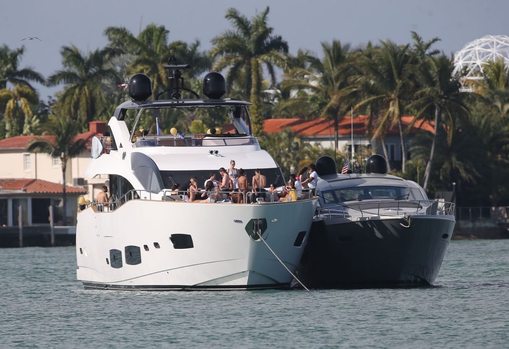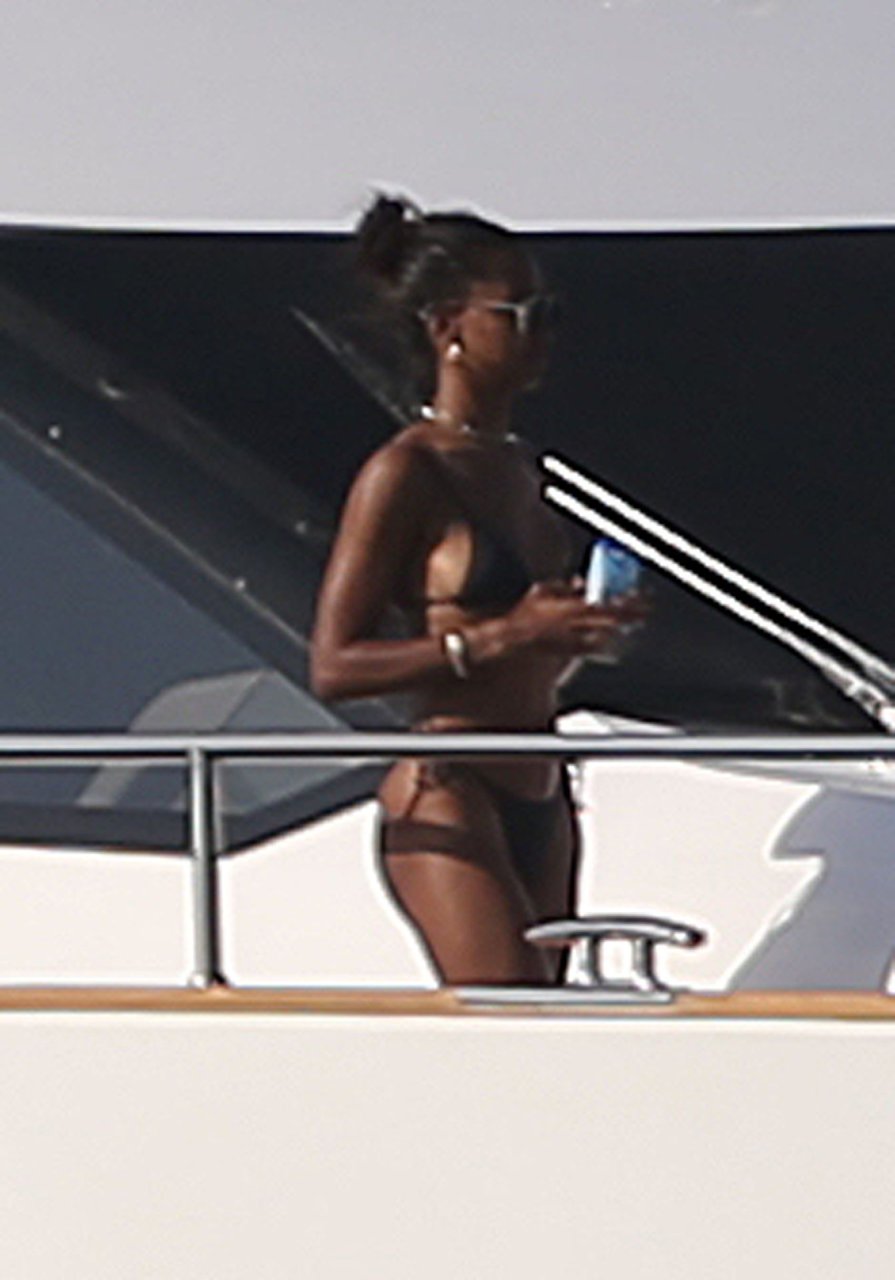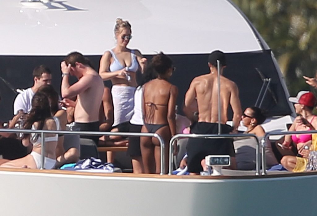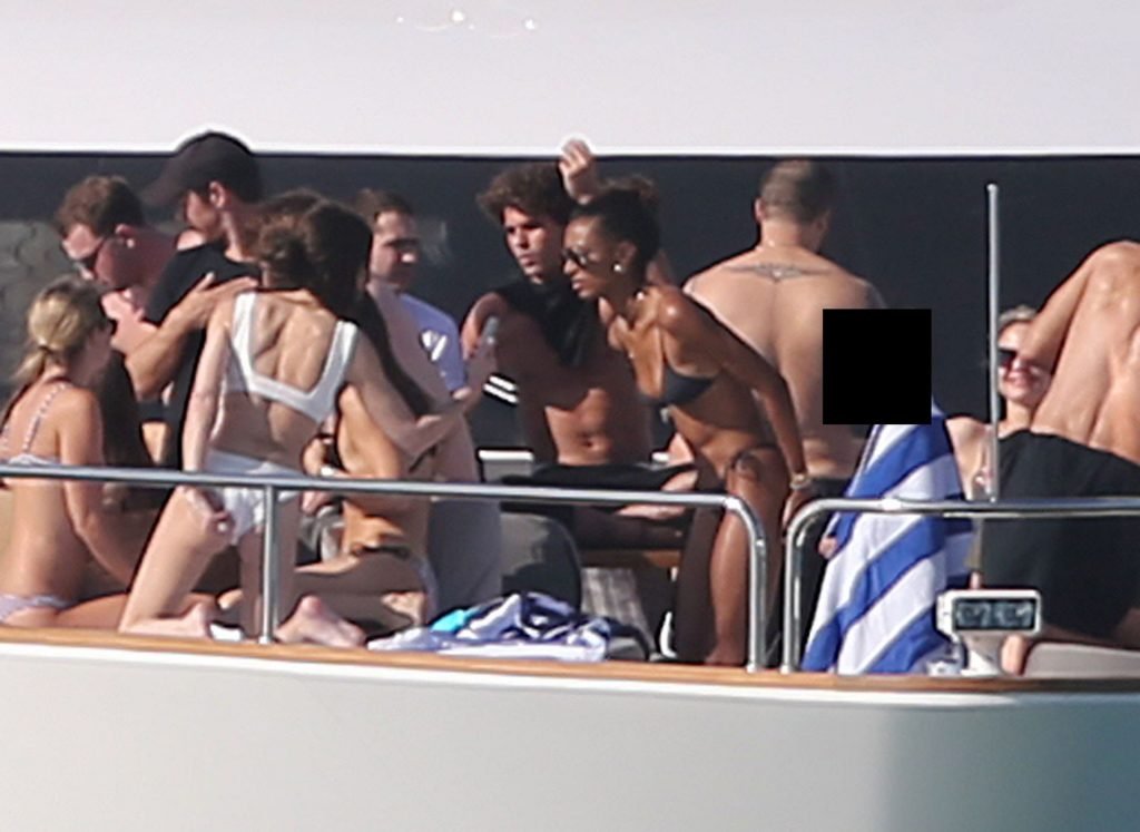 Les mannequins Jasmine Tookes (en bikini noir) et Shanina Shaik (en bikini bleu) célèbrent l’anniversaire de Jasmine sur un yacht à Miami, 01/02/2019.