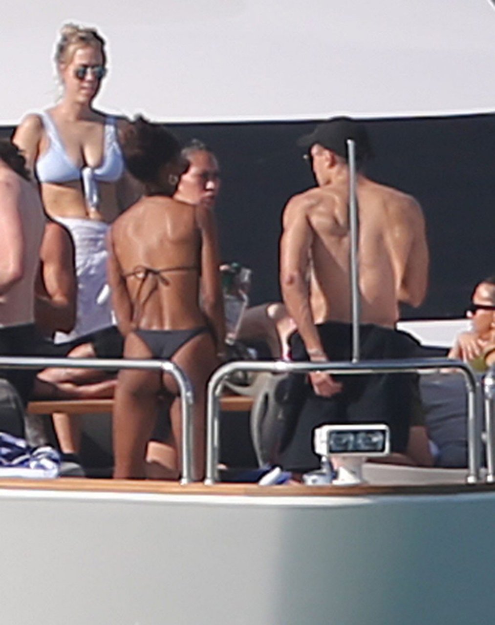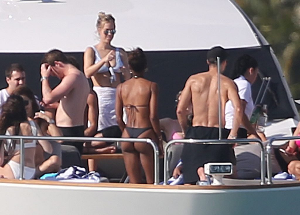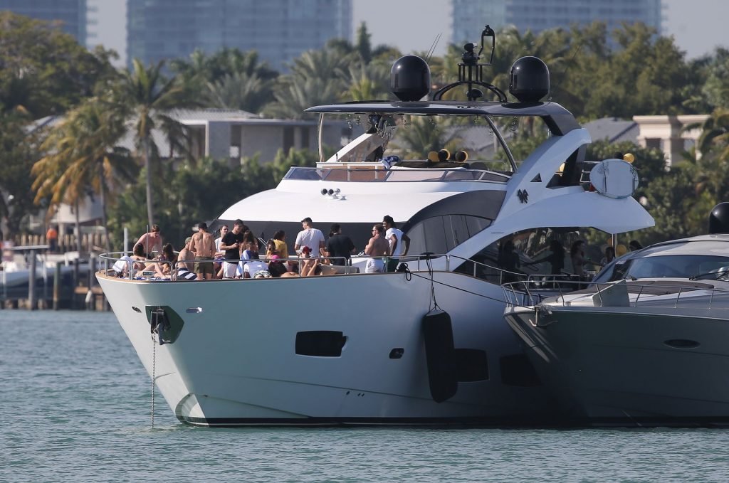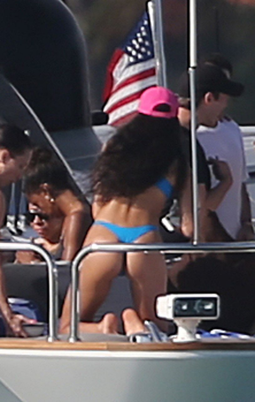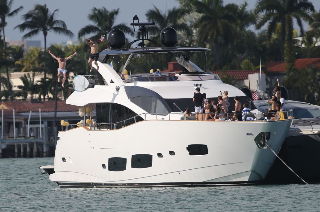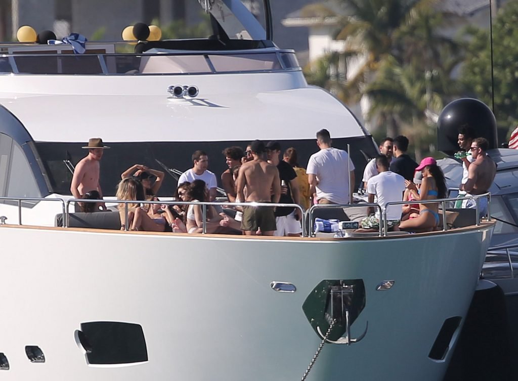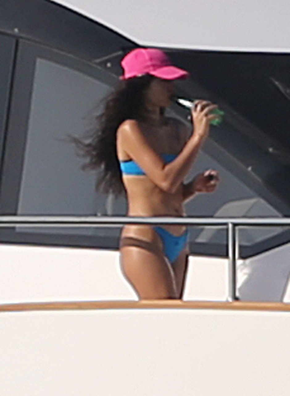 Les mannequins Jasmine Tookes (en bikini noir) et Shanina Shaik (en bikini bleu) célèbrent l’anniversaire de Jasmine sur un yacht à Miami, 01/02/2019.