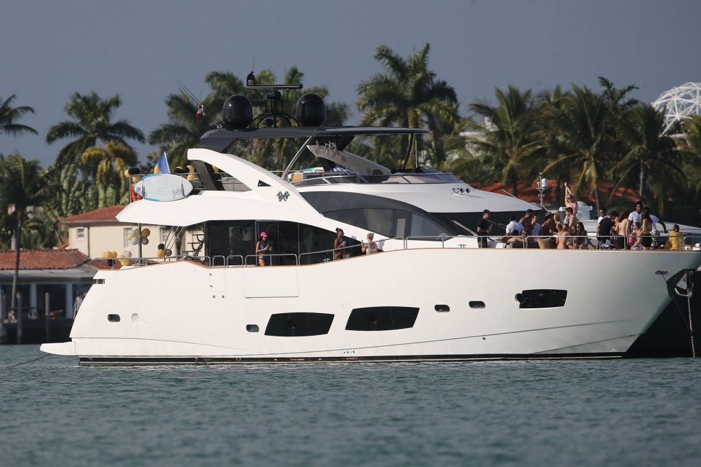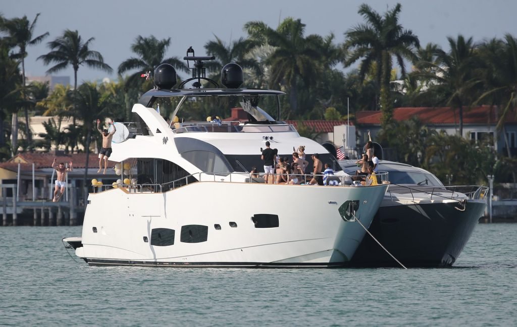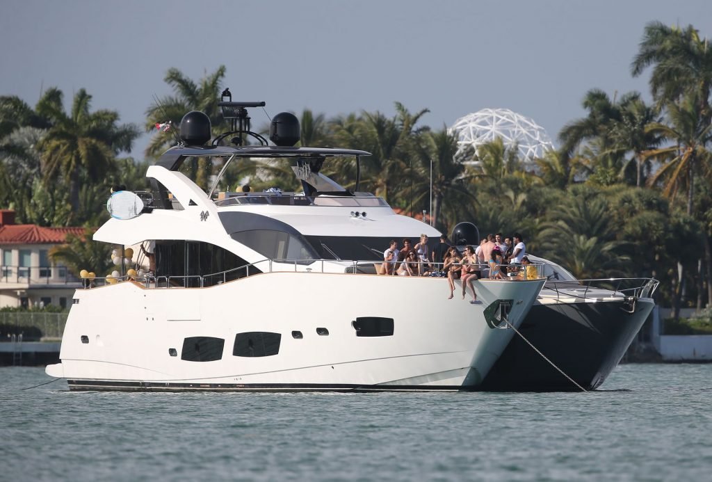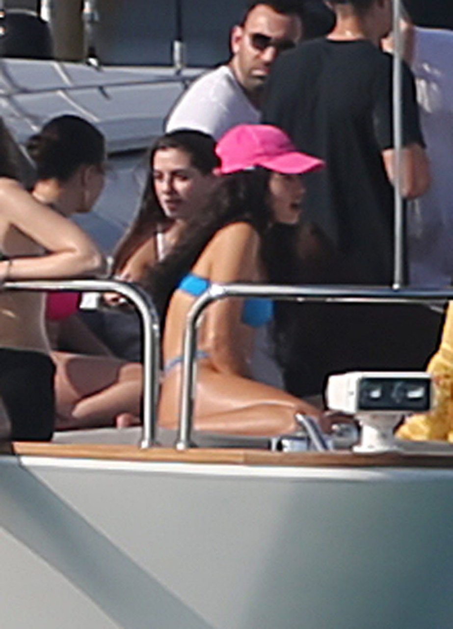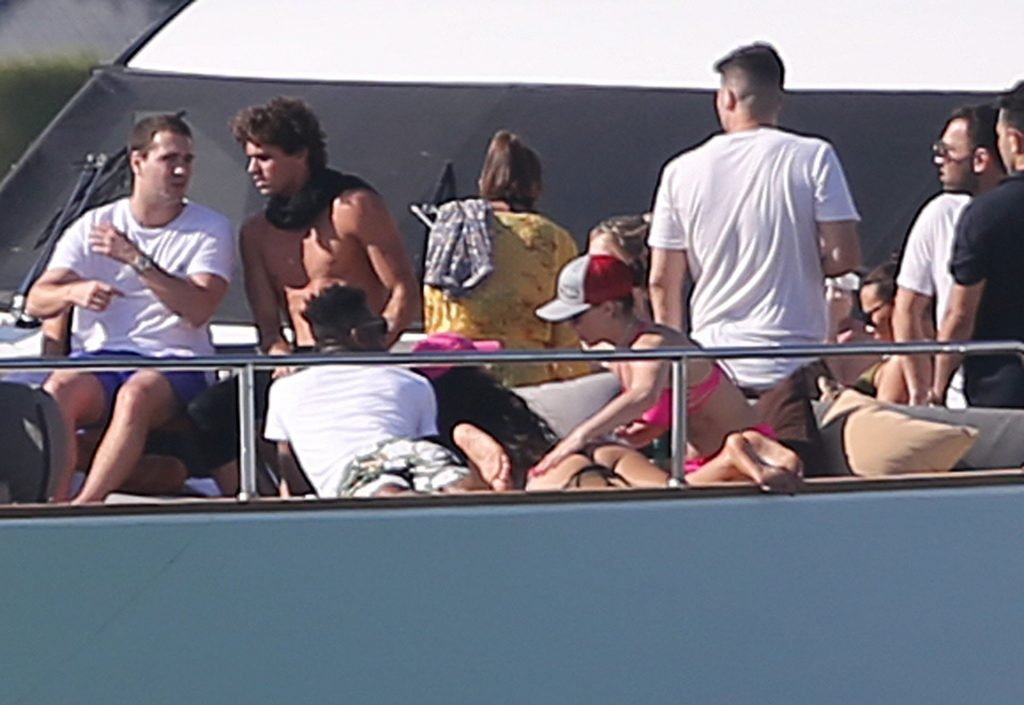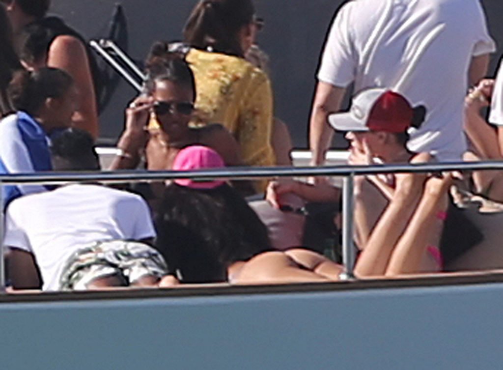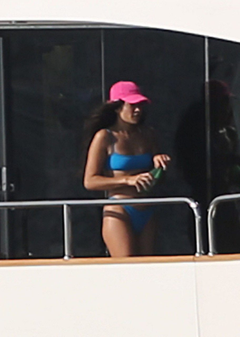 Les mannequins Jasmine Tookes (en bikini noir) et Shanina Shaik (en bikini bleu) célèbrent l’anniversaire de Jasmine sur un yacht à Miami, 01/02/2019.