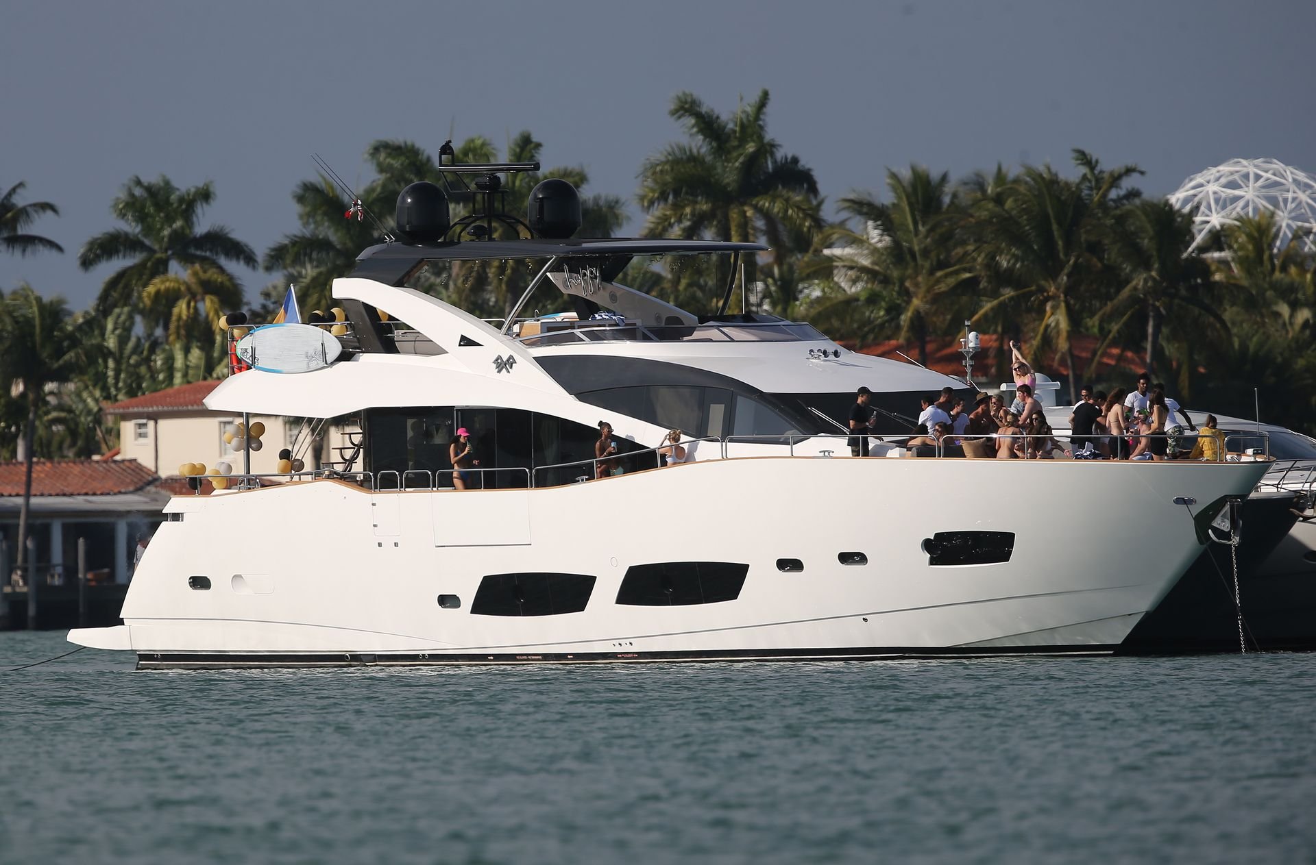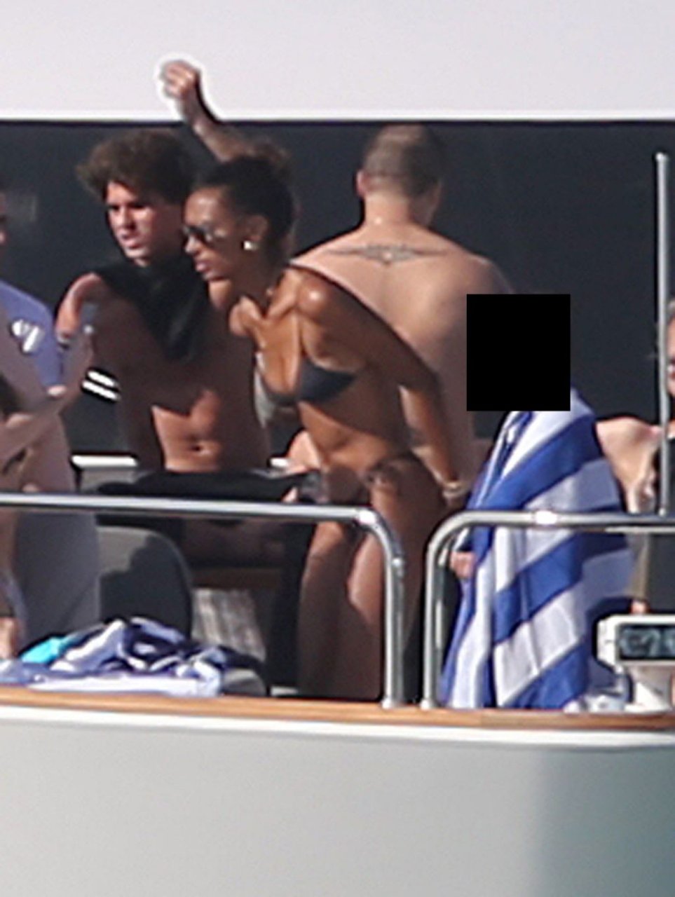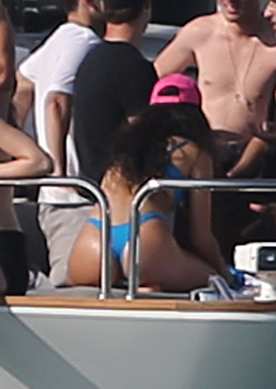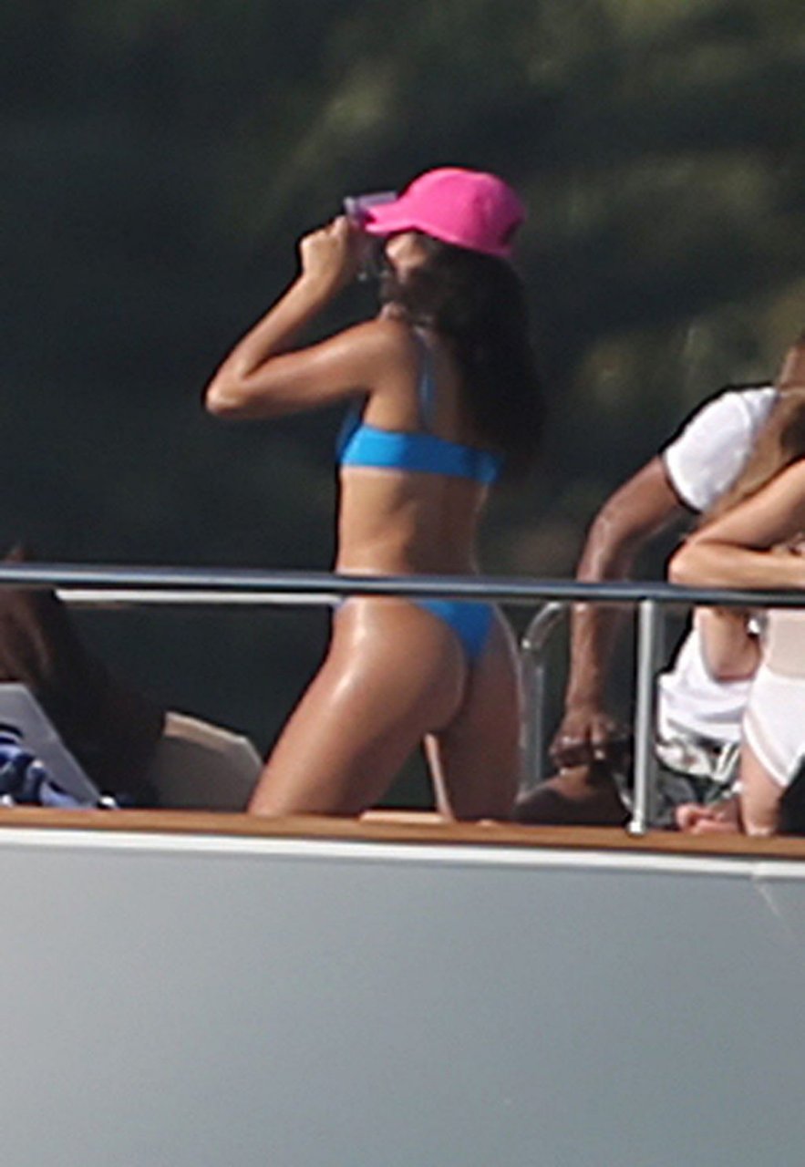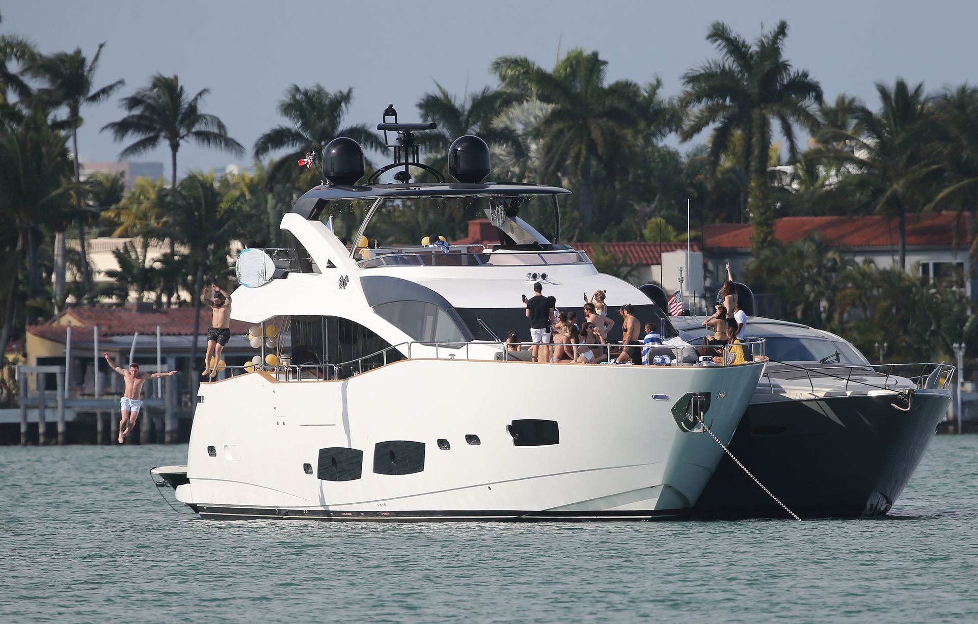 Les mannequins Jasmine Tookes (en bikini noir) et Shanina Shaik (en bikini bleu) célèbrent l’anniversaire de Jasmine sur un yacht à Miami, 01/02/2019.