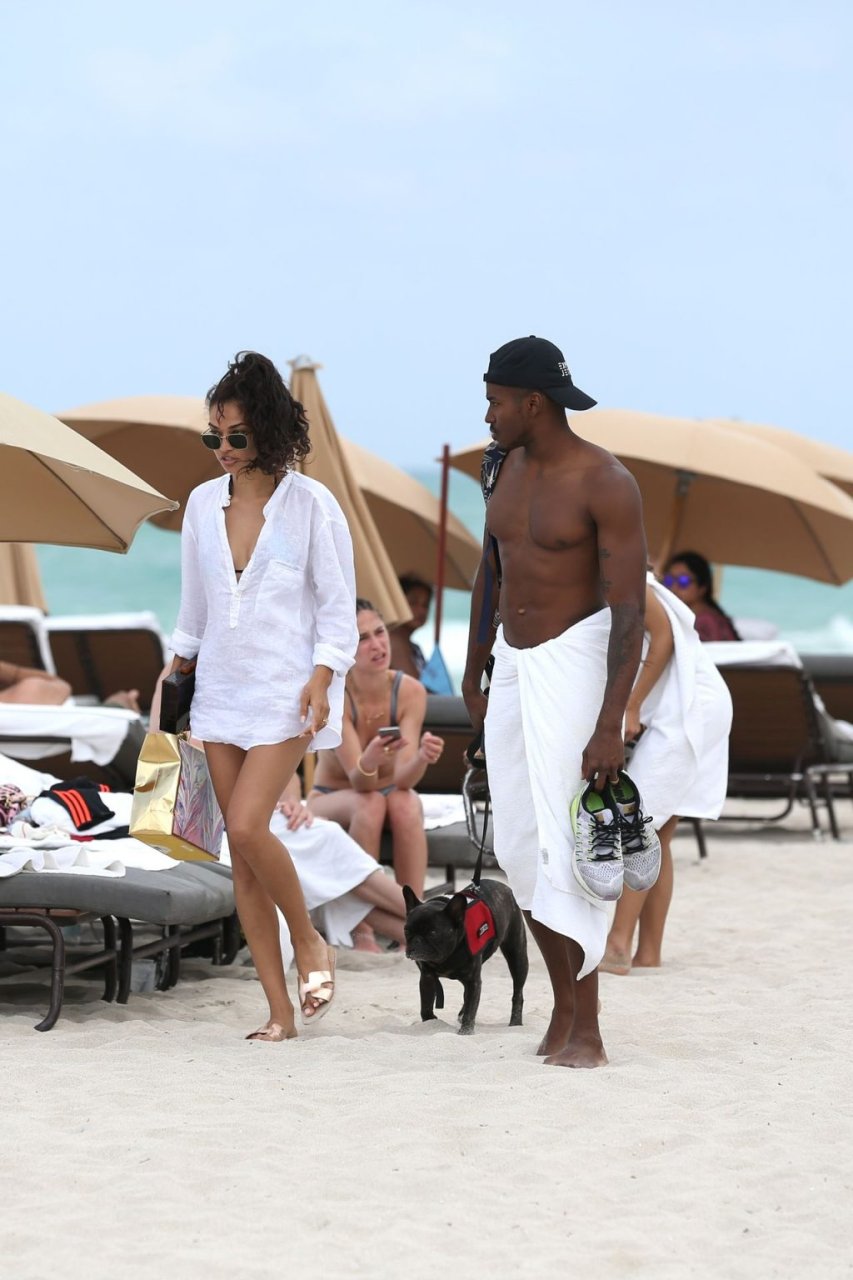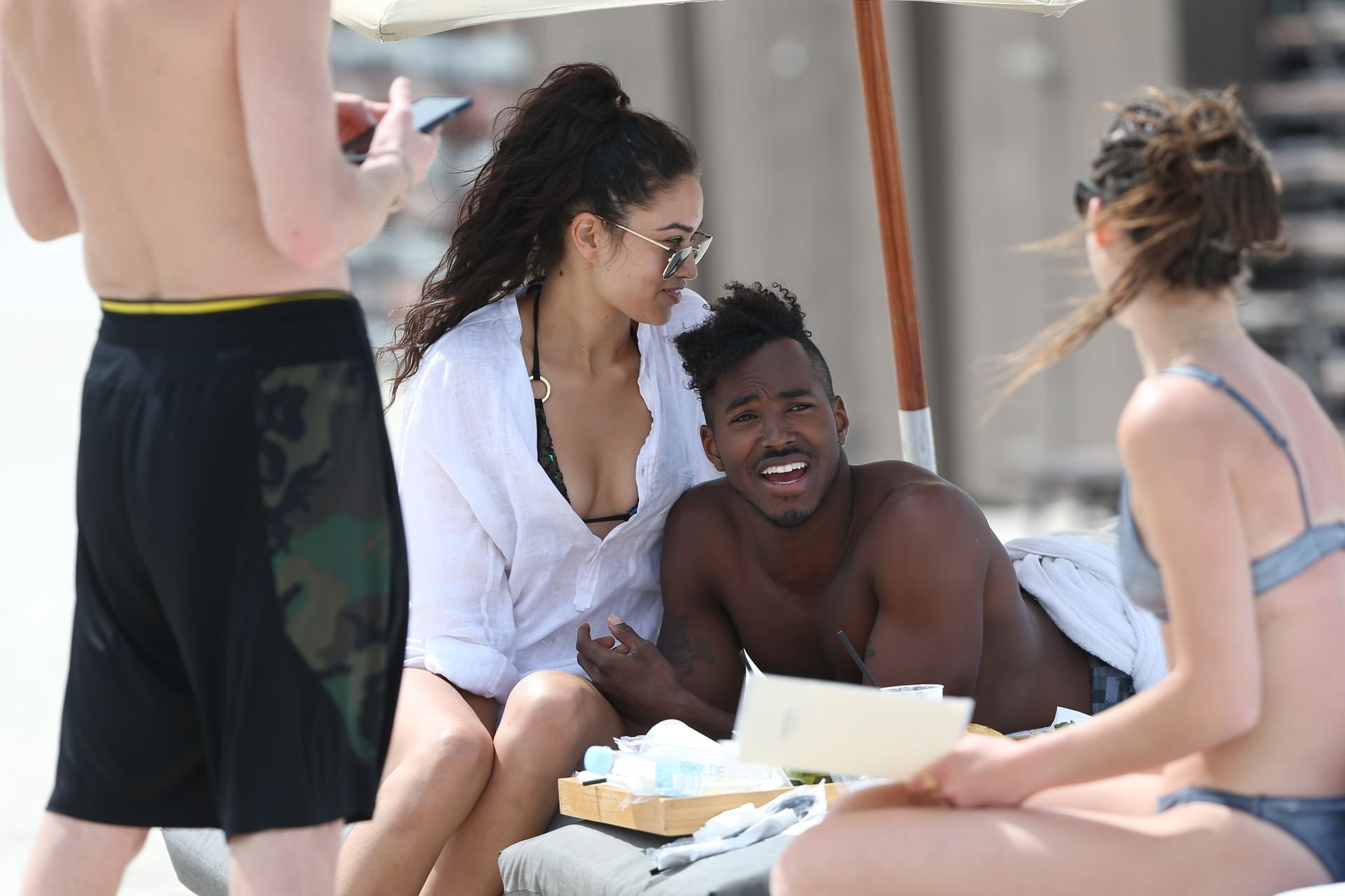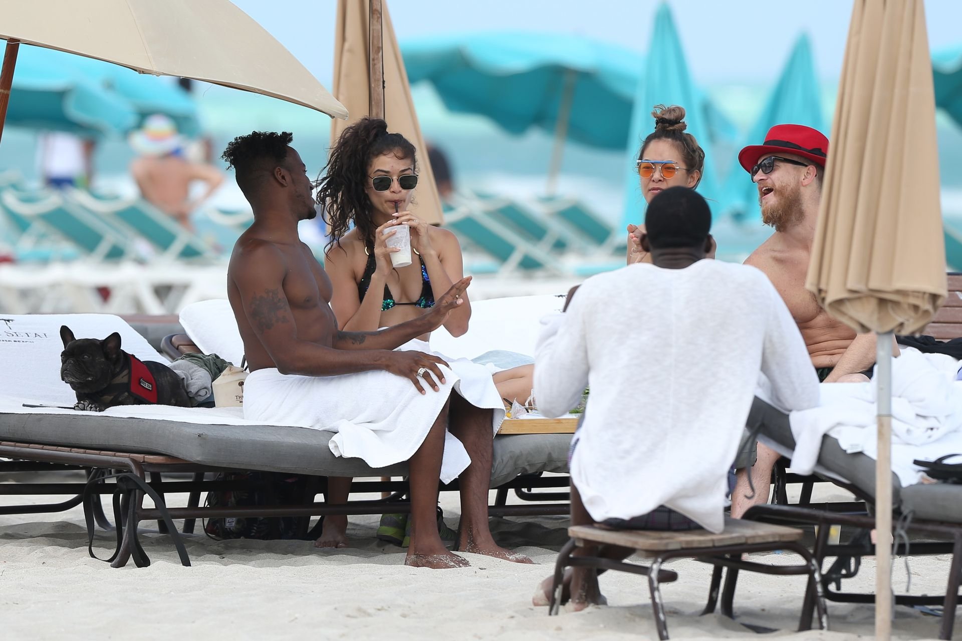 Les jeunes mariés Shanina Shaik et DJ Ruckus profitent du soleil avec des amis sur Miami Beach, 01/05/2018. Le couple s’est marié ce week-end aux Bahamas et a passé la journée avec des amis et leur chien Choppa sur la plage avant de retourner à la réalité.