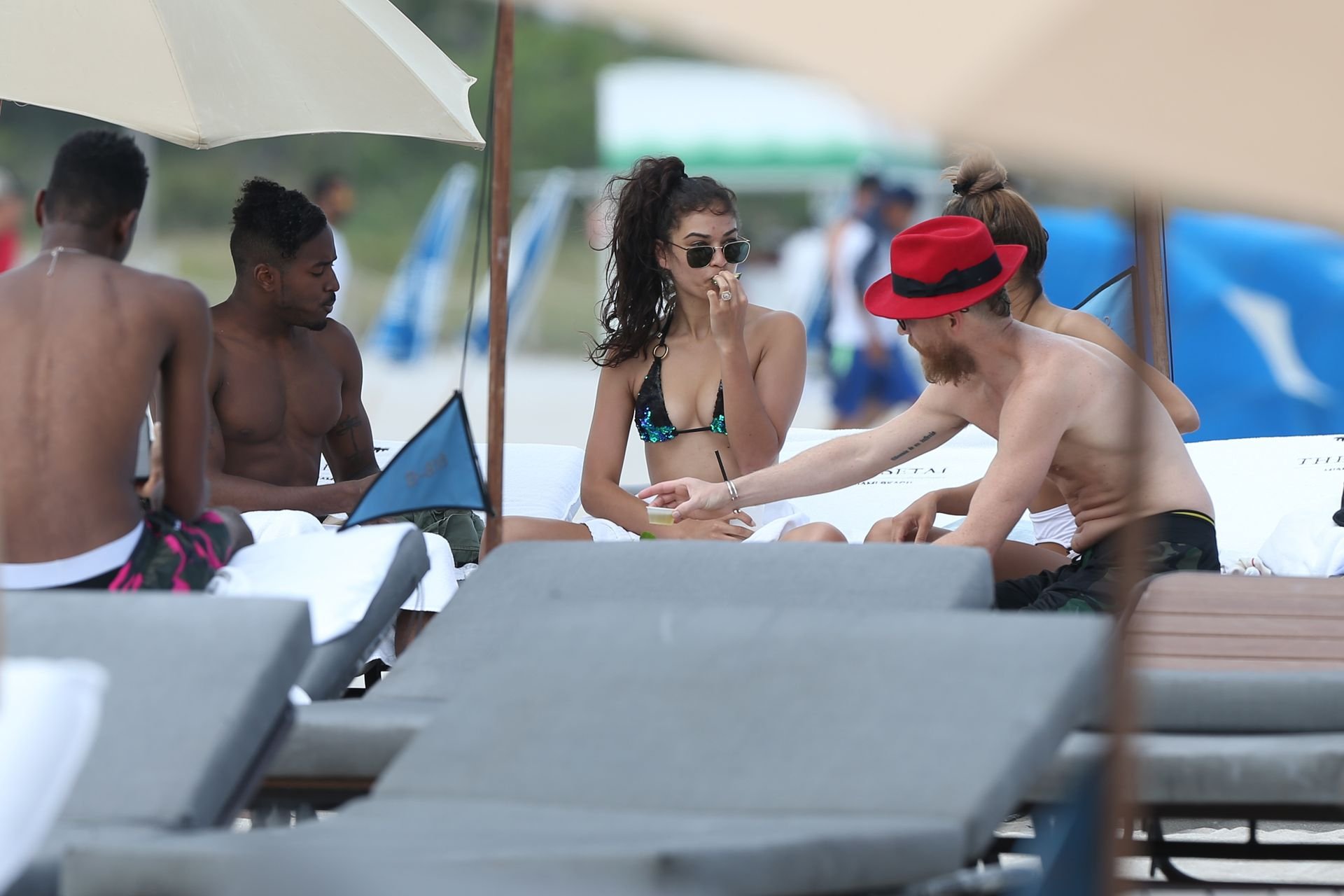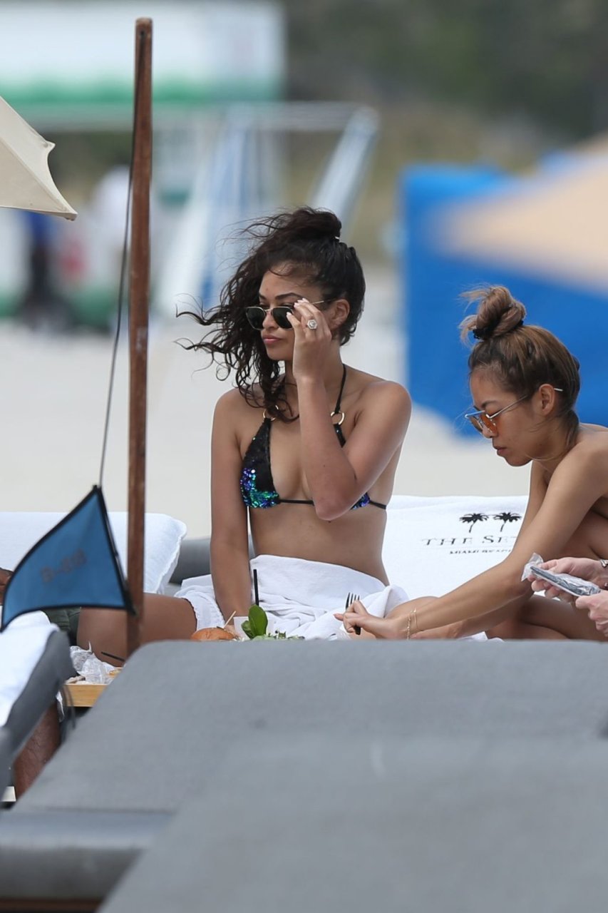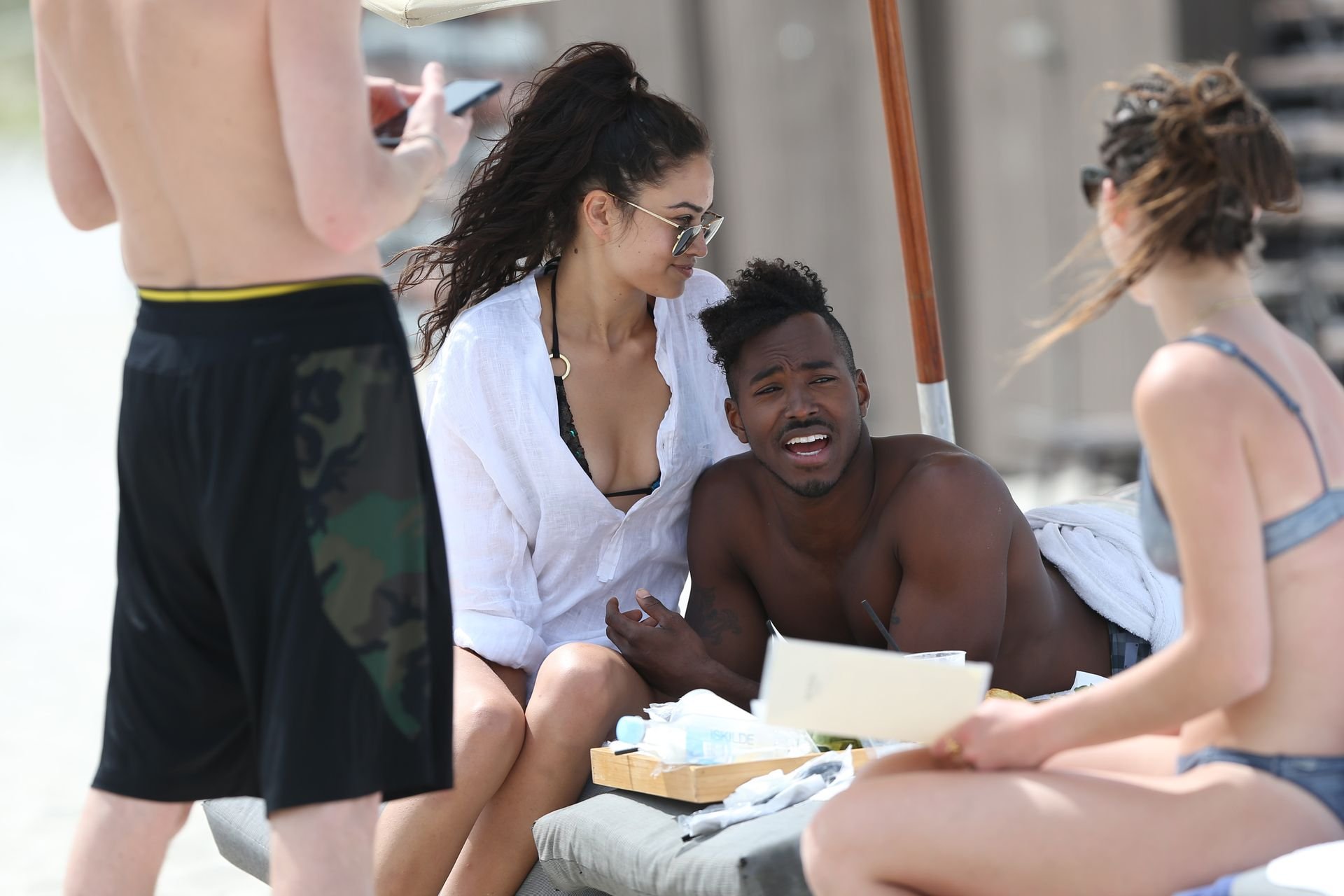Les jeunes mariés Shanina Shaik et DJ Ruckus profitent du soleil avec des amis sur Miami Beach, 01/05/2018. Le couple s’est marié ce week-end aux Bahamas et a passé la journée avec des amis et leur chien Choppa sur la plage avant de retourner à la réalité.