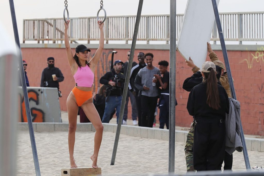 Avec 2 millions d’abonnés sur Instagram, la mannequin australienne de Victoria’s Secret Shanina Shaik pose pour P.E Nation à Venice Beach, le 26/11/2019. Shanina tient des anneaux fixes tout en portant un haut rose et un bikini orange, montrant ses formes.