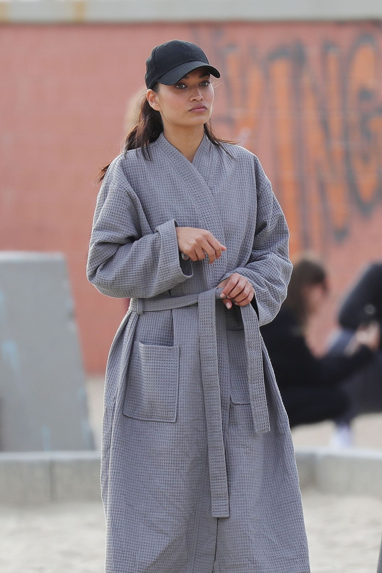 Avec 2 millions d’abonnés sur Instagram, la mannequin australienne de Victoria’s Secret Shanina Shaik pose pour P.E Nation à Venice Beach, le 26/11/2019. Shanina tient des anneaux fixes tout en portant un haut rose et un bikini orange, montrant ses formes.