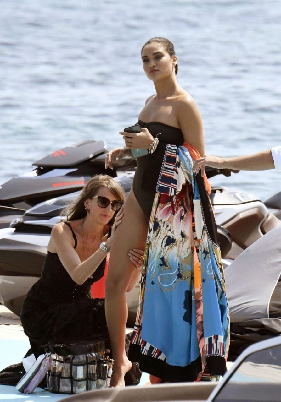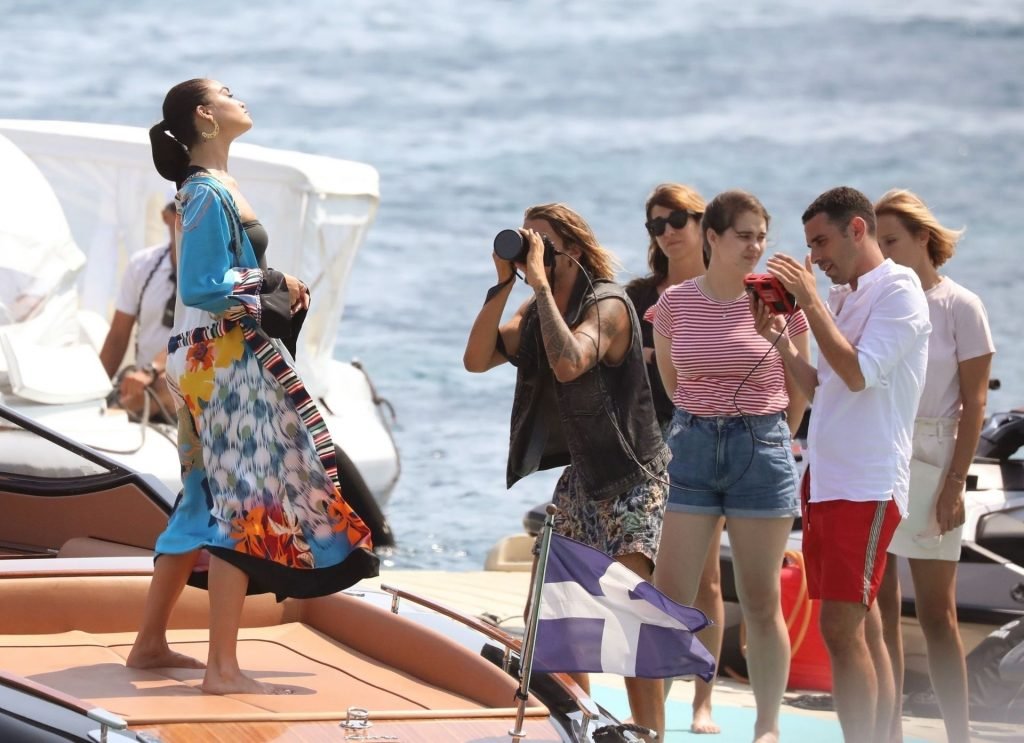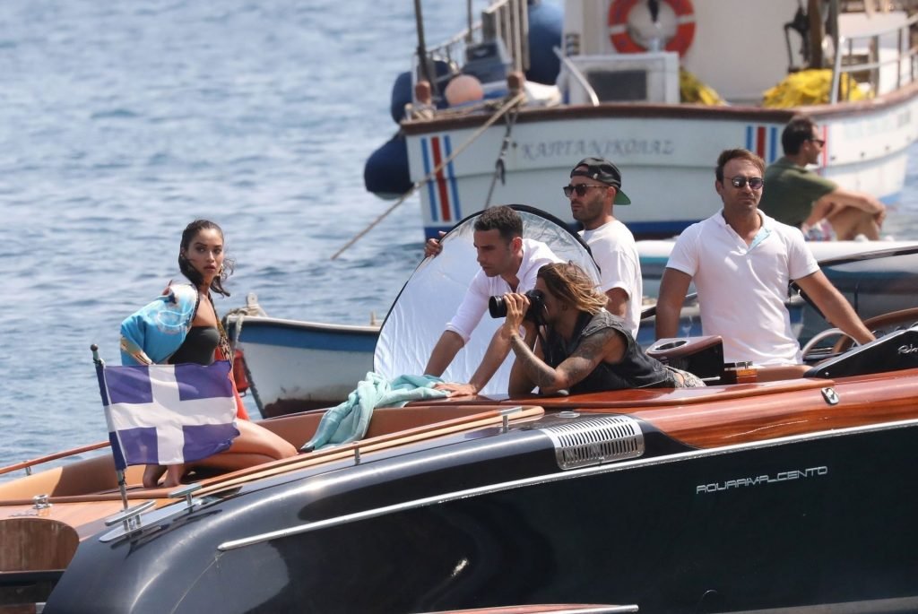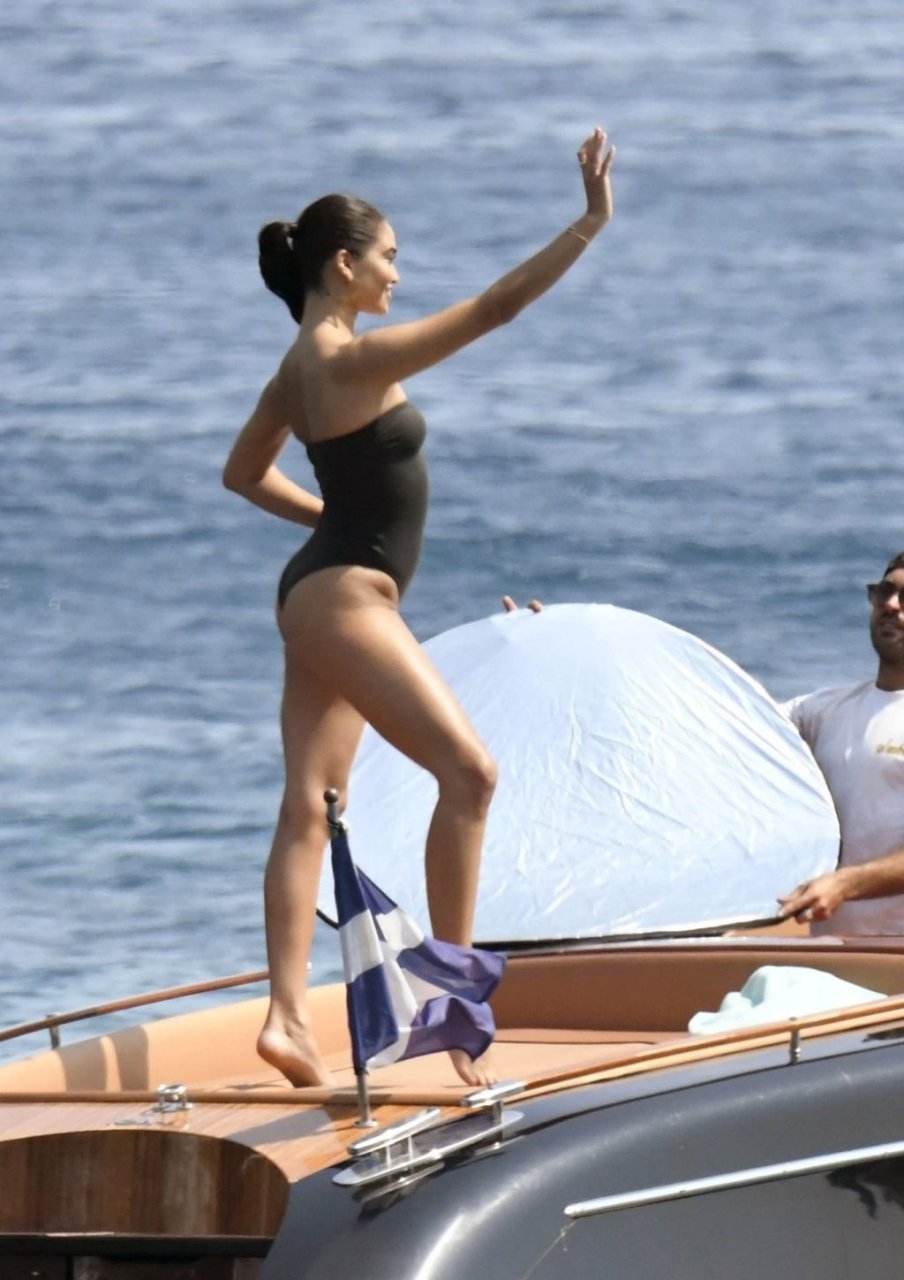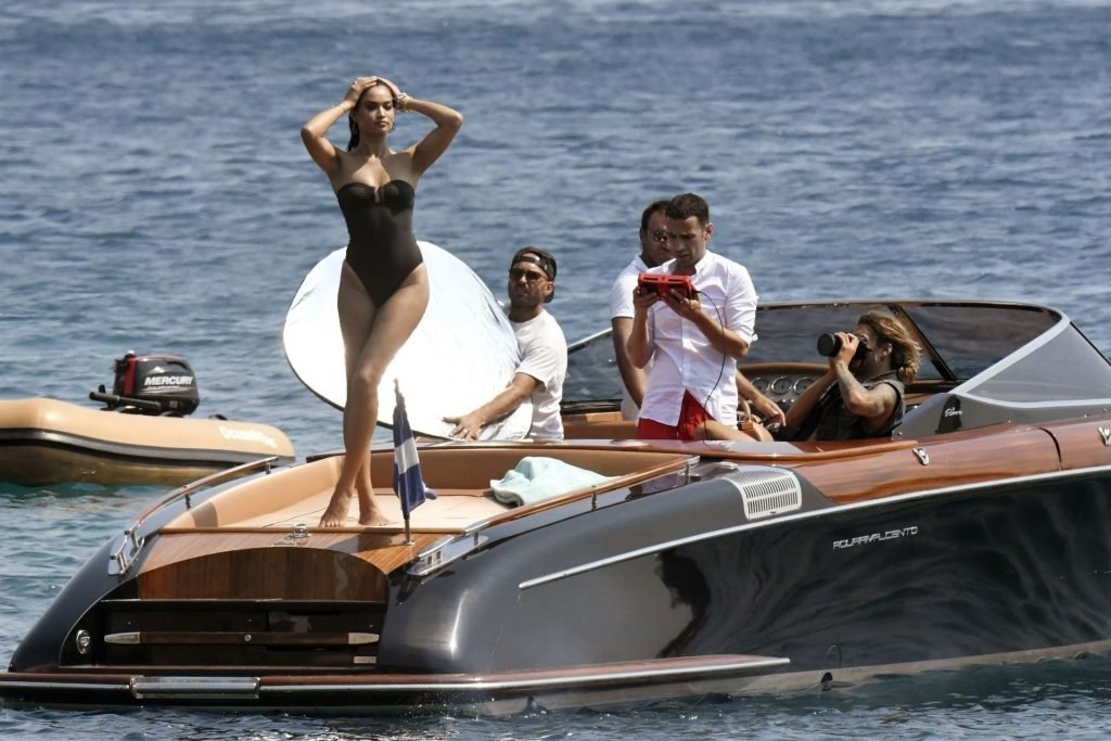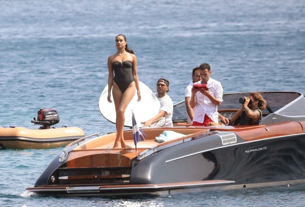 Le mannequin sexy de lingerie Victoria’s Secret, Shanina Shaik, exhibe ses atouts dans un maillot de bain noir sexy alors qu’elle pose sur un bateau sous le soleil grec, filmant une publicité à Nammos, plage de Psarou à Mykonos, le 09/05/2019. L’acteur canadien Nick Bateman a également rejoint Shanina lors du shooting, montrant ses muscles en faisant une balade en jet ski.