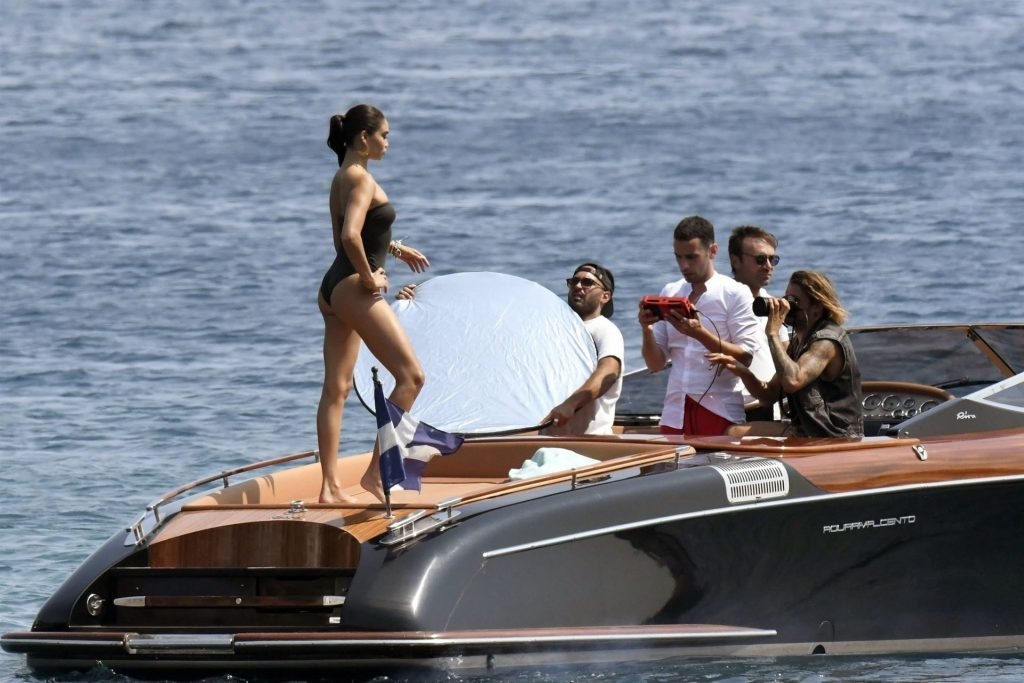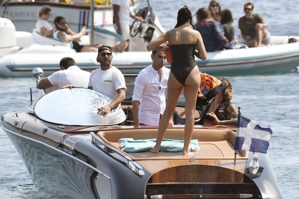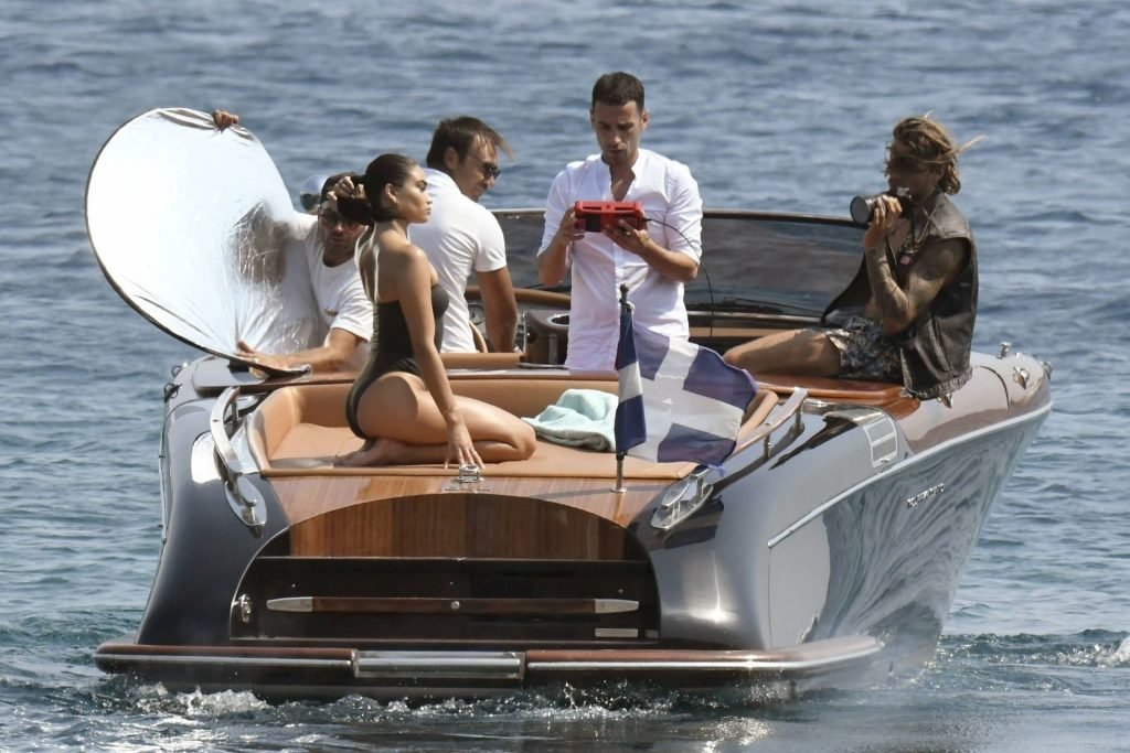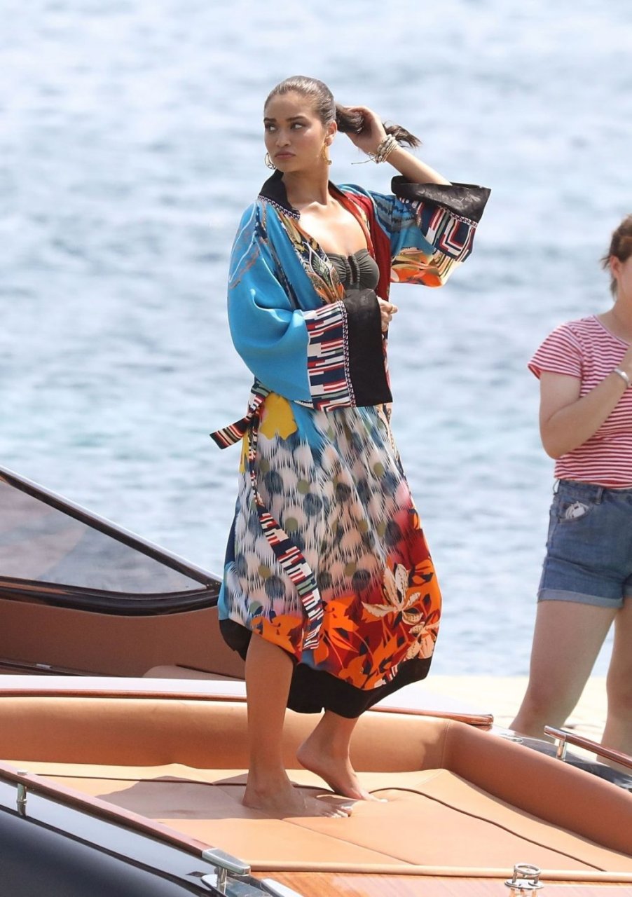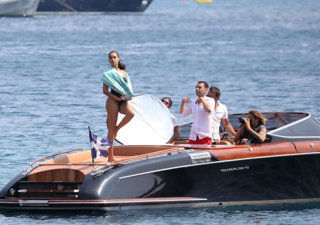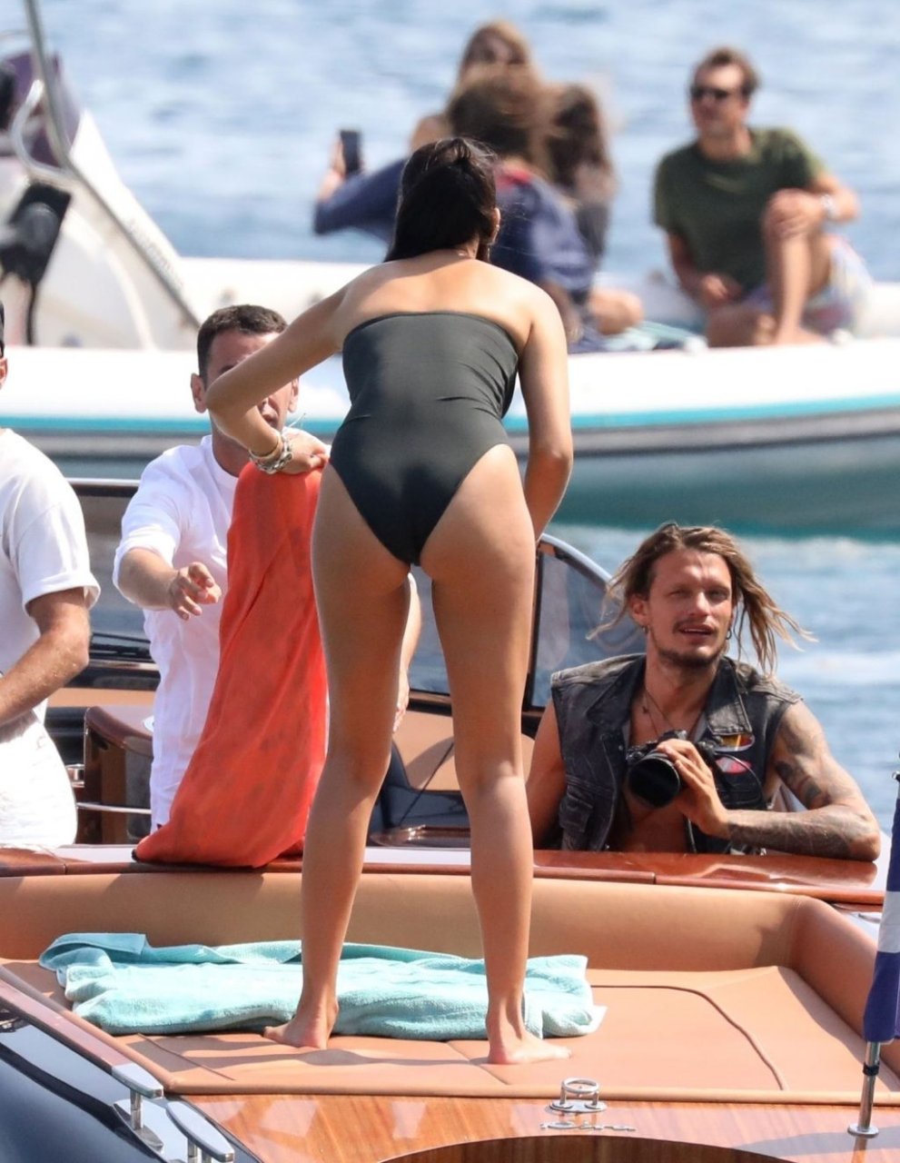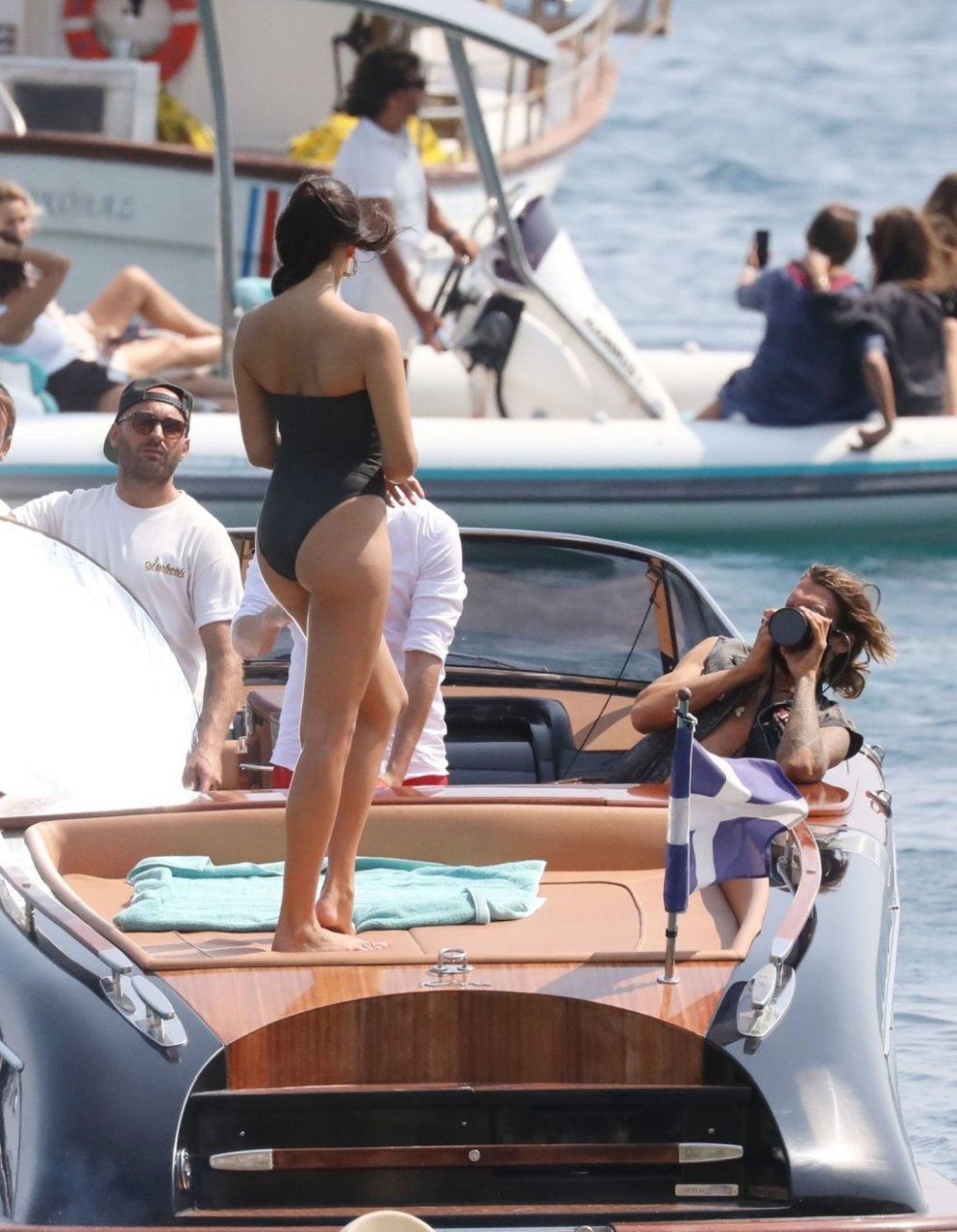 Le mannequin sexy de lingerie Victoria’s Secret, Shanina Shaik, exhibe ses atouts dans un maillot de bain noir sexy alors qu’elle pose sur un bateau sous le soleil grec, filmant une publicité à Nammos, plage de Psarou à Mykonos, le 09/05/2019. L’acteur canadien Nick Bateman a également rejoint Shanina lors du shooting, montrant ses muscles en faisant une balade en jet ski.