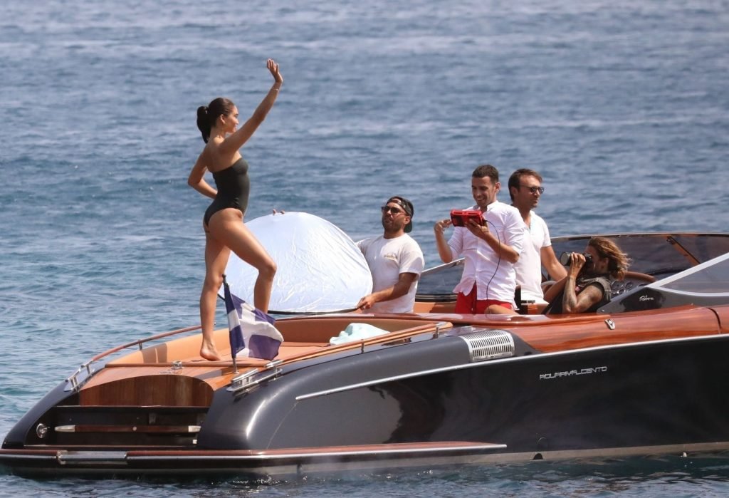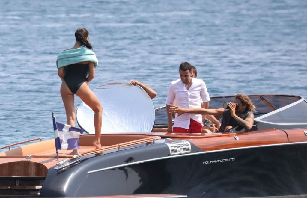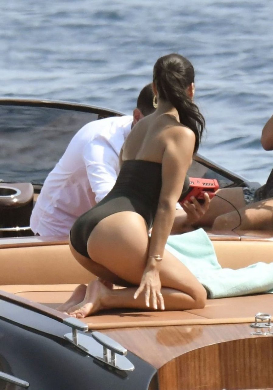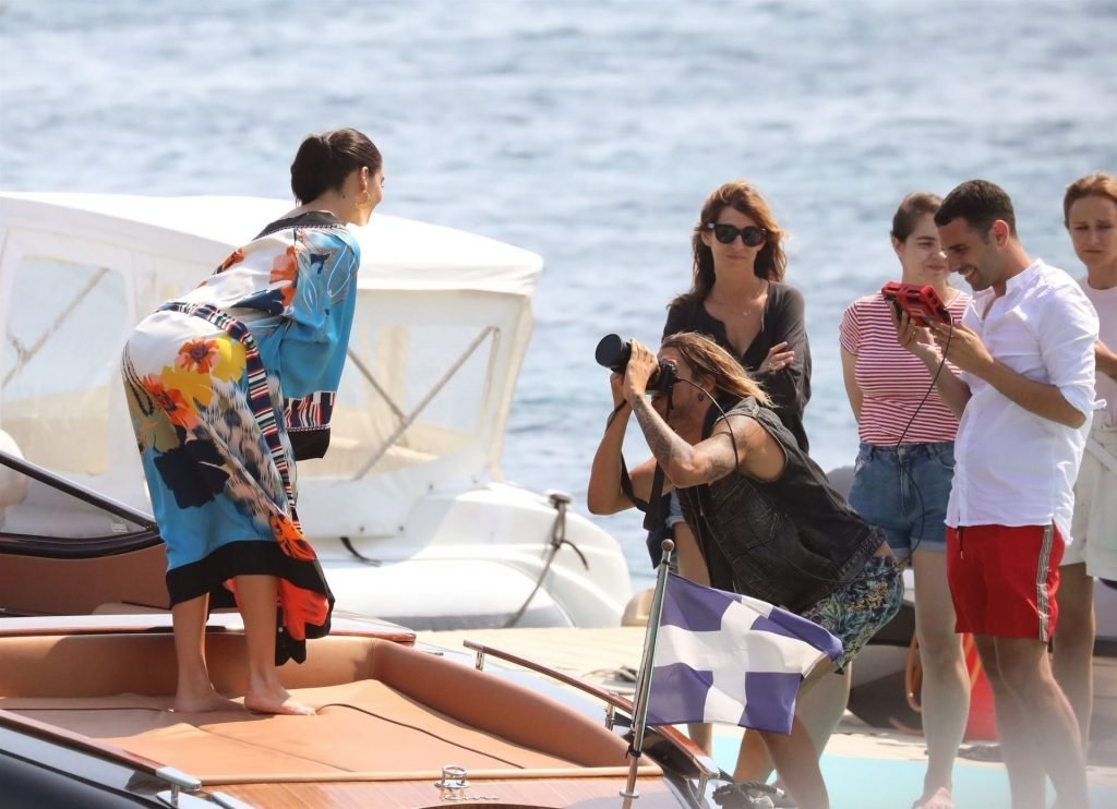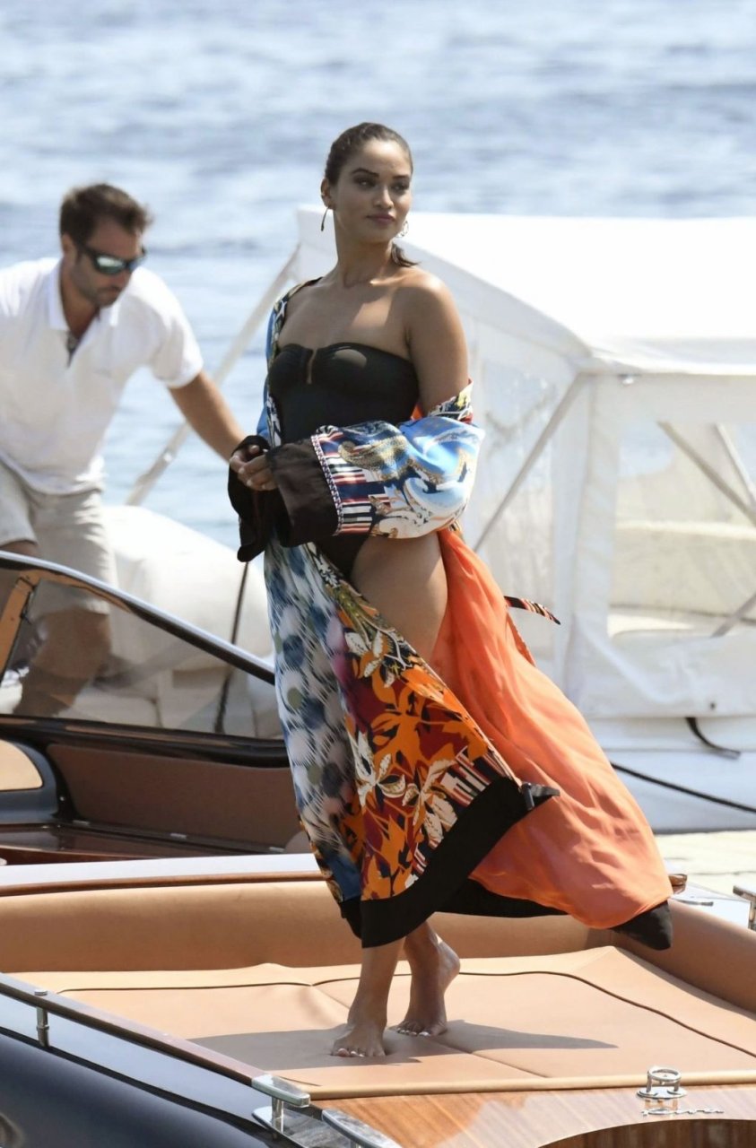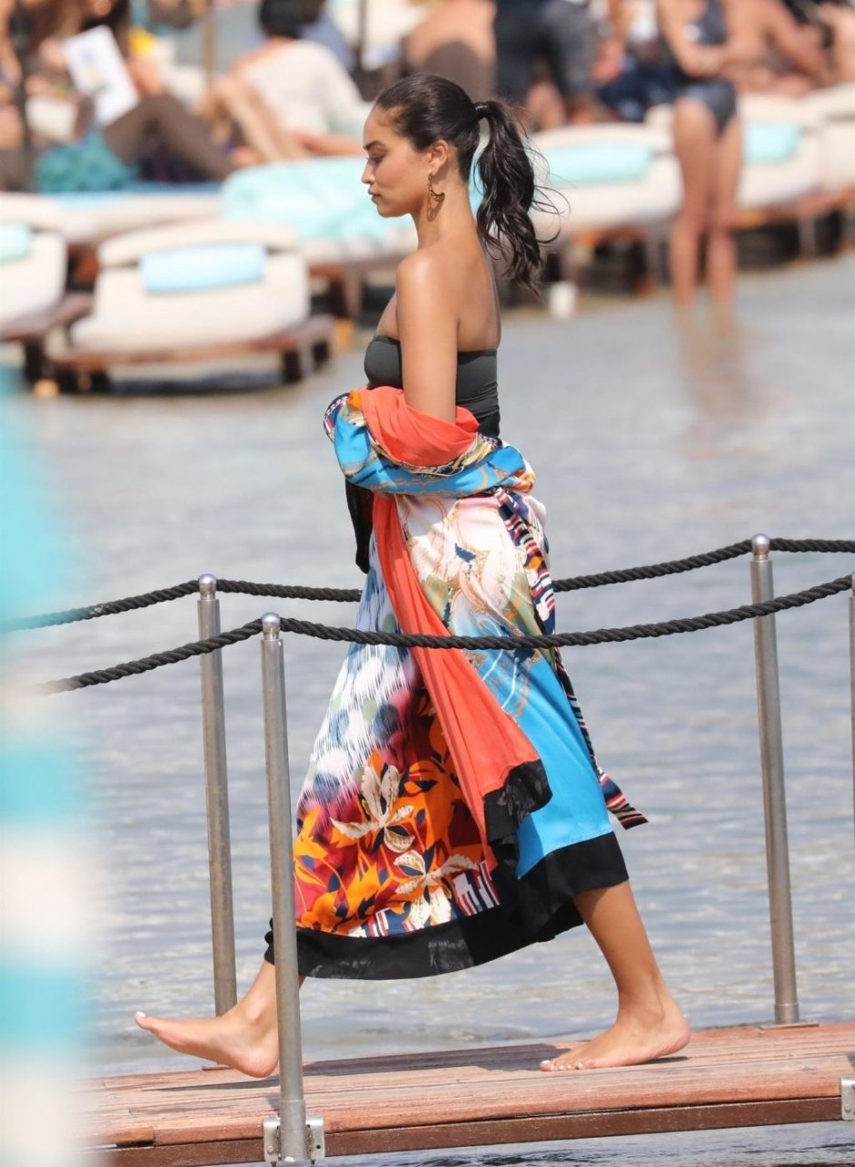 Le mannequin sexy de lingerie Victoria’s Secret, Shanina Shaik, exhibe ses atouts dans un maillot de bain noir sexy alors qu’elle pose sur un bateau sous le soleil grec, filmant une publicité à Nammos, plage de Psarou à Mykonos, le 09/05/2019. L’acteur canadien Nick Bateman a également rejoint Shanina lors du shooting, montrant ses muscles en faisant une balade en jet ski.