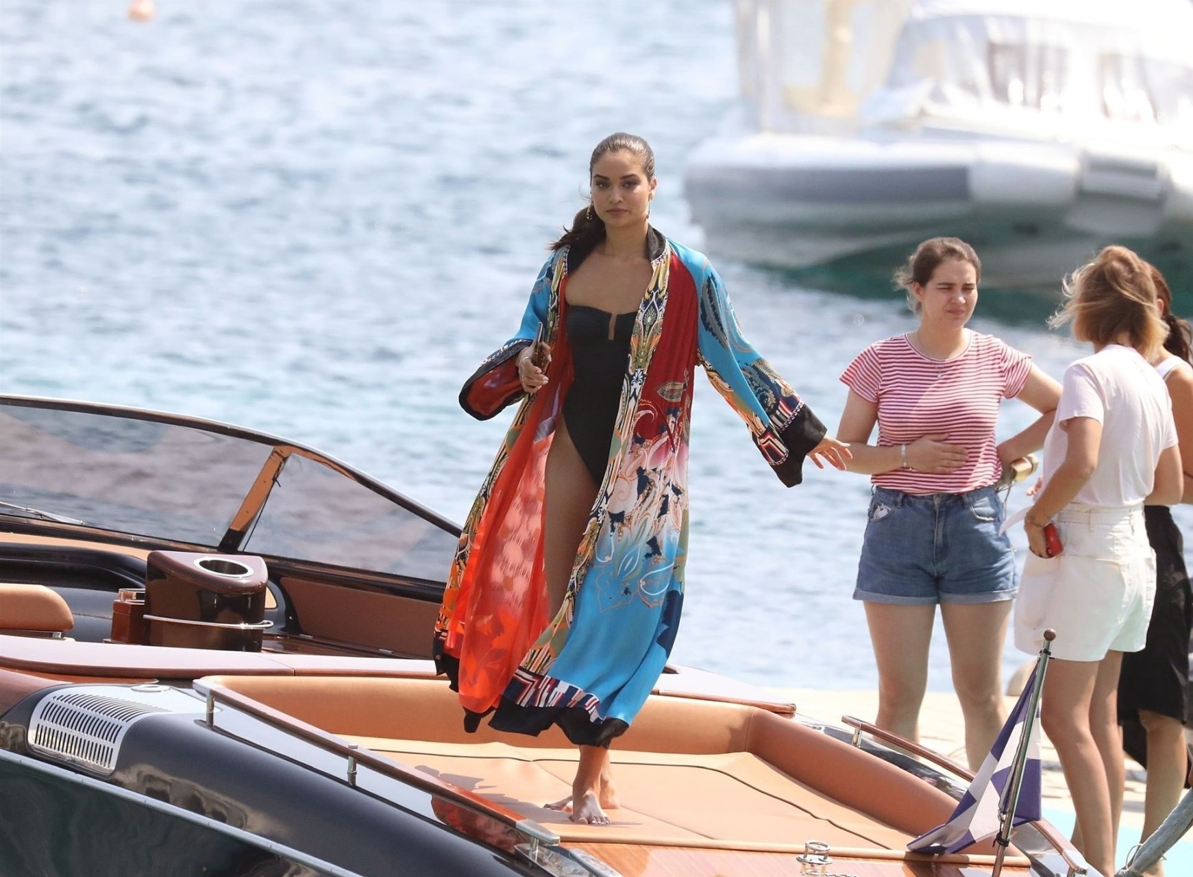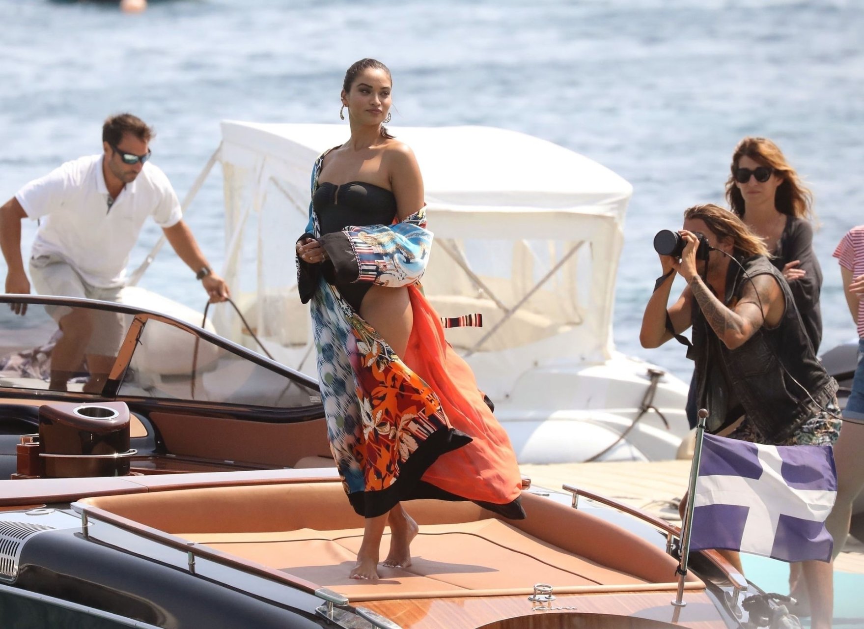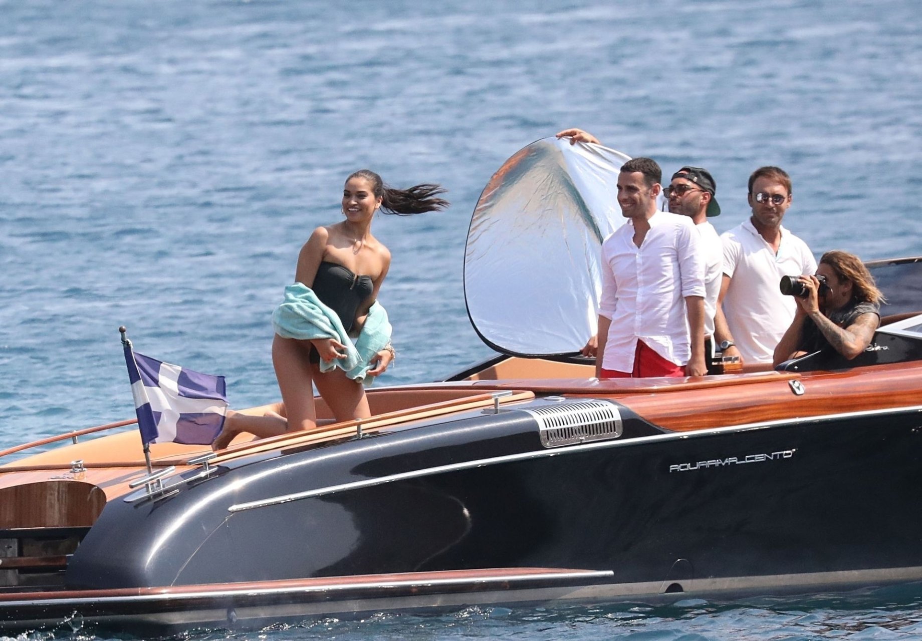 Le mannequin sexy de lingerie Victoria’s Secret, Shanina Shaik, exhibe ses atouts dans un maillot de bain noir sexy alors qu’elle pose sur un bateau sous le soleil grec, filmant une publicité à Nammos, plage de Psarou à Mykonos, le 09/05/2019. L’acteur canadien Nick Bateman a également rejoint Shanina lors du shooting, montrant ses muscles en faisant une balade en jet ski.