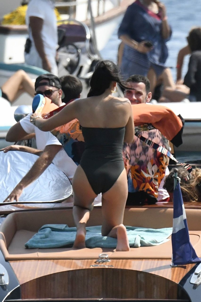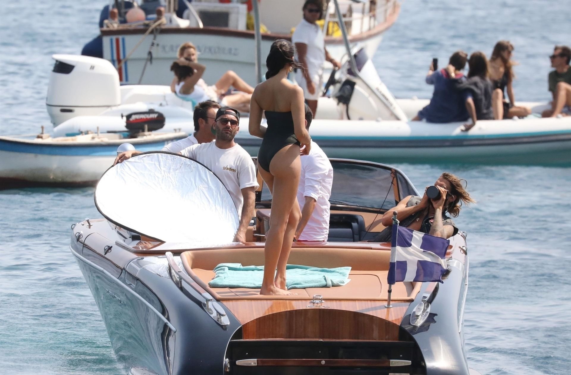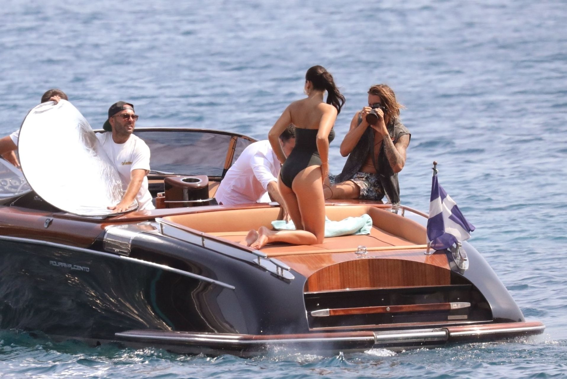 Le mannequin sexy de lingerie Victoria’s Secret, Shanina Shaik, exhibe ses atouts dans un maillot de bain noir sexy alors qu’elle pose sur un bateau sous le soleil grec, filmant une publicité à Nammos, plage de Psarou à Mykonos, le 09/05/2019. L’acteur canadien Nick Bateman a également rejoint Shanina lors du shooting, montrant ses muscles en faisant une balade en jet ski.
