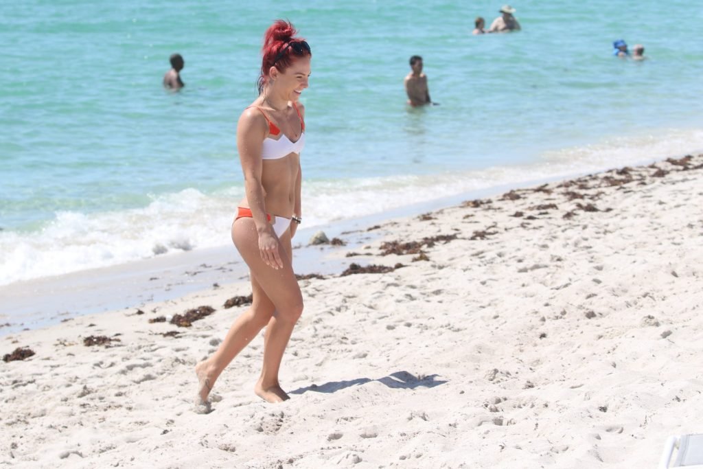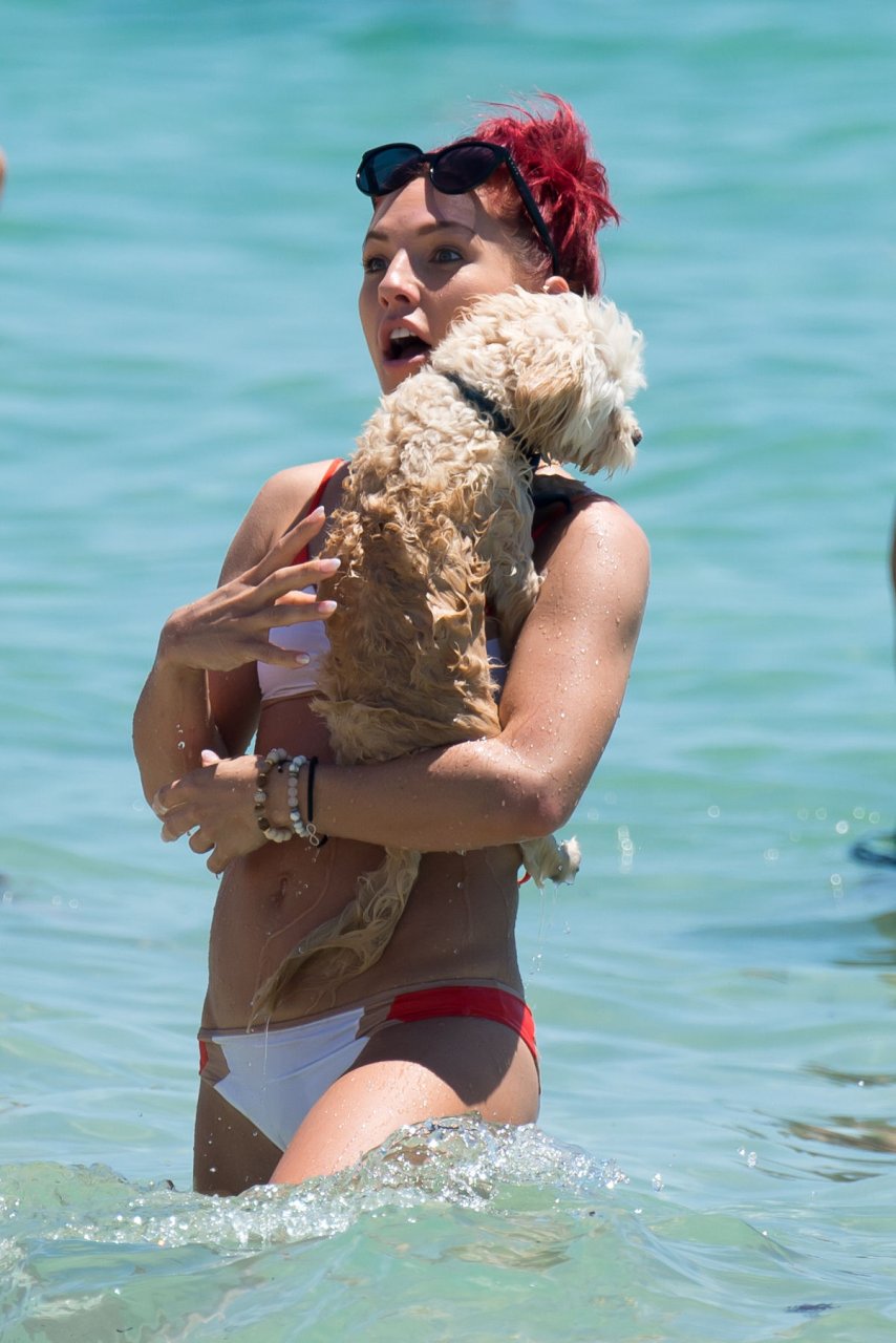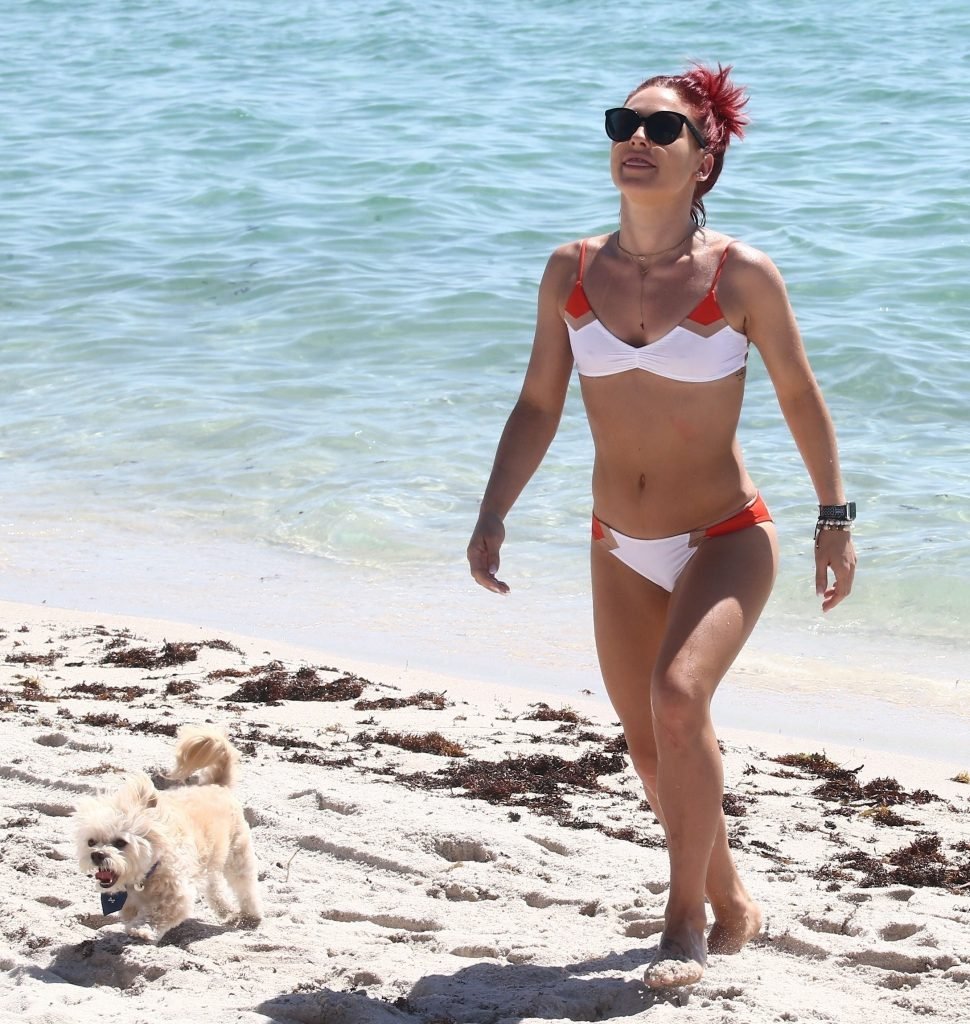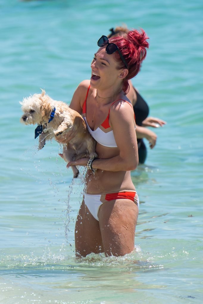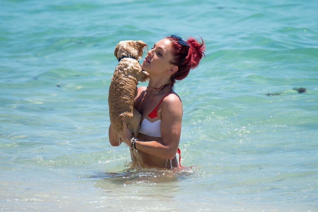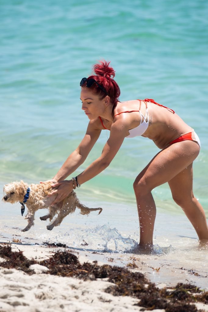 La star de DWTS Sharna Burgess, 32 ans, profite d’une journée en haut de bikini blanc à la plage avec ses chiens à Miami Beach, 02/06/2018.