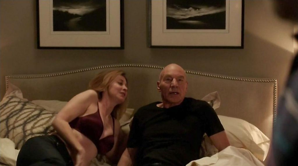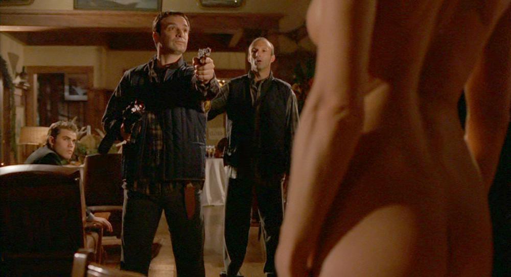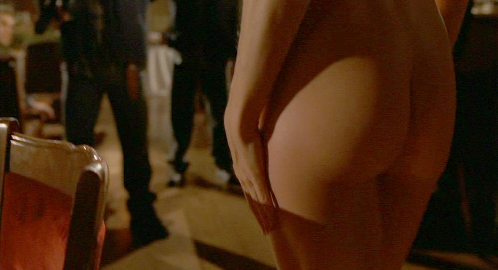 The top of her awesome ass is visible, along with some side sackage as she cuddles up to Dennis Franz in bed.