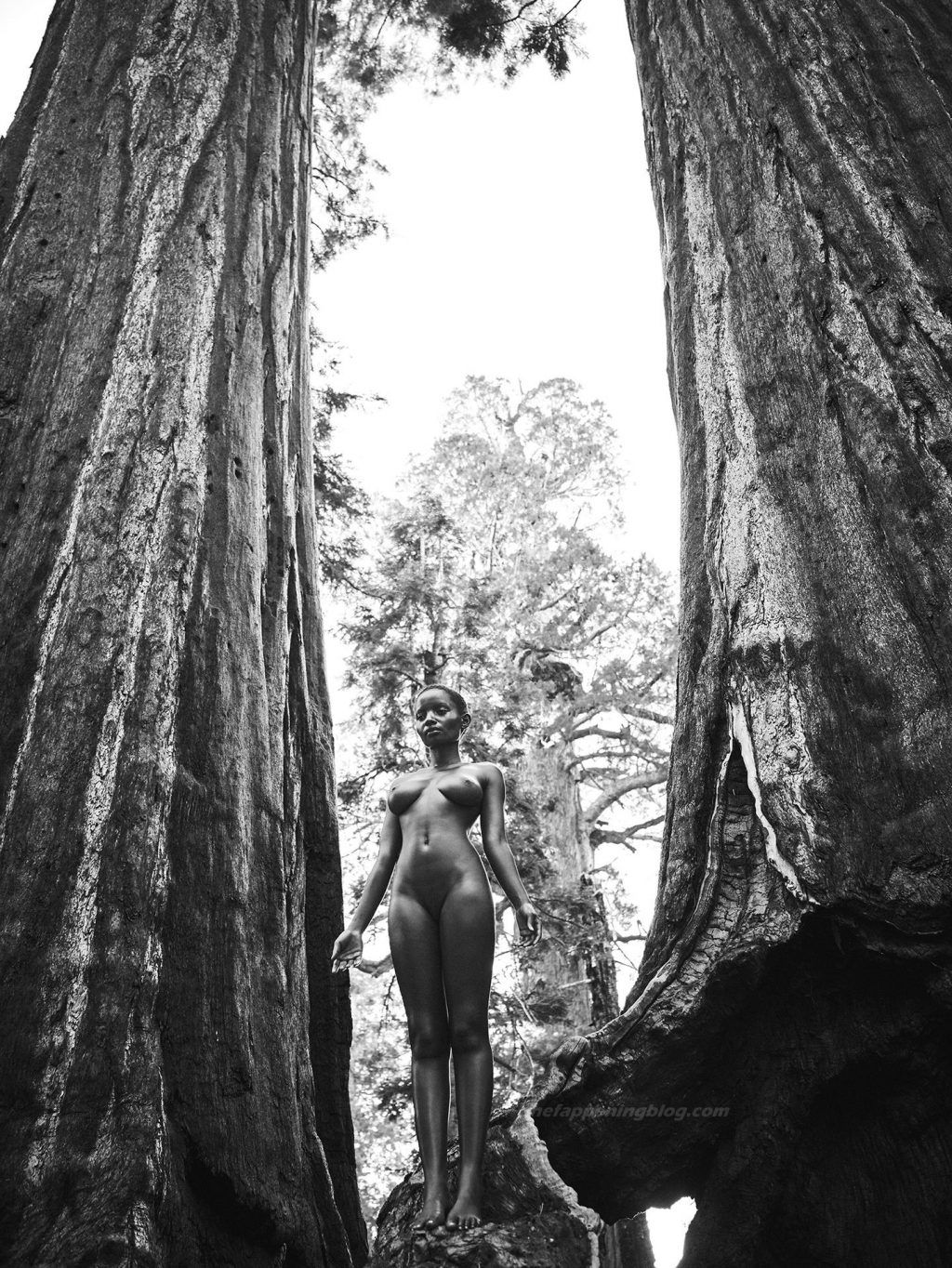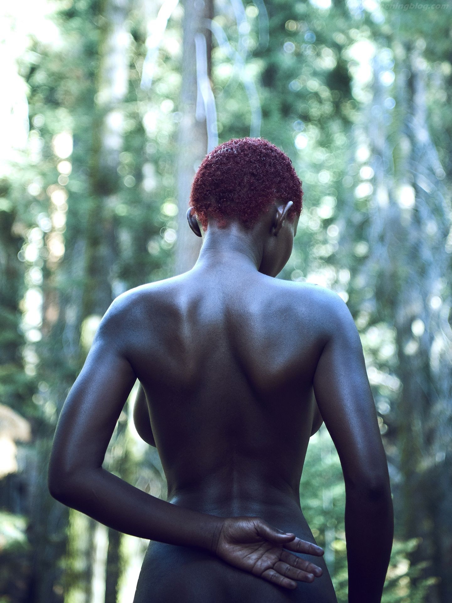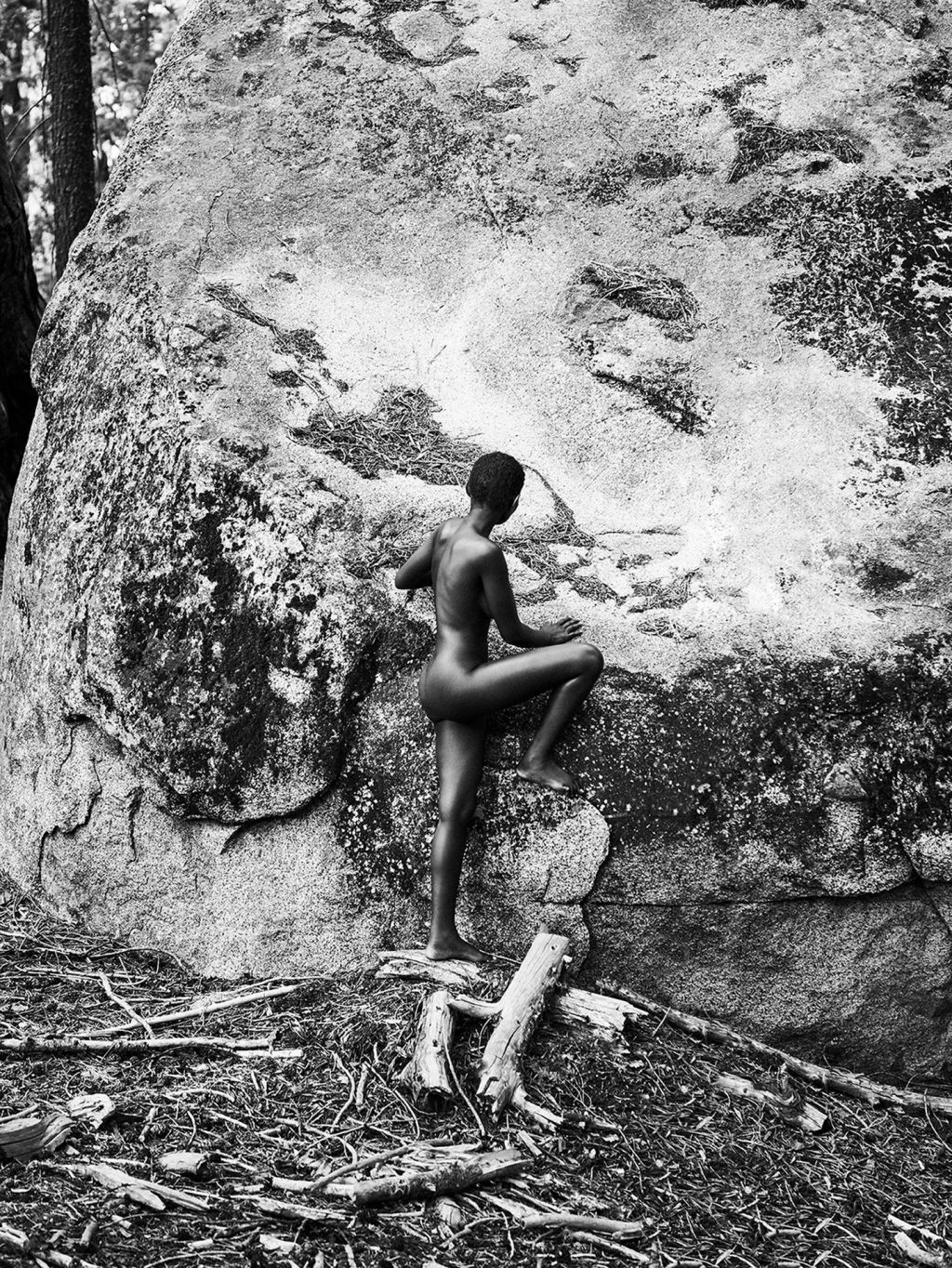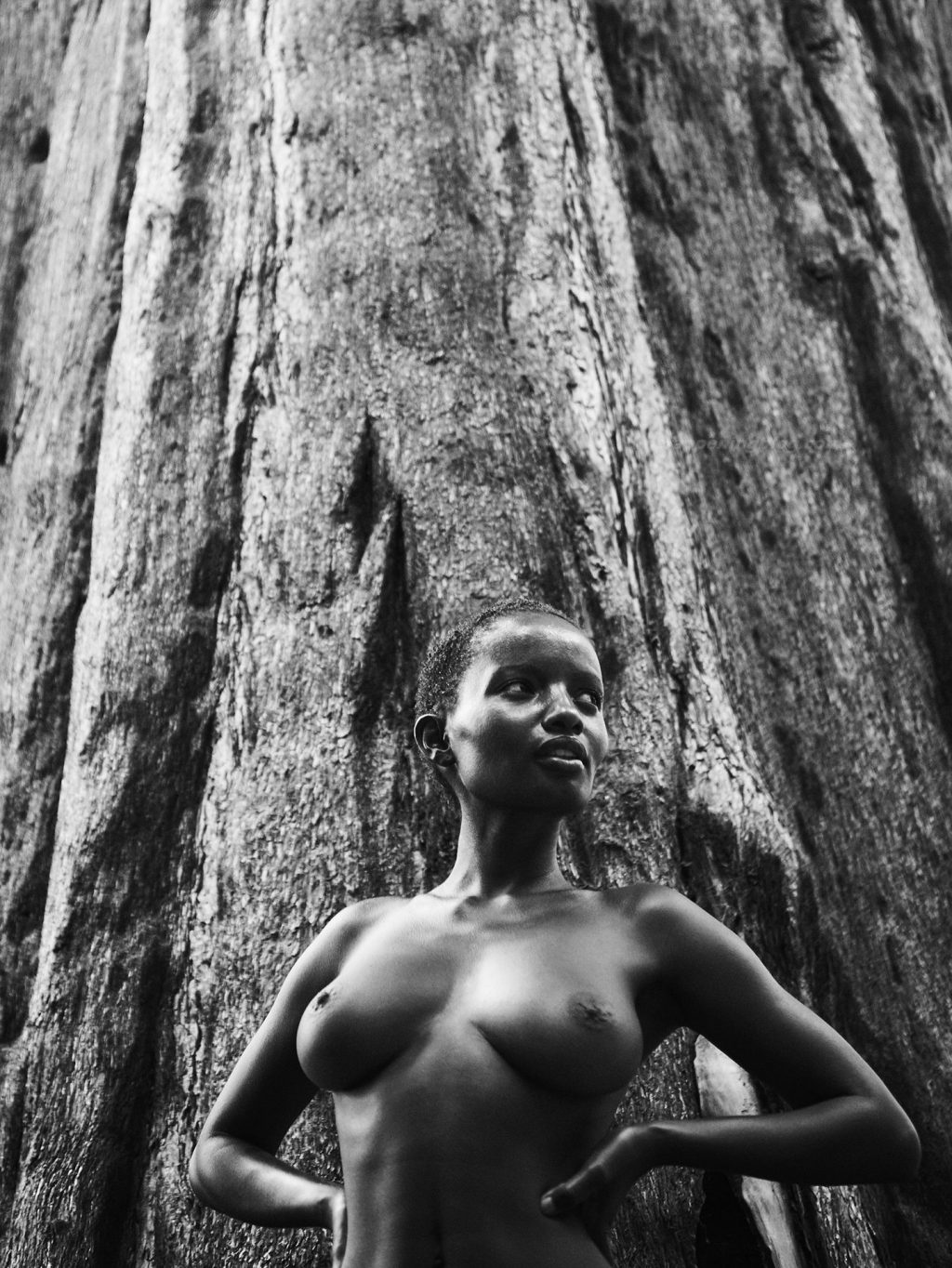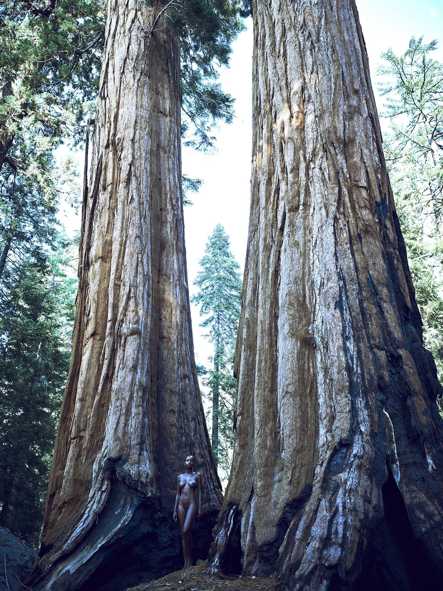 Belle modèle freelance rwandaise Shasta Wonder pose nue parmi les vieux arbres dans le parc national de Sequoia lors d’une séance photo nue par le photographe suisse Stefan Rappo (2017).