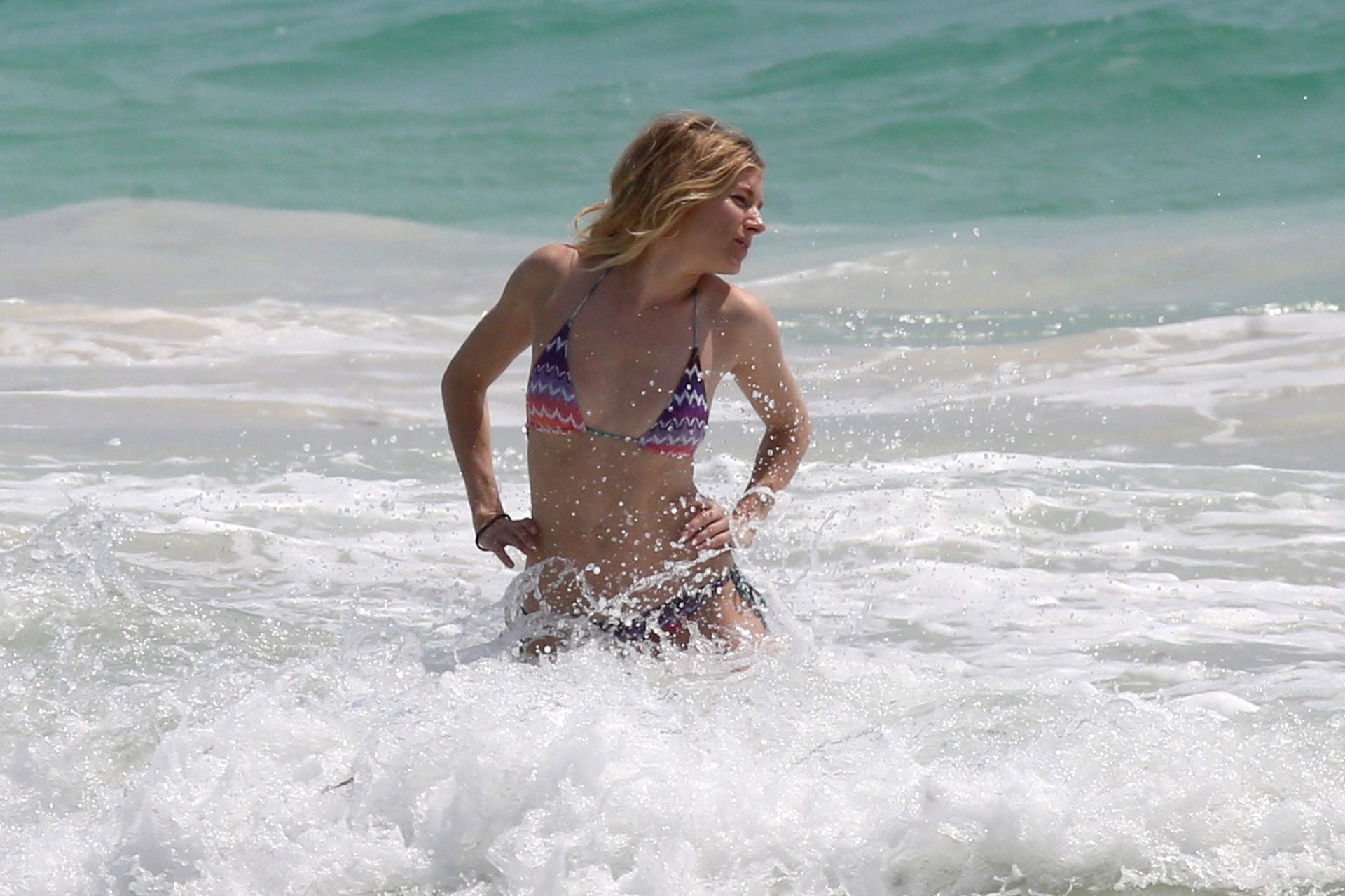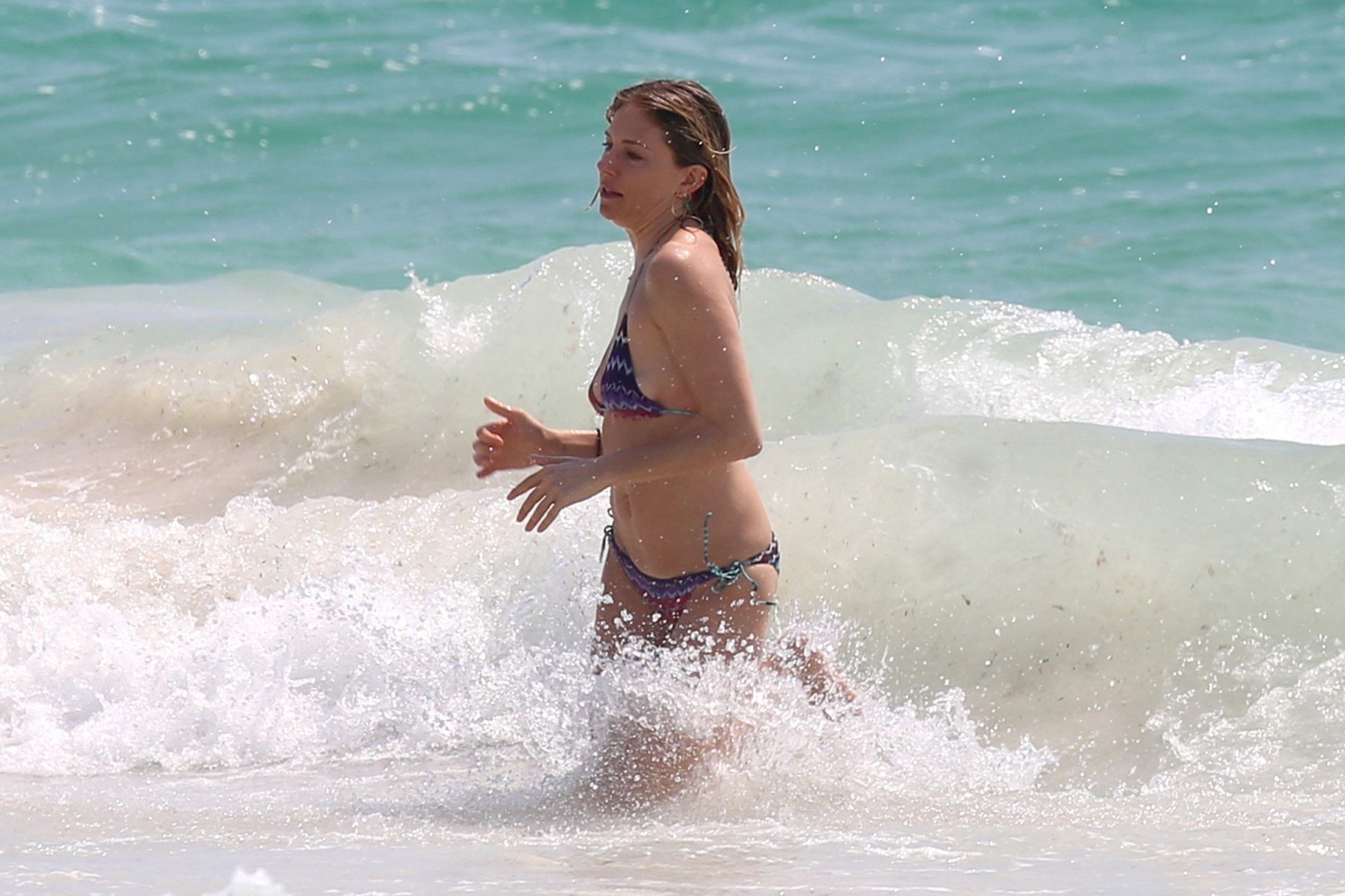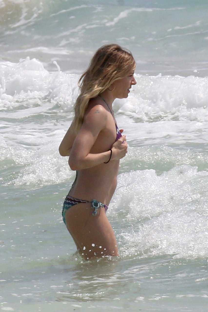 Sienna Miller porte un bikini coloré à la plage de Cancun, 05/04/2017. Sienna Miller est une actrice anglaise (High-Rise (2015)), mannequin et créatrice. Âge : 35 ans (née le 28 décembre 1981).