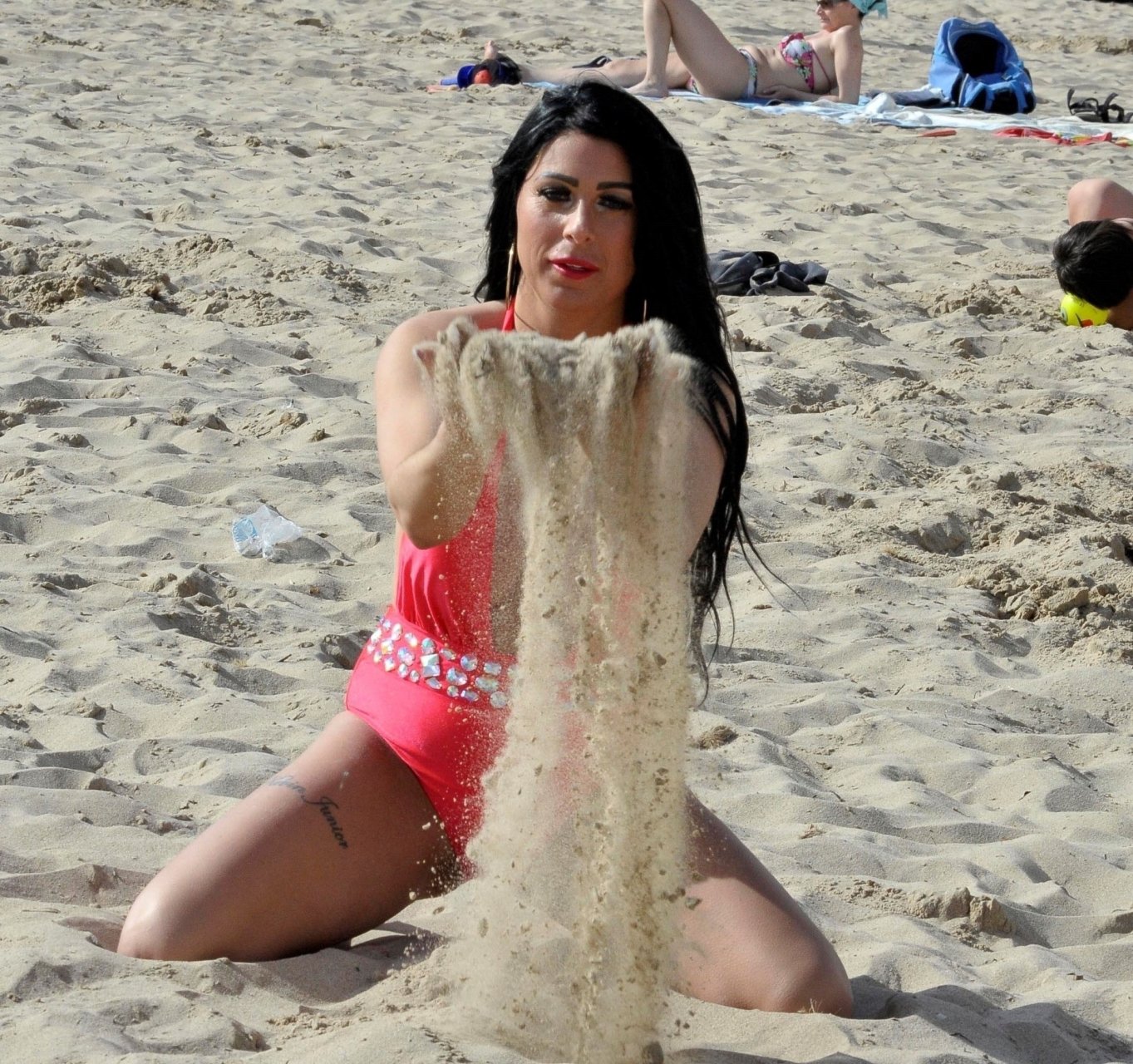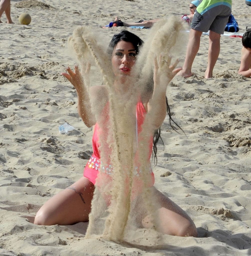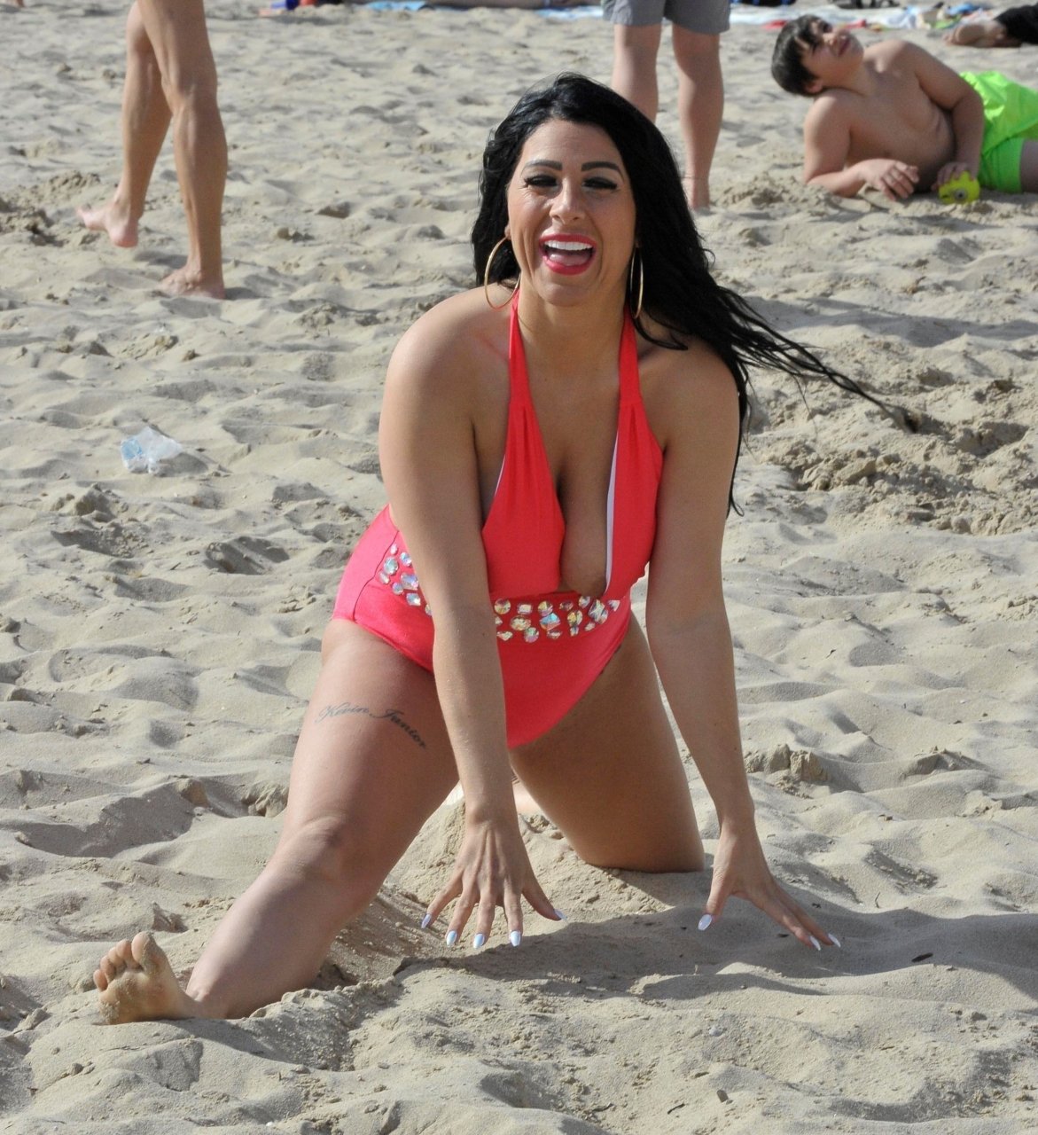 Busty Big Brother’s Simone Reed (28 ans, bikini rose) et la meilleure amie britannique de Paris Hilton, Chrissie Wunna (37 ans, bikini imprimé léopard), photographiées en train de s’amuser et de se chamailler sur la plage en Espagne, 04/12/2018.