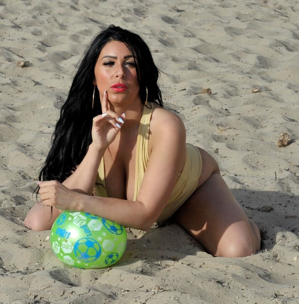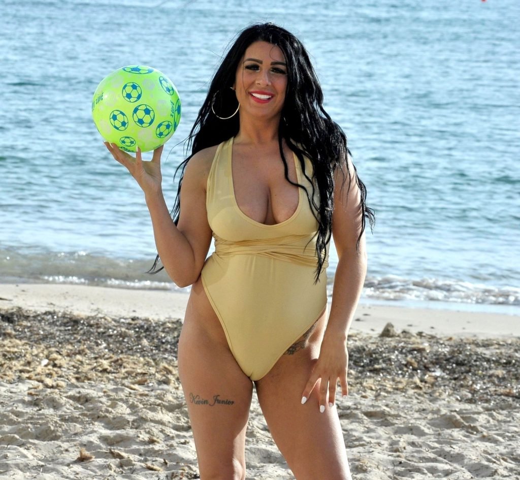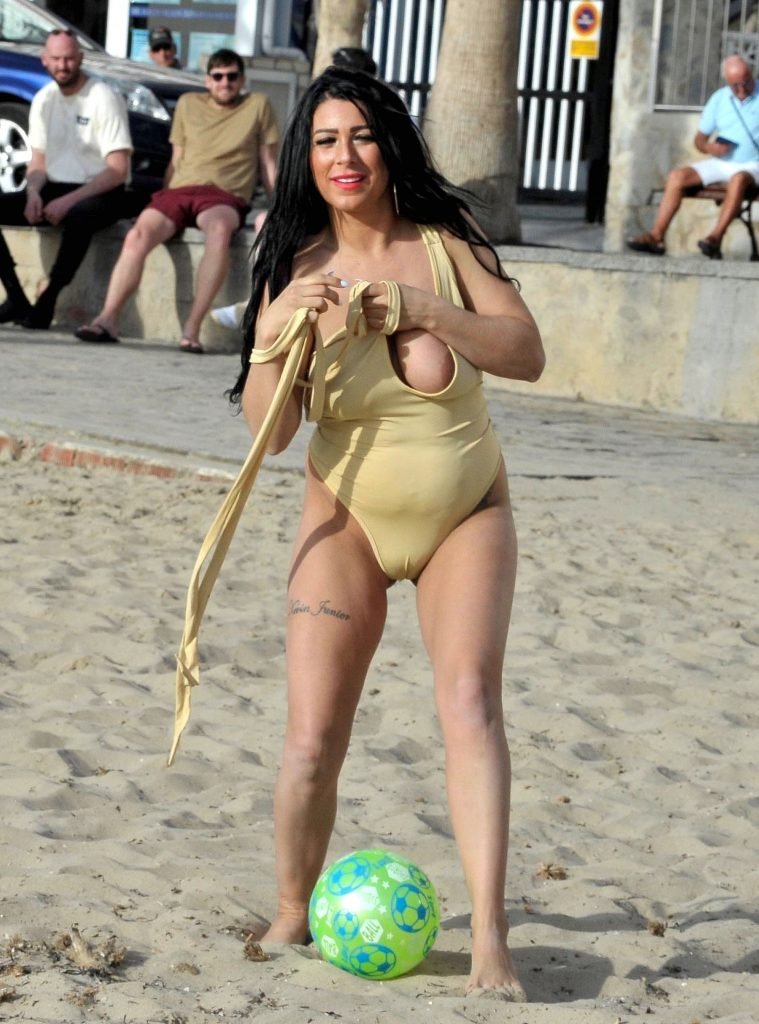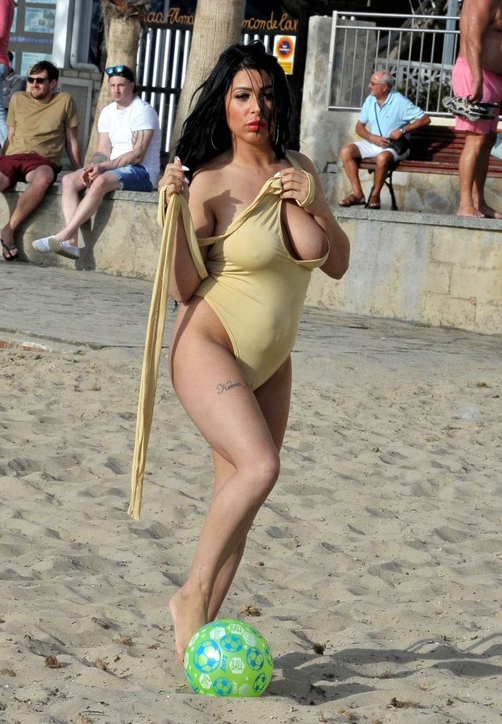 La star de Big Brother, la brune Simone Reed, s’amuse avec un ballon de football sur la plage, offrant un spectacle saisissant et voluptueux lors d’une escapade en Espagne, 17/05/2018.