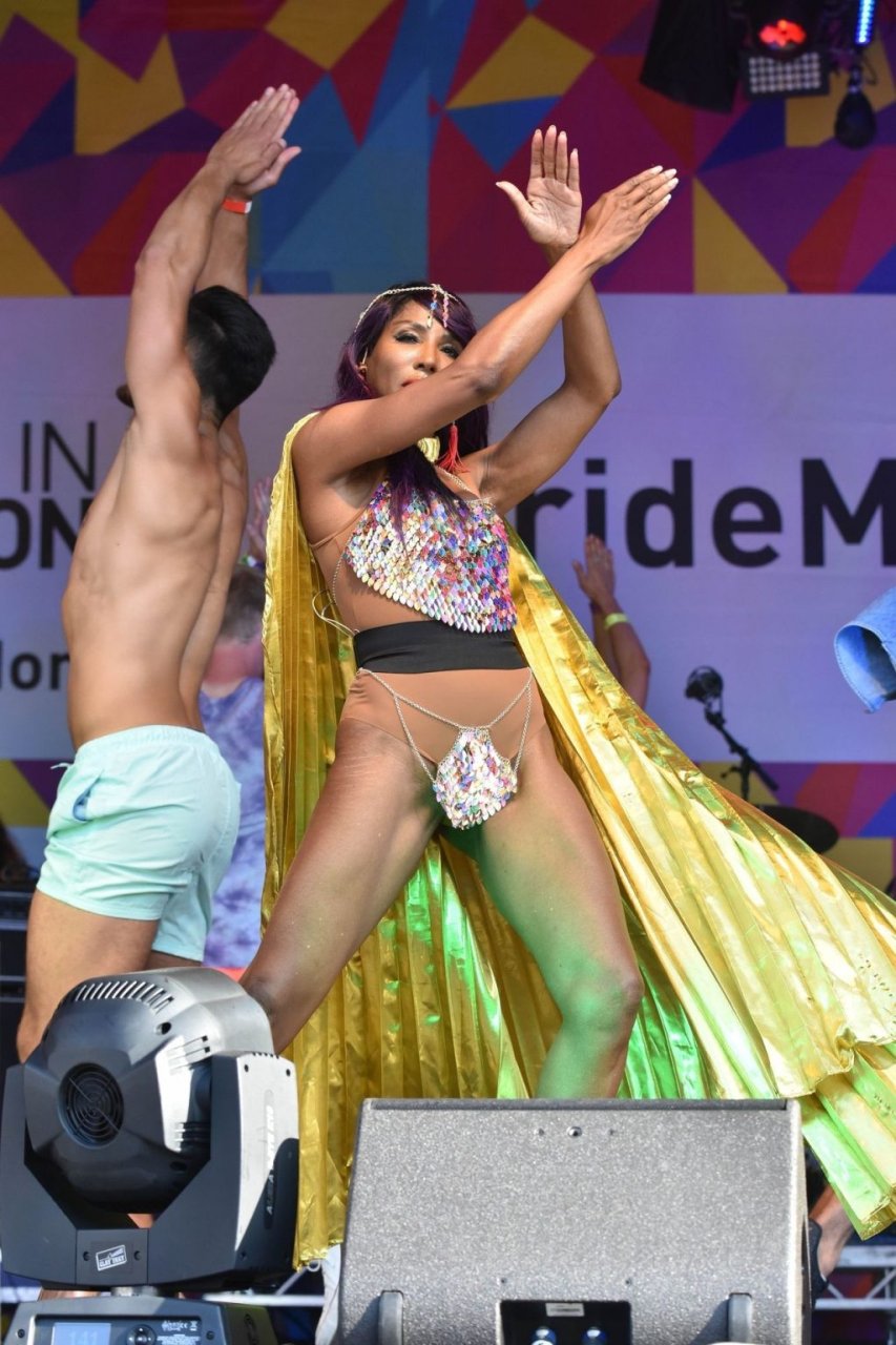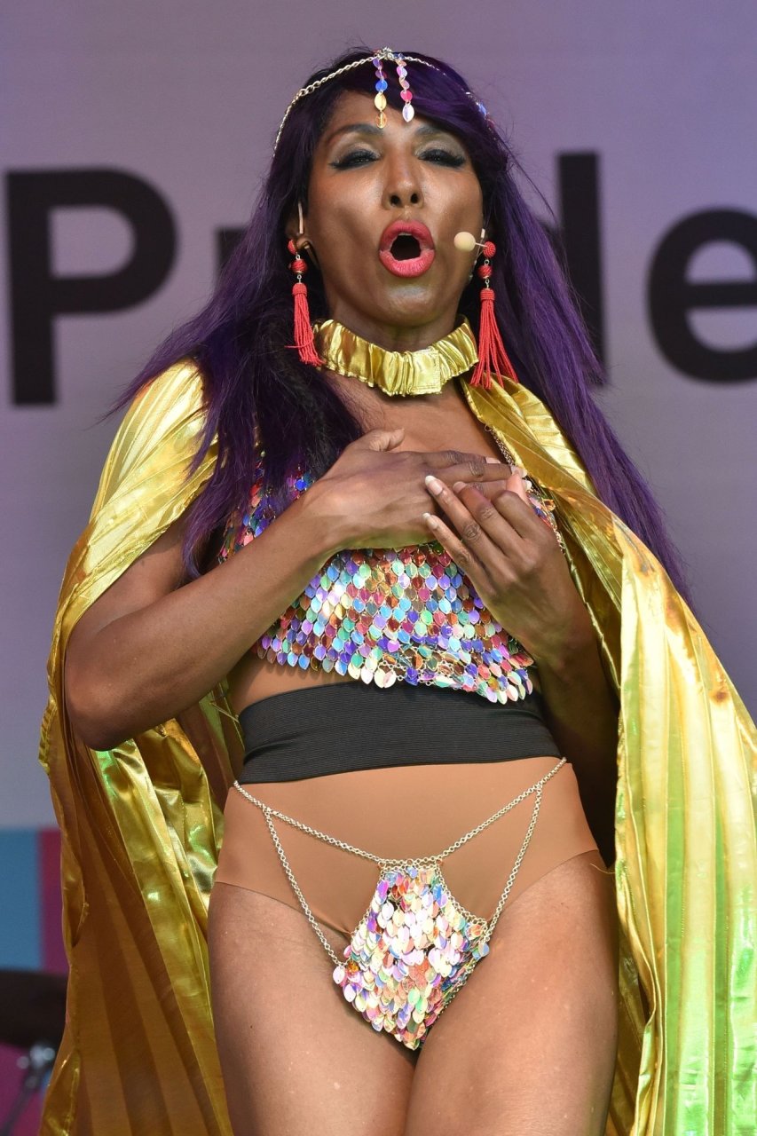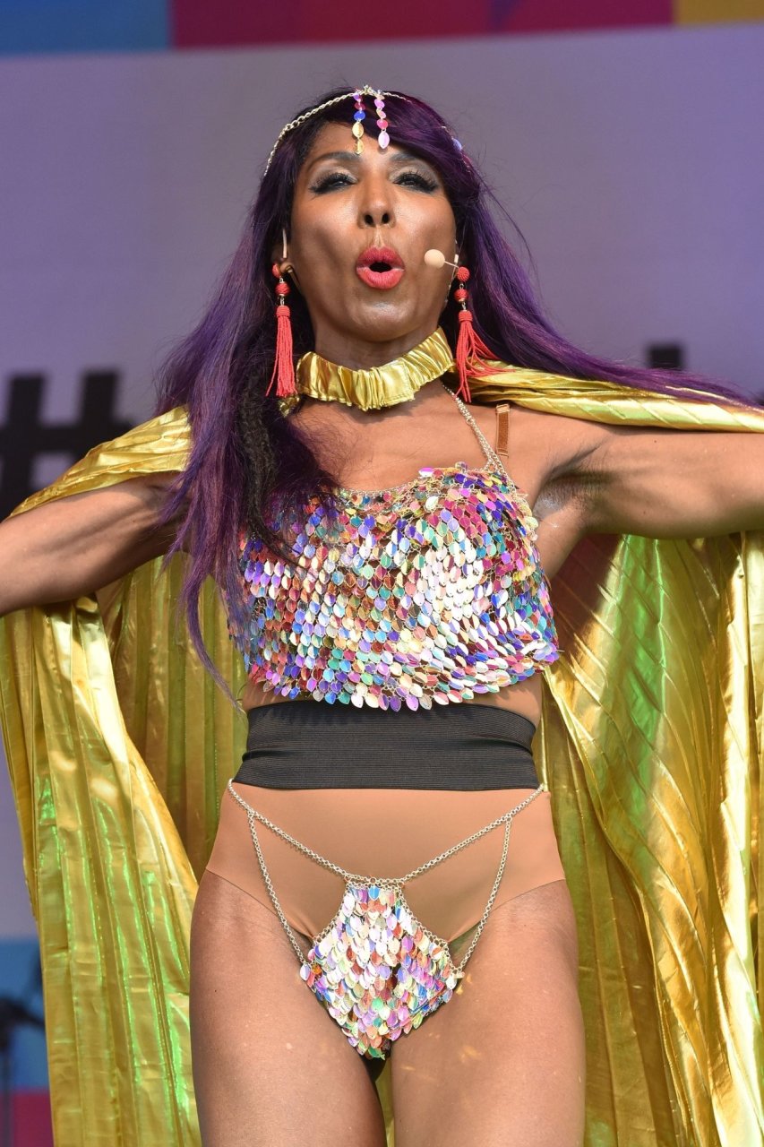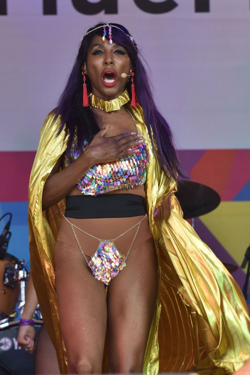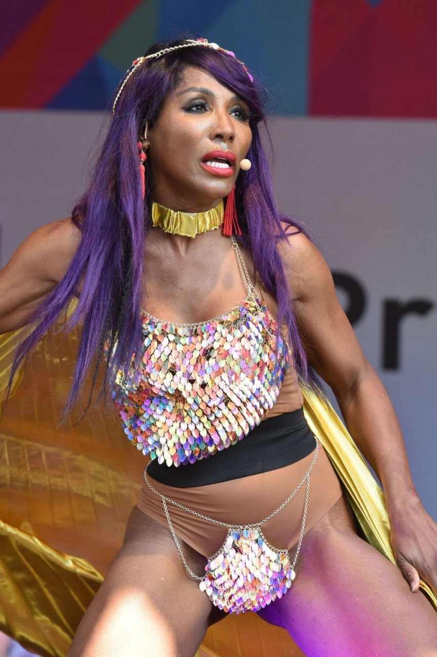 Sinitta a été photographiée en train de se produire sur la scène principale lors de la Pride à Londres sur Trafalgar Square, le 07/07/2018. Nous avons déjà vu des photos nues de Sinitta auparavant, mais ce jour-là, elle a offert un spectacle chaud. La femme noire de 55 ans portait une tenue étrange avec un morceau de tissu sur son sexe.