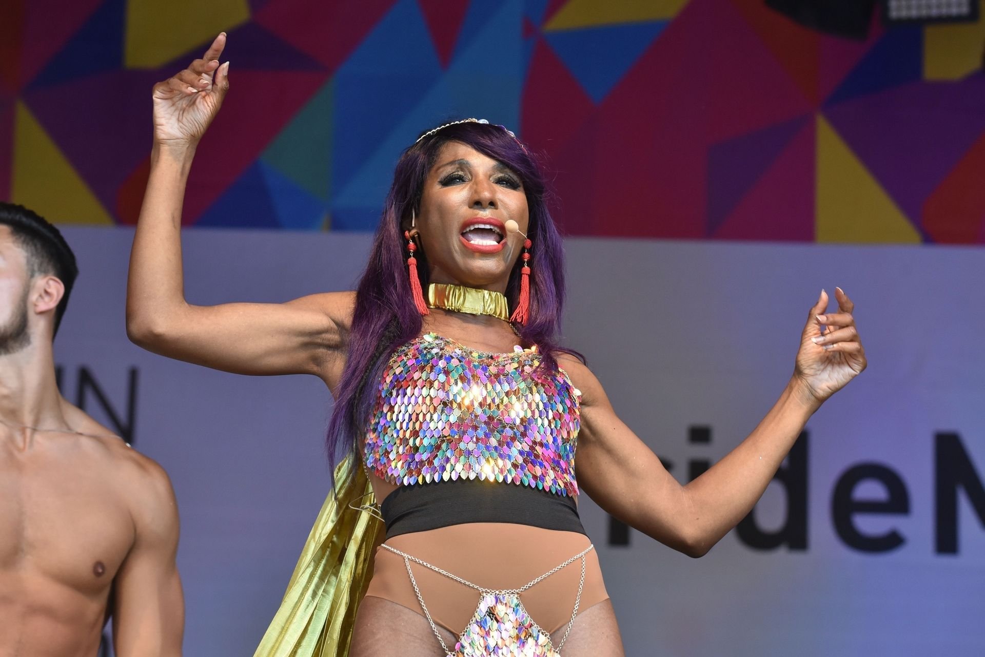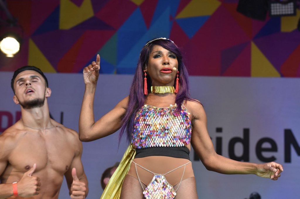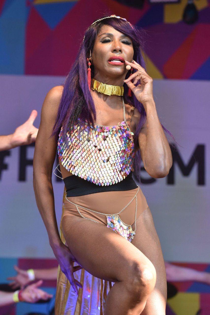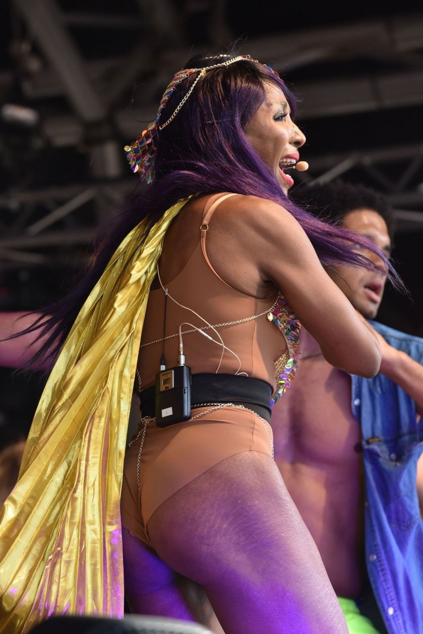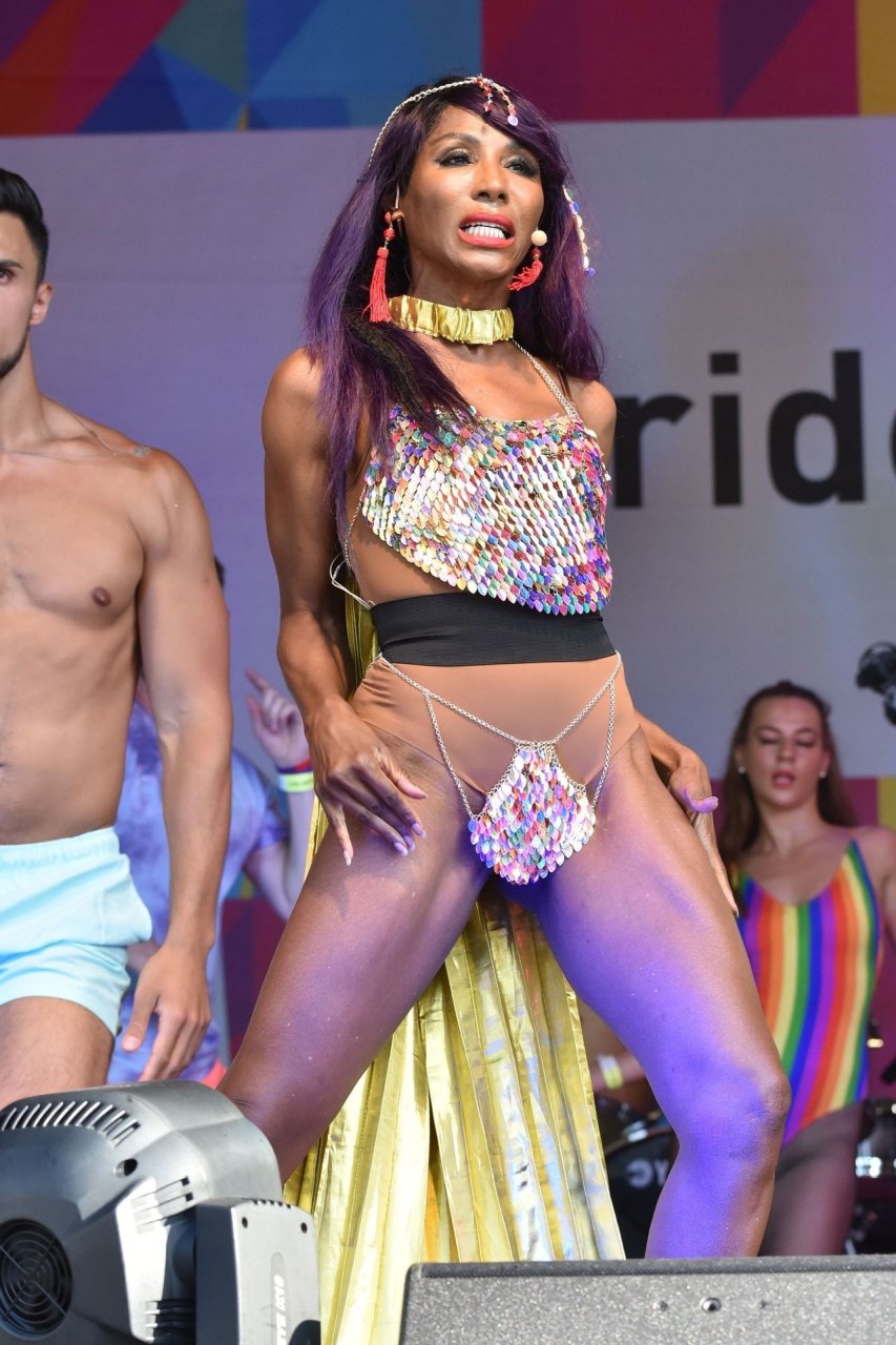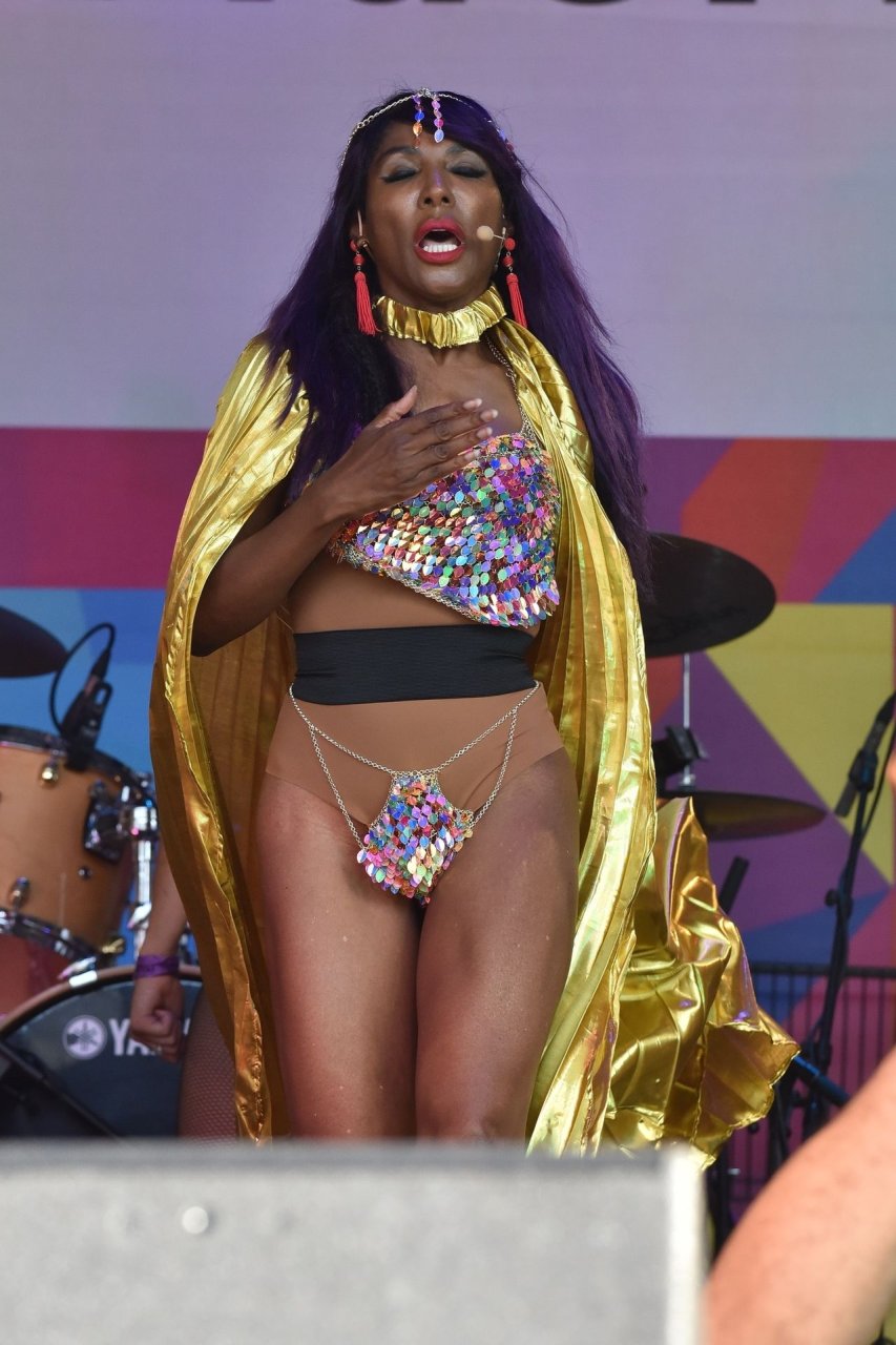 Sinitta a été photographiée en train de se produire sur la scène principale lors de la Pride à Londres sur Trafalgar Square, le 07/07/2018. Nous avons déjà vu des photos nues de Sinitta auparavant, mais ce jour-là, elle a offert un spectacle chaud. La femme noire de 55 ans portait une tenue étrange avec un morceau de tissu sur son sexe.