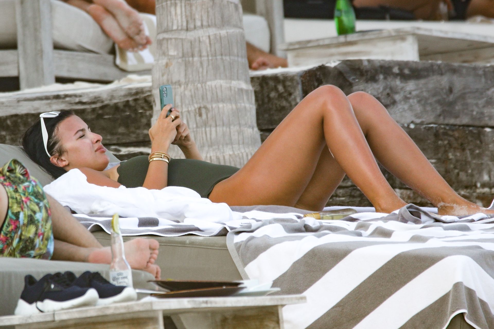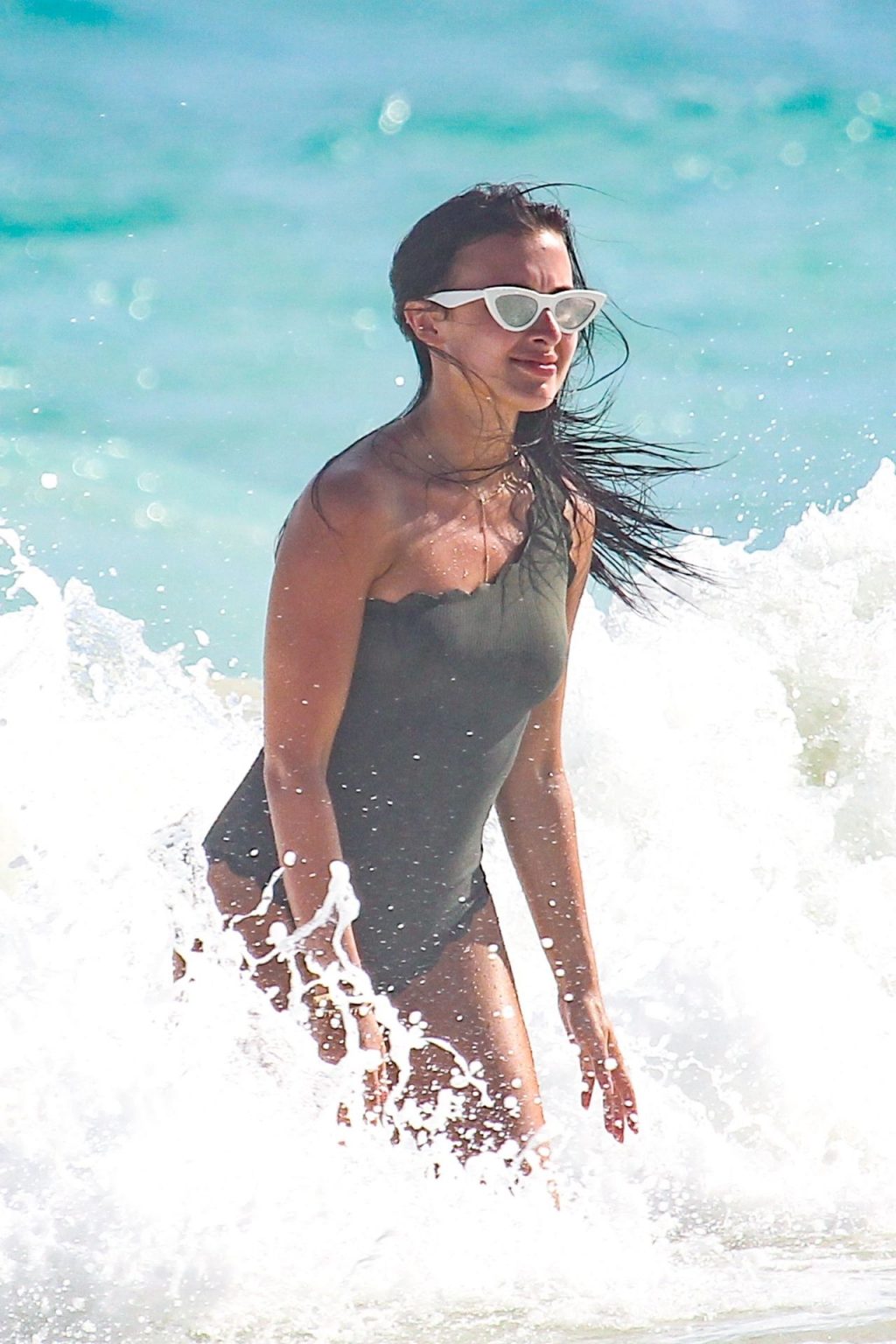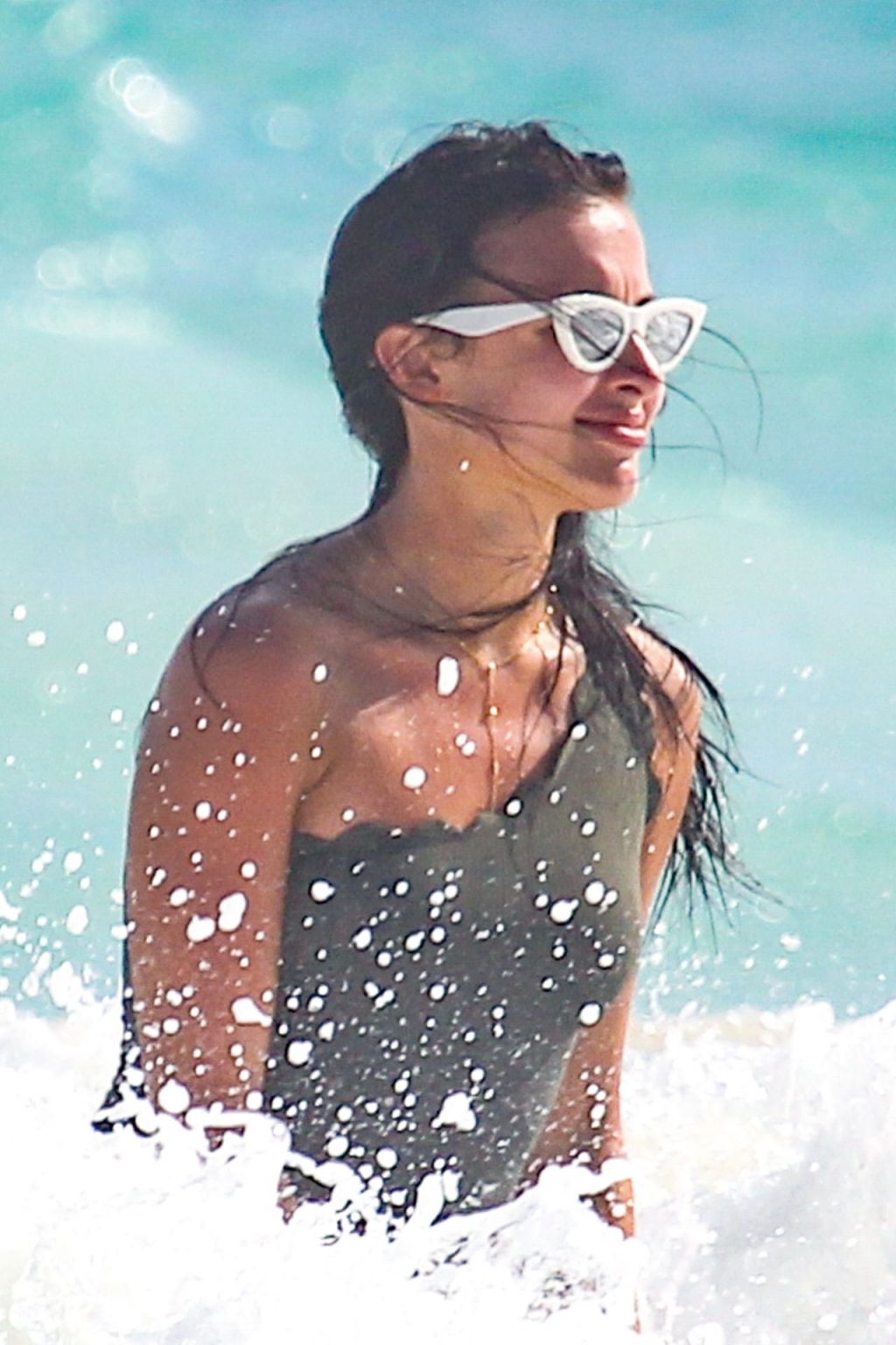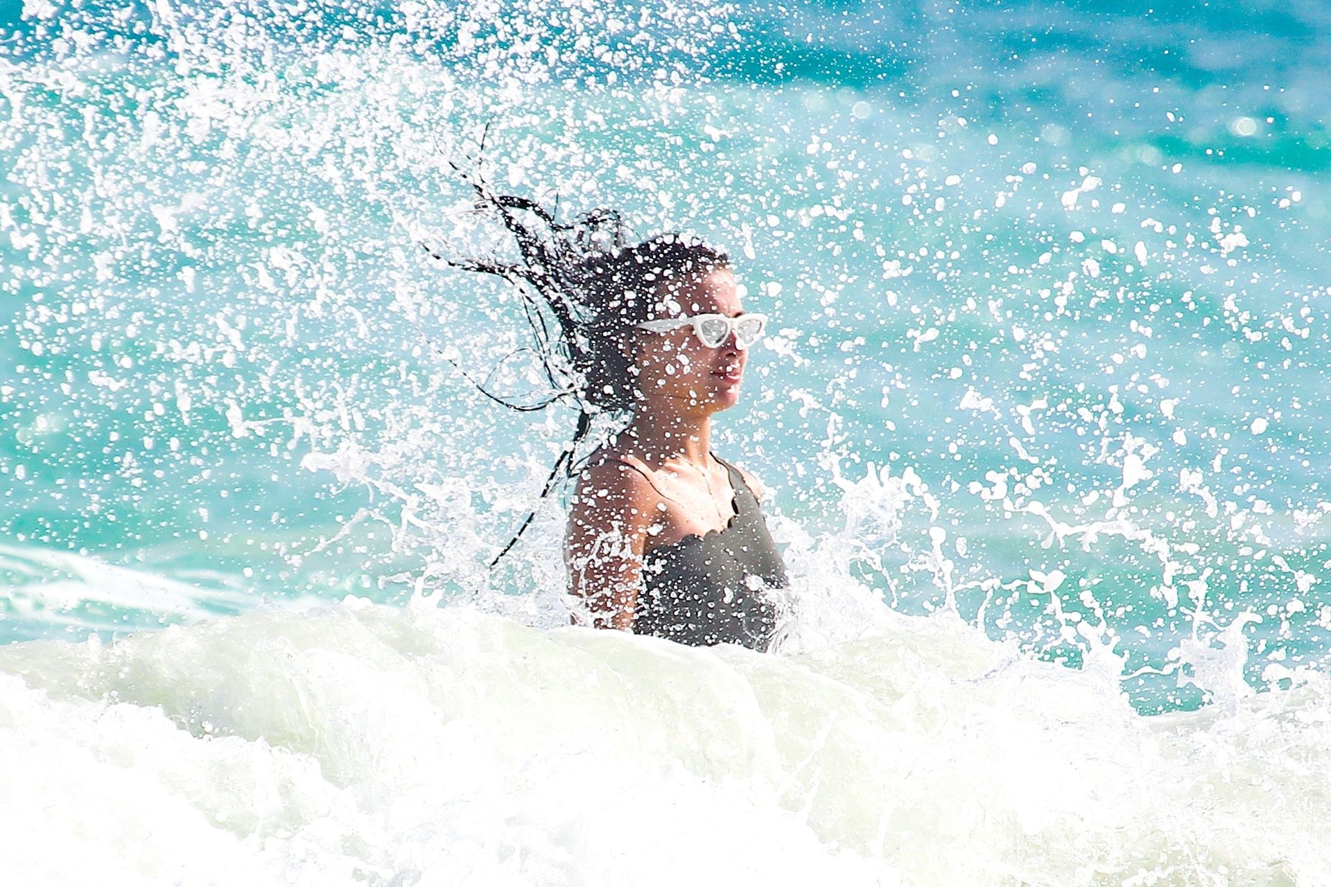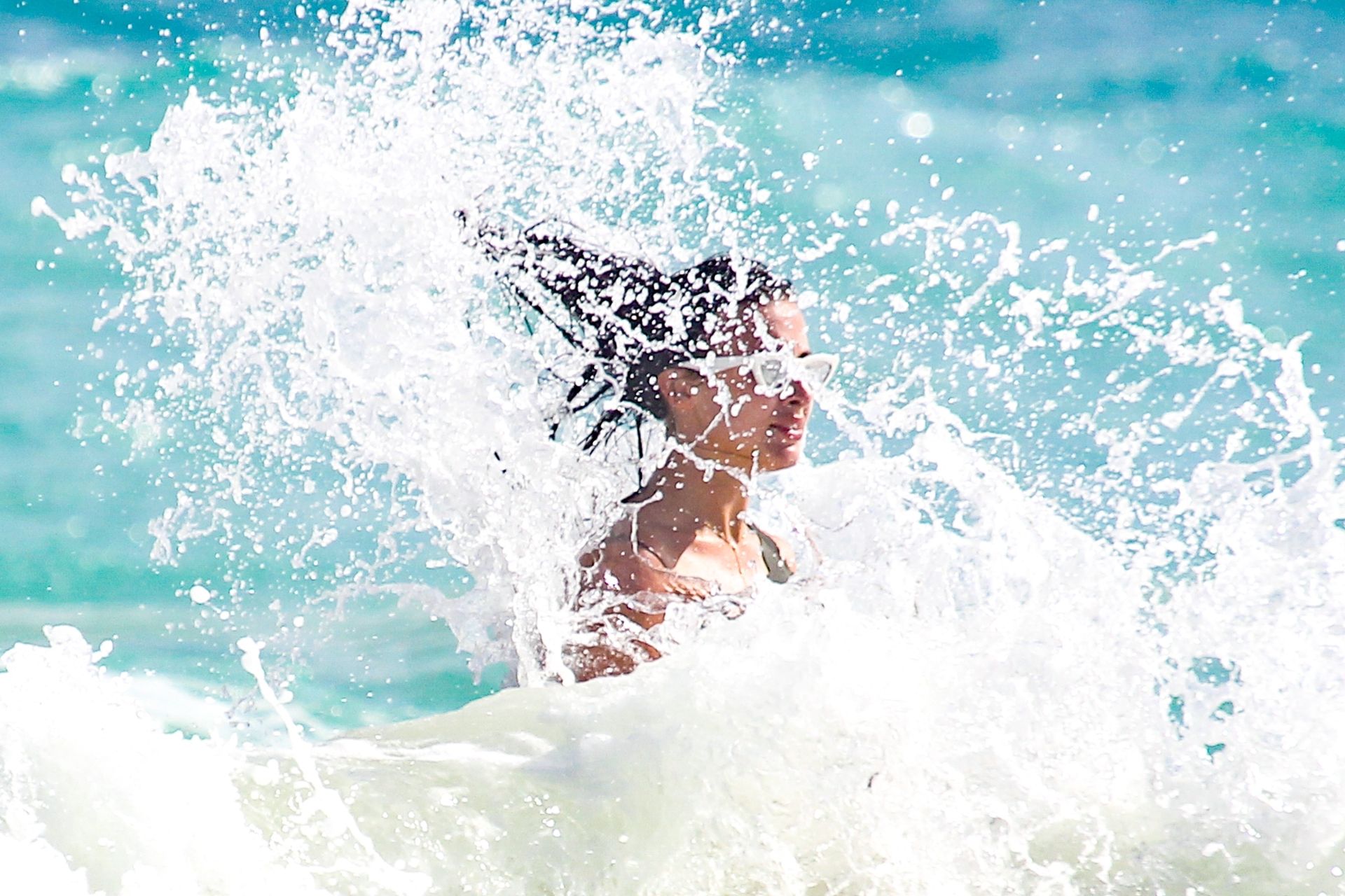 Sexy Miss Russie 2015 Sofia Nikitchuk enfile un bikini sexy pour une journée à la plage à Tulum (2020). Le mannequin entre timidement dans l’eau et laisse les vagues s’écraser sur elle.