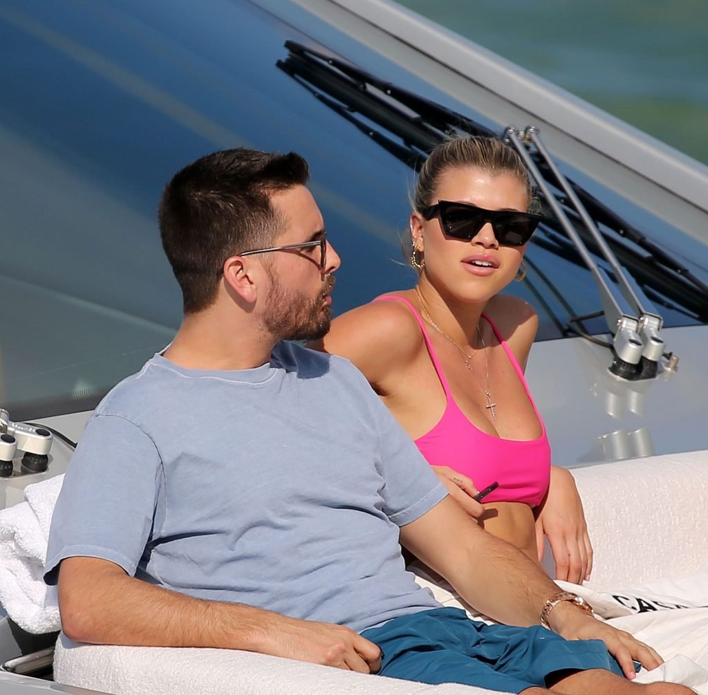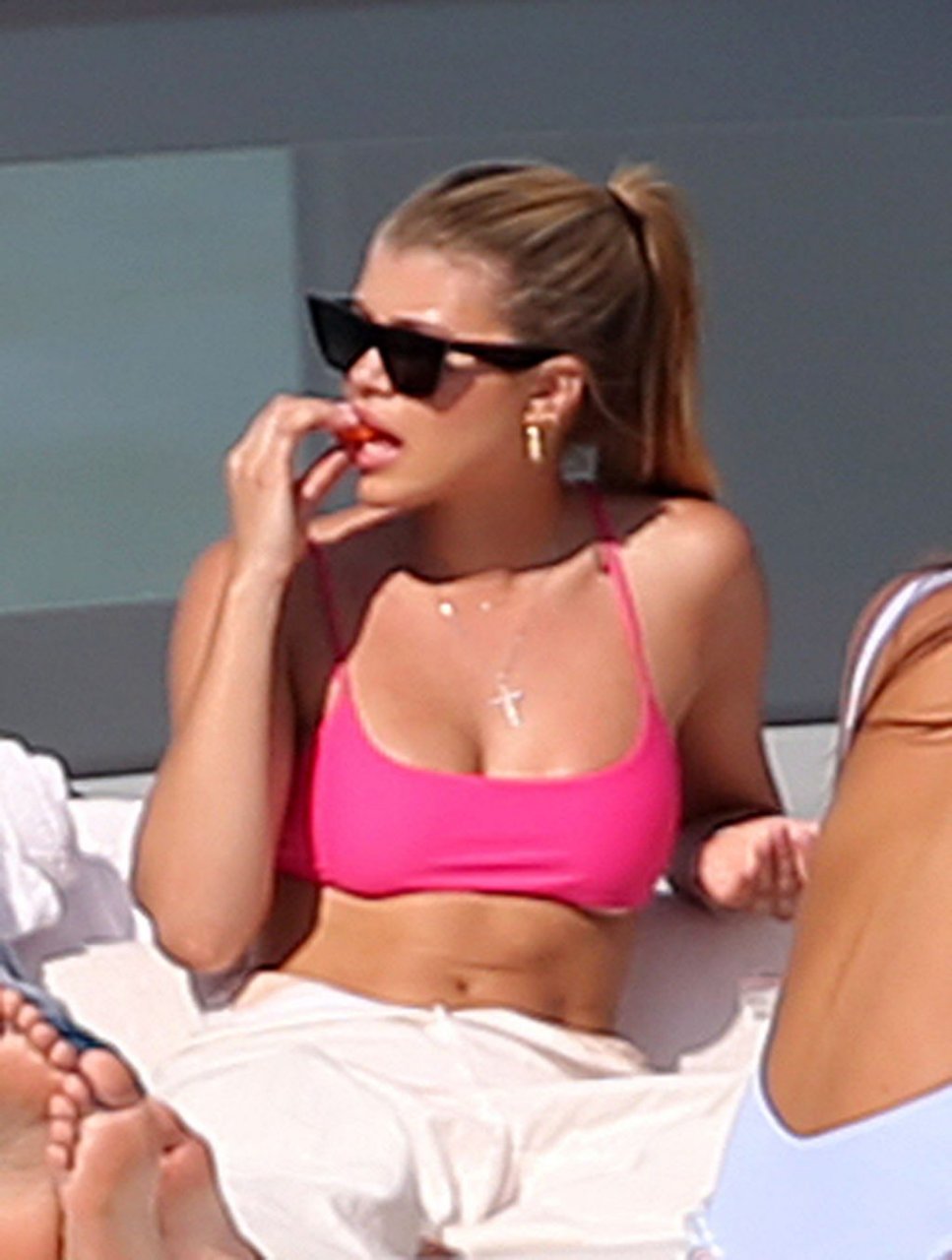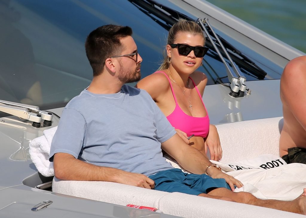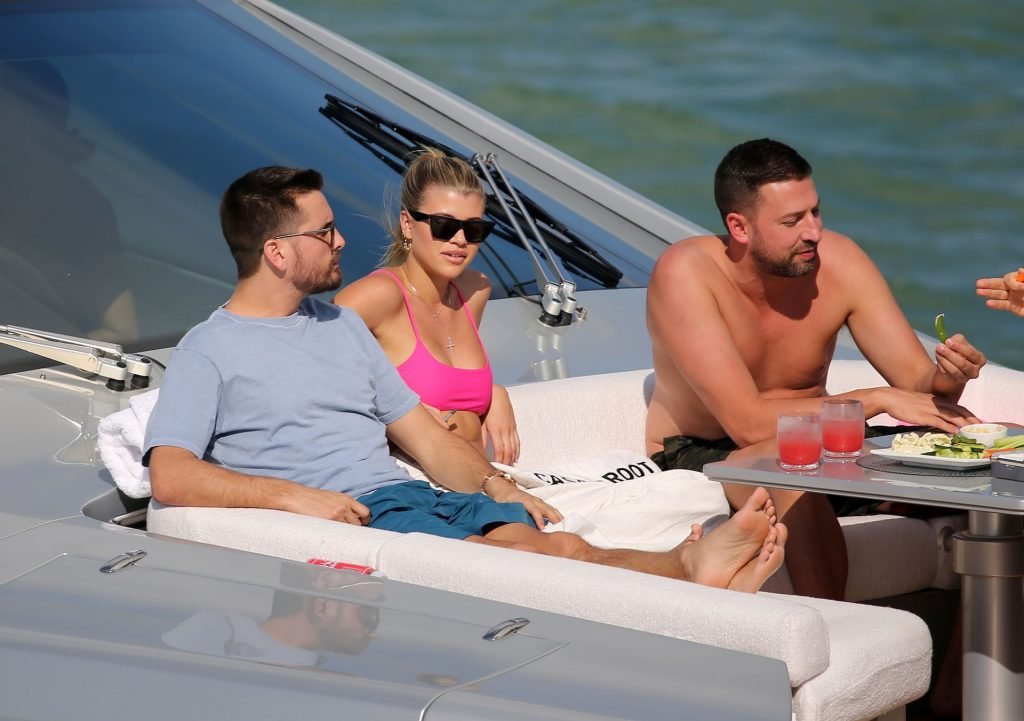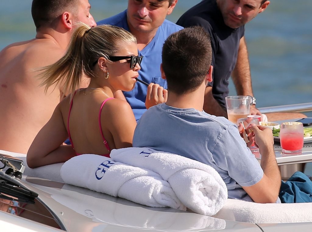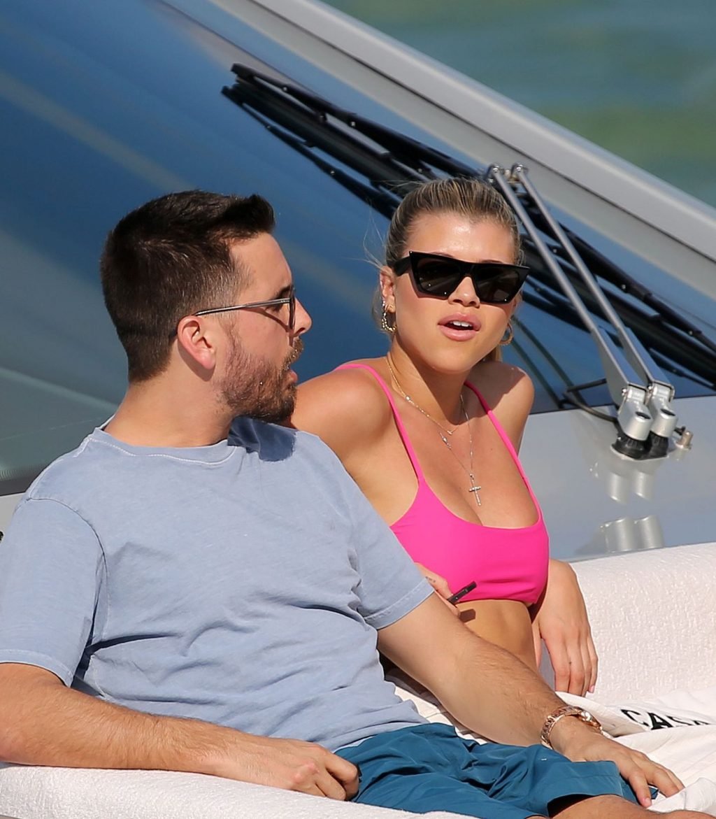 Model Sofia Richie porte un haut de bikini rose vif alors qu’elle se détend sur un yacht avec son petit ami Scott Disick à Miami, 17/02/2019.