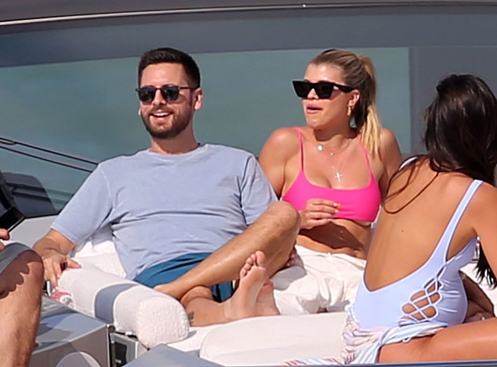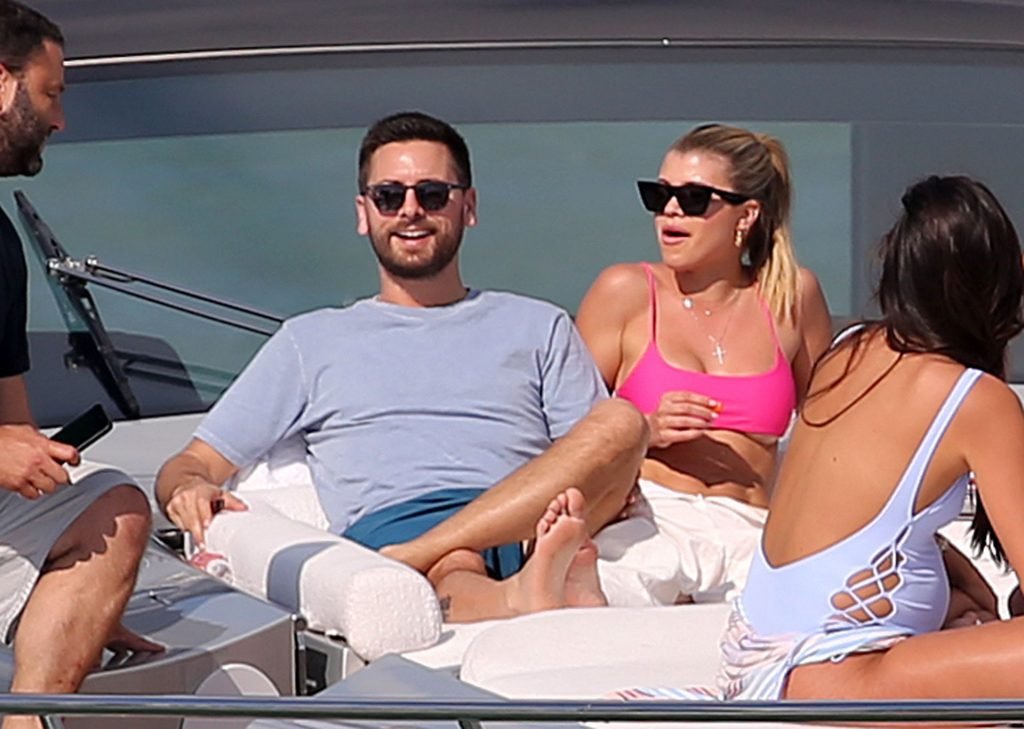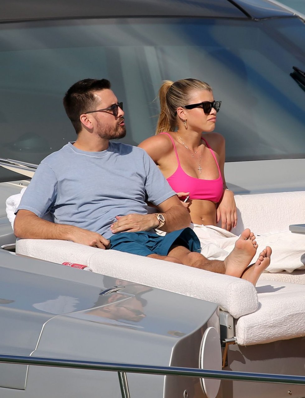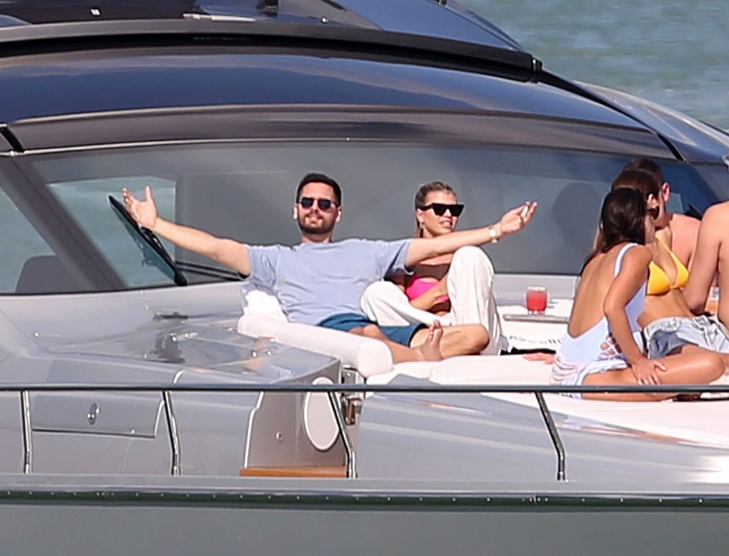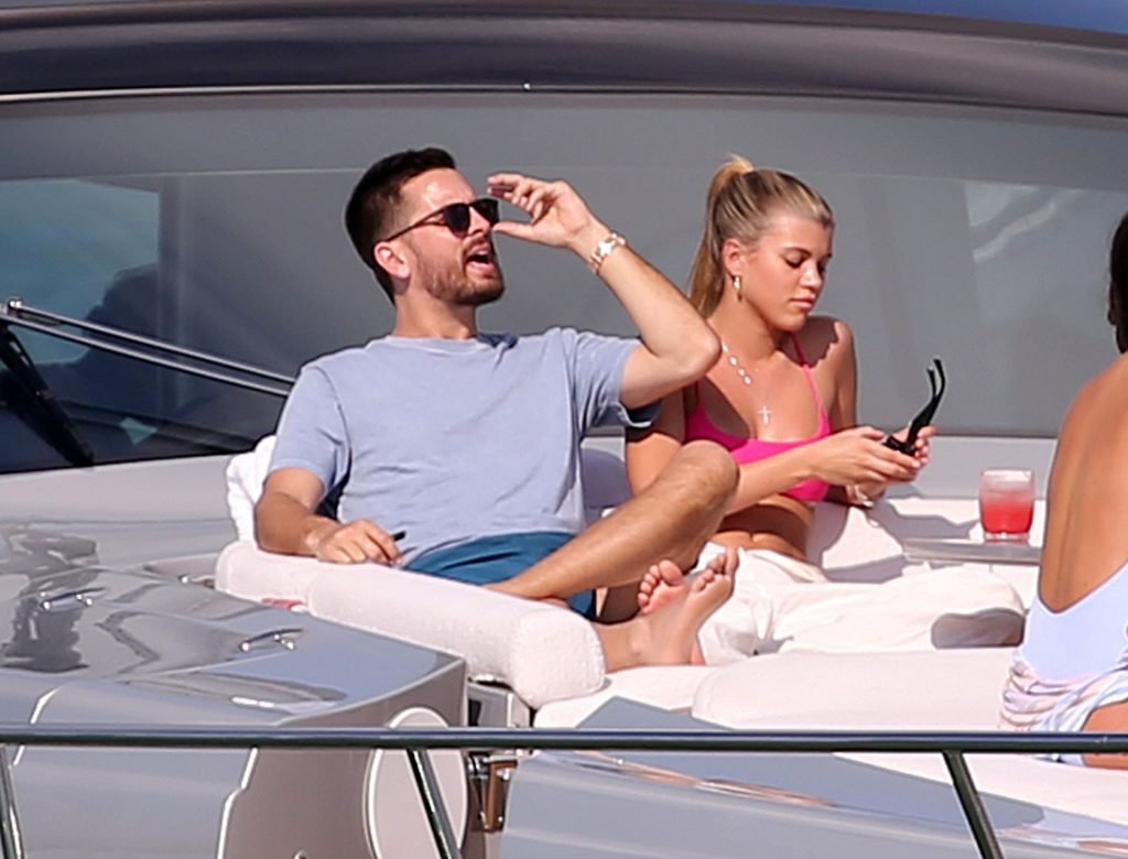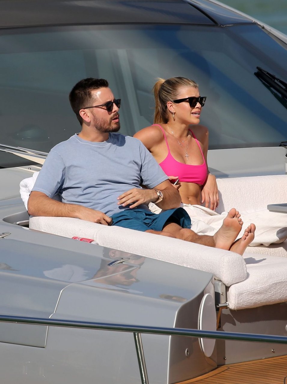 Model Sofia Richie porte un haut de bikini rose vif alors qu’elle se détend sur un yacht avec son petit ami Scott Disick à Miami, 17/02/2019.