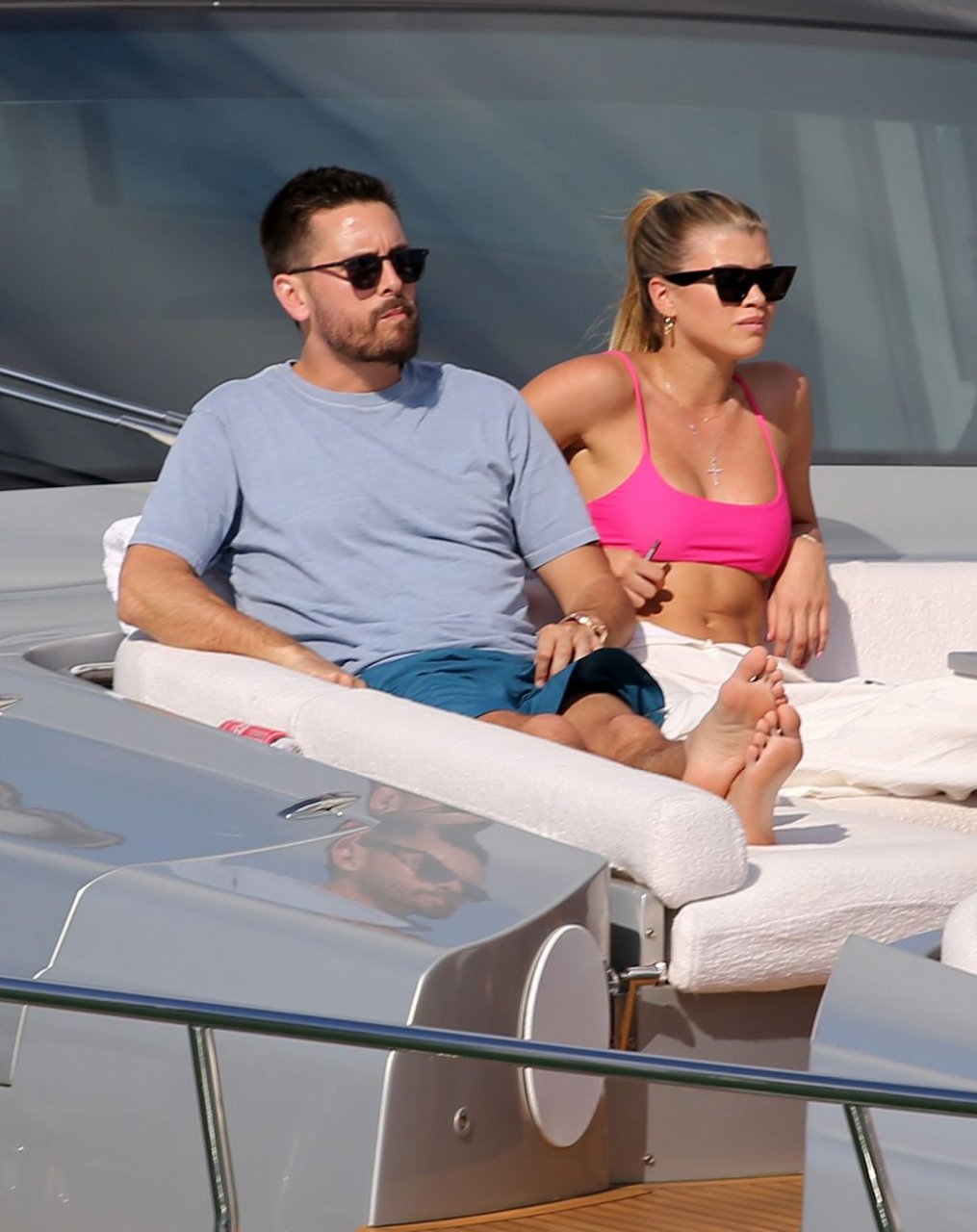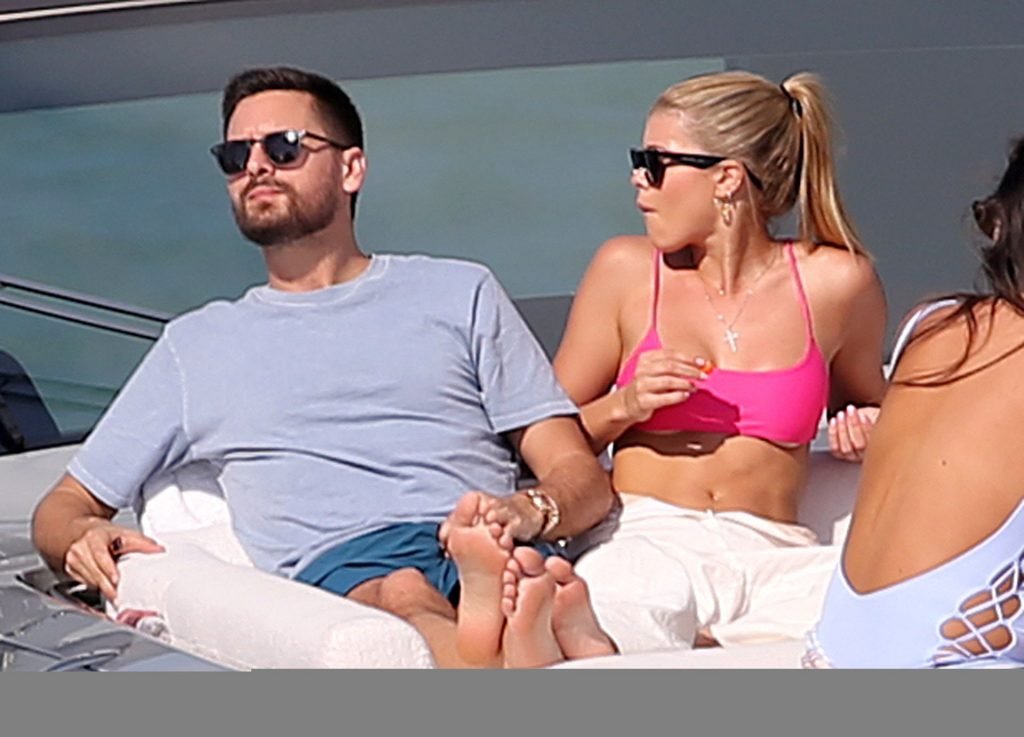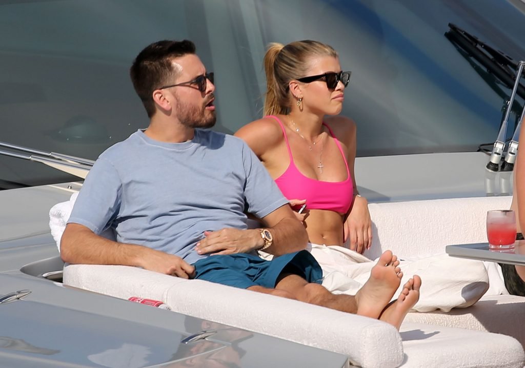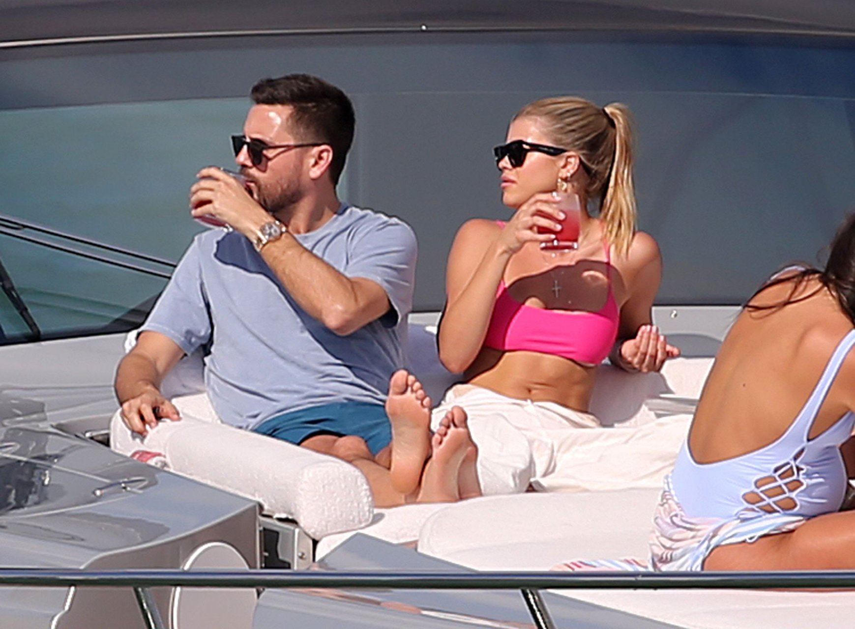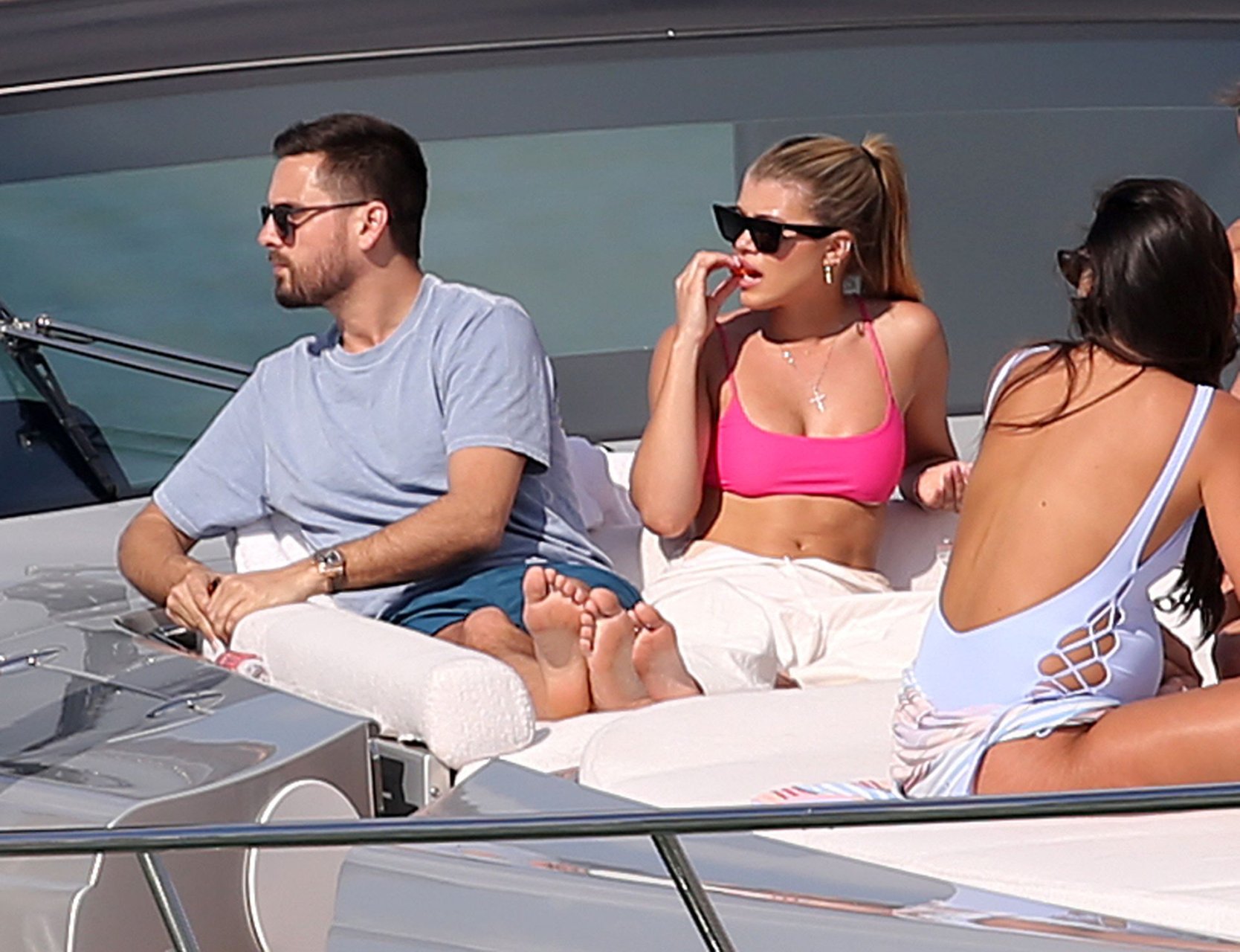 Model Sofia Richie porte un haut de bikini rose vif alors qu’elle se détend sur un yacht avec son petit ami Scott Disick à Miami, 17/02/2019.