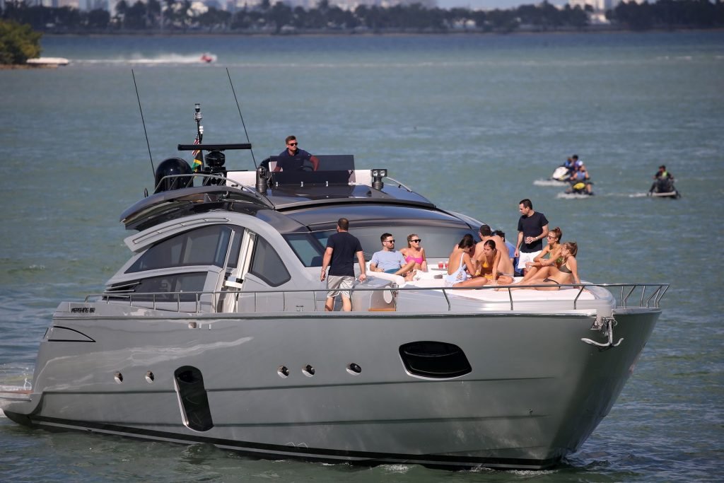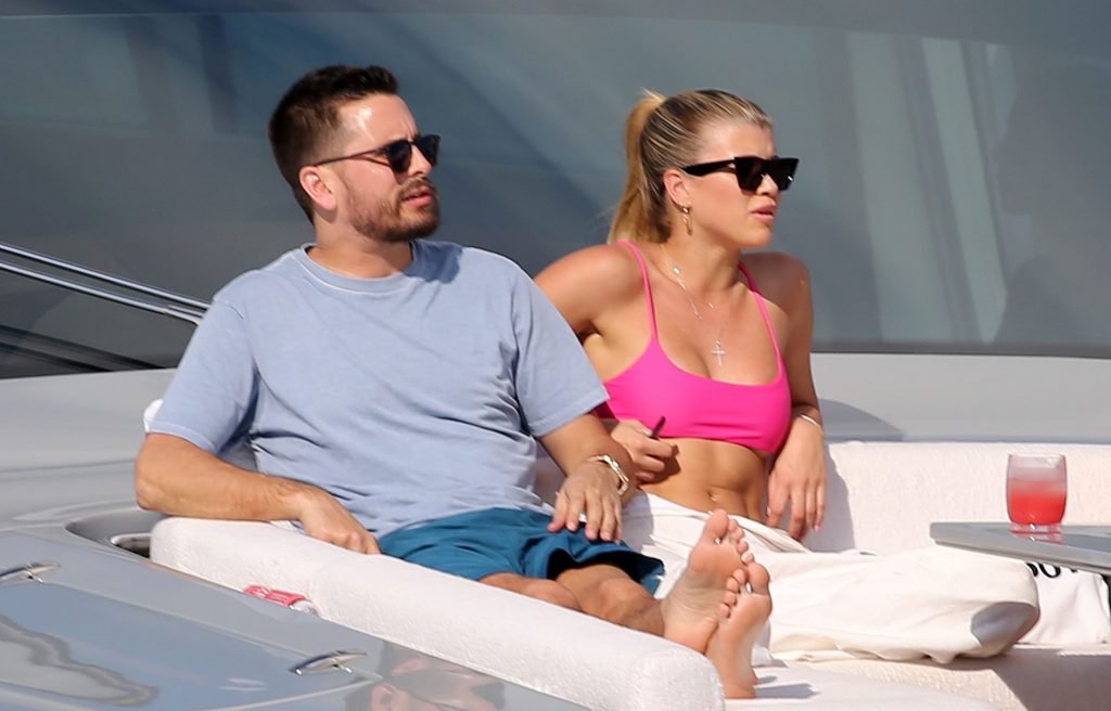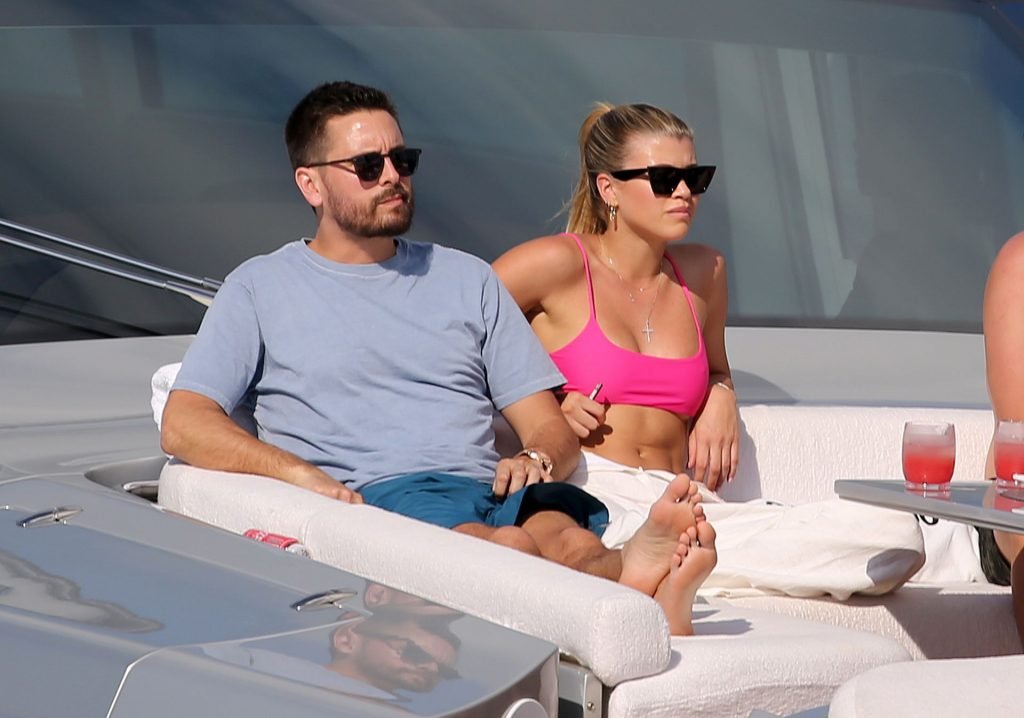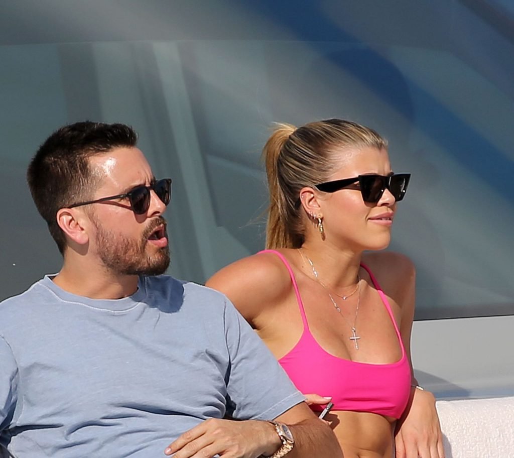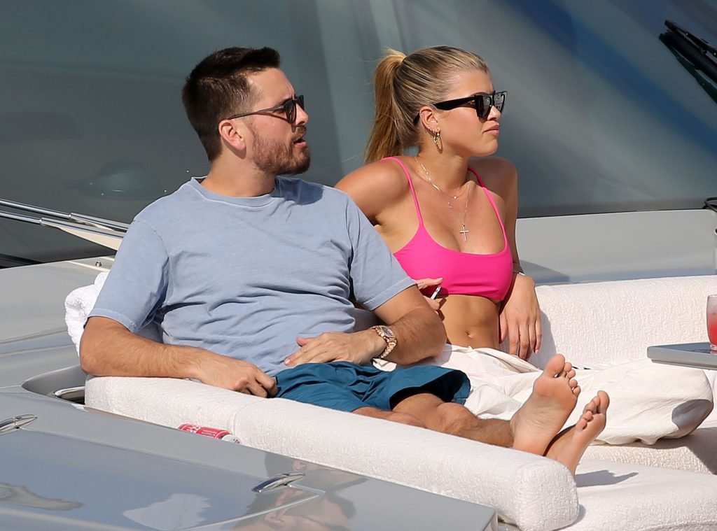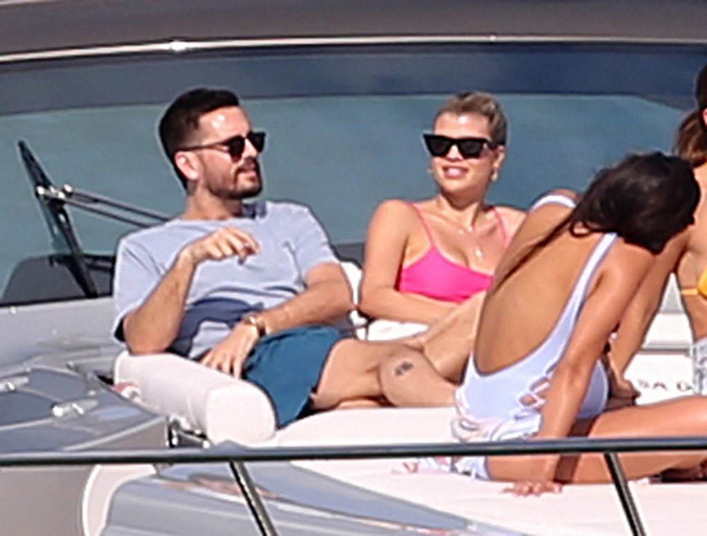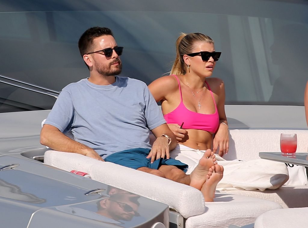 Model Sofia Richie porte un haut de bikini rose vif alors qu’elle se détend sur un yacht avec son petit ami Scott Disick à Miami, 17/02/2019.