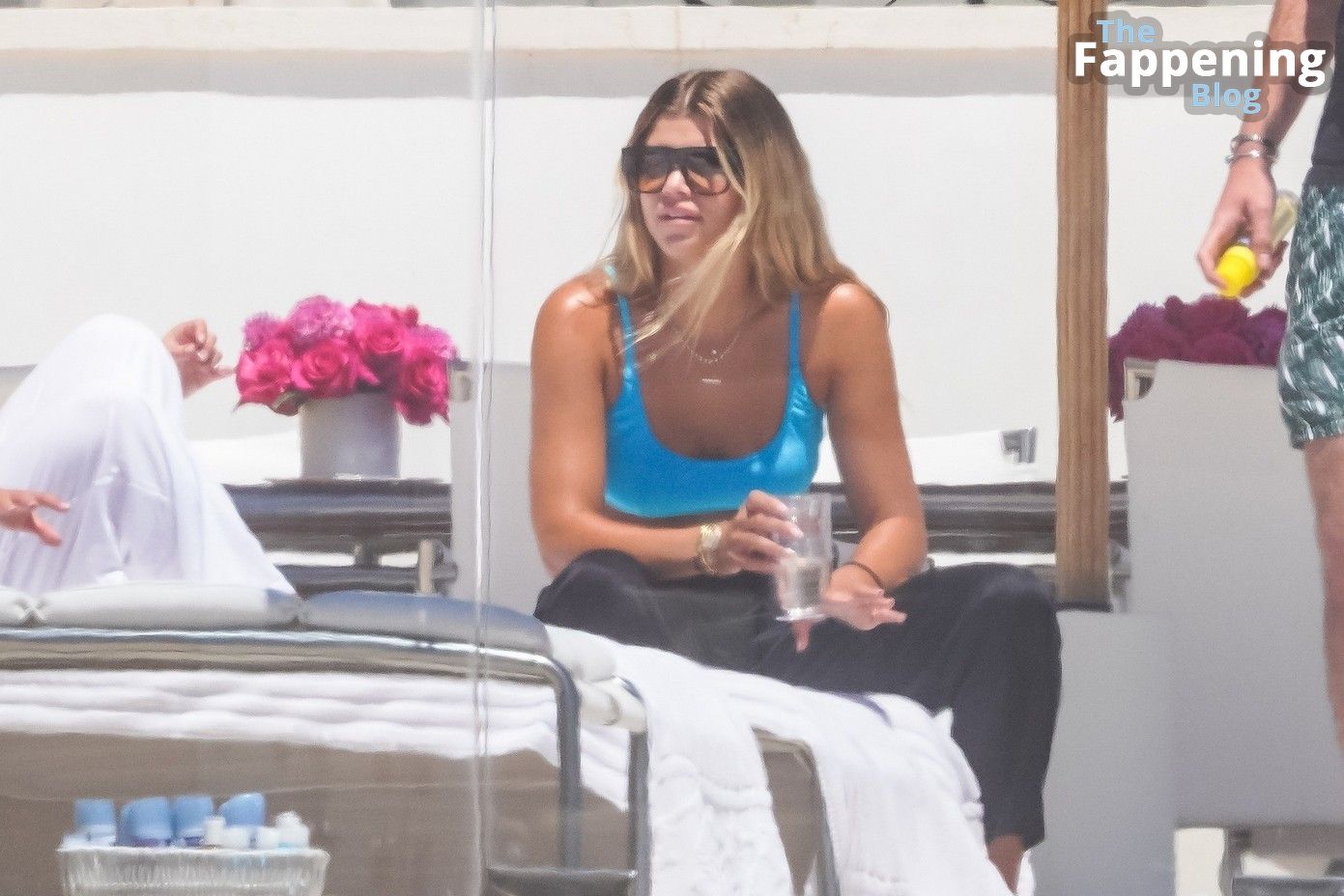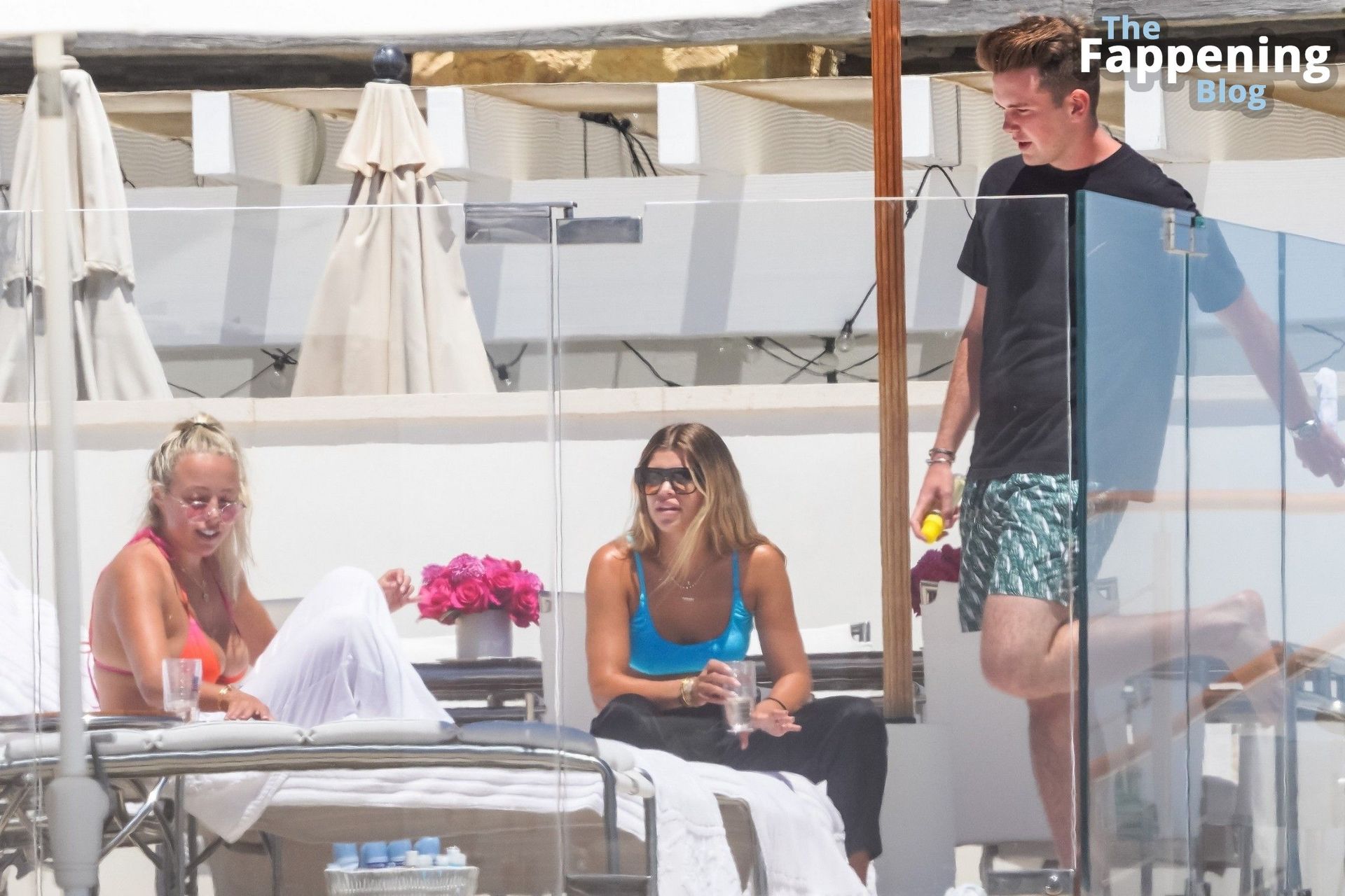 Sofia Richie est vue en bikini bleu en train de se détendre avec des amis sur le balcon de leur chambre d’hôtel de luxe.