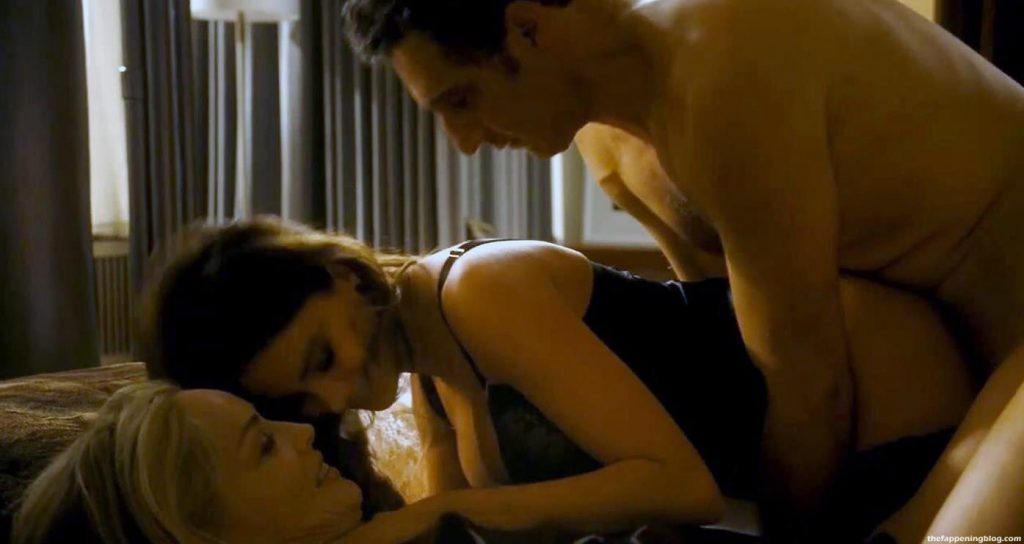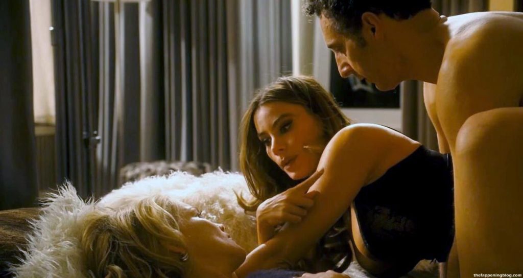 The first scene that I have to show you is from the ‘Fading Gigolo’ movie. In this scene, we see Sofia Vergara in some sexy lingerie with ample cleavage as she reclines on a circular bed with Sharon Stone, who exposes many legs. As a male approaches in the doorway, the two females glance up, and then we see the guy having sex with Sofia from behind, her breasts practically protruding from her bodice. Sharon, on the other hand, lies close to Sofia and watches.