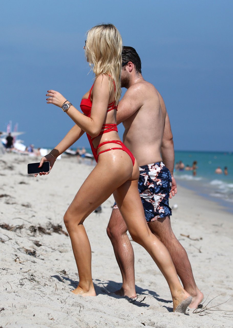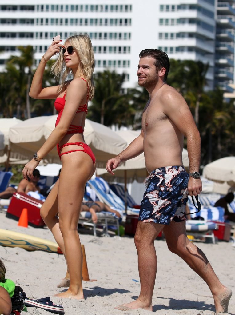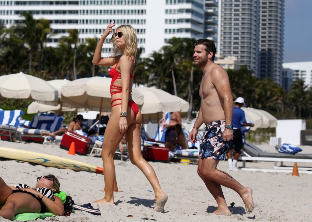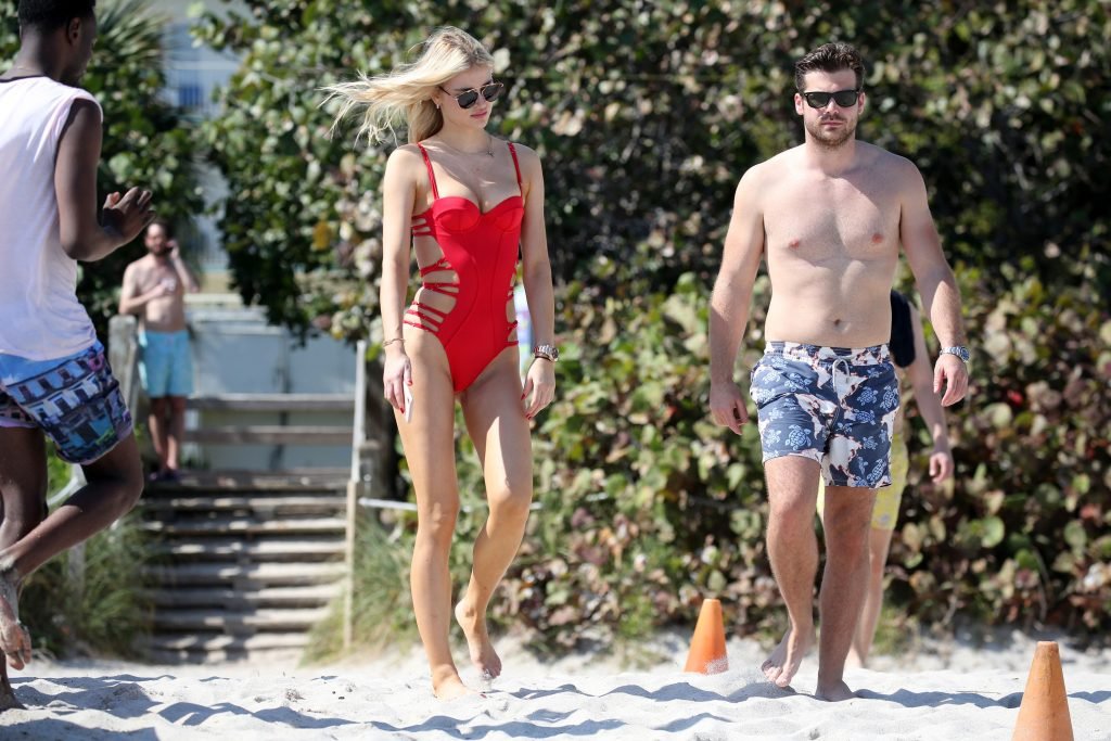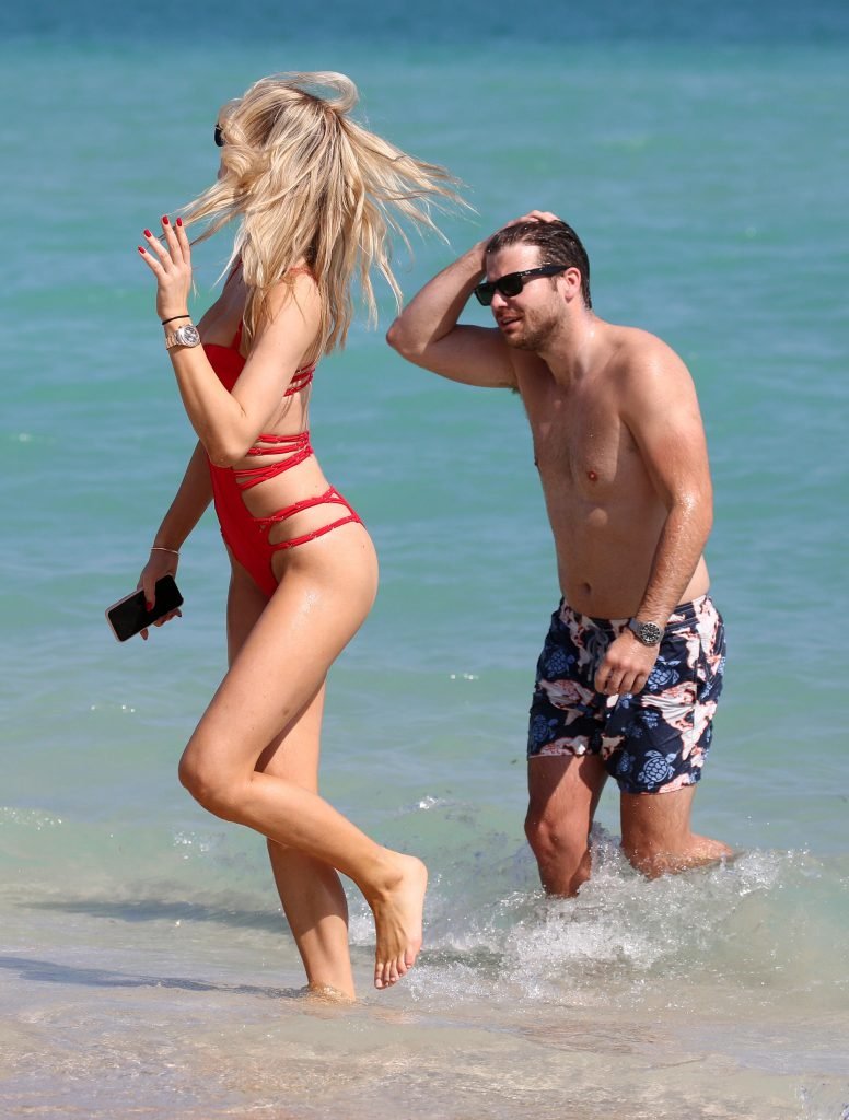 Le mannequin Sofija Milosevic, 25 ans, porte un bikini rouge alors qu’elle passe la Saint-Valentin avec le footballeur Adem Ljajic sur la plage de Miami, le 14/02/2018.