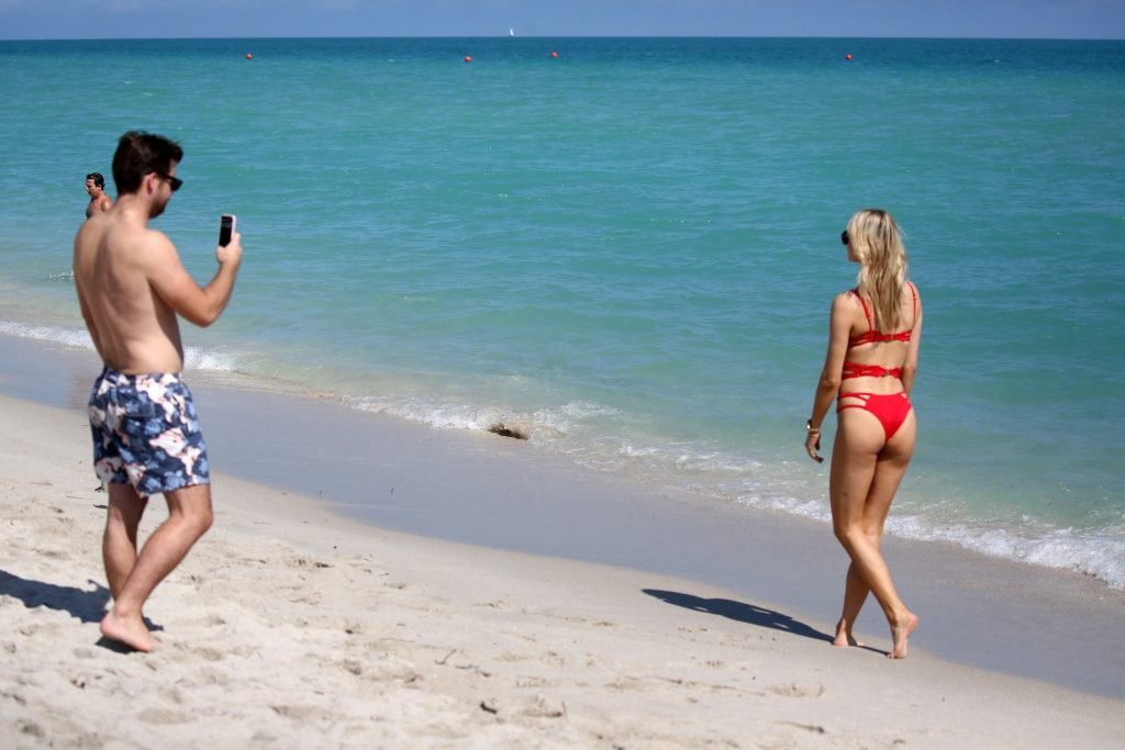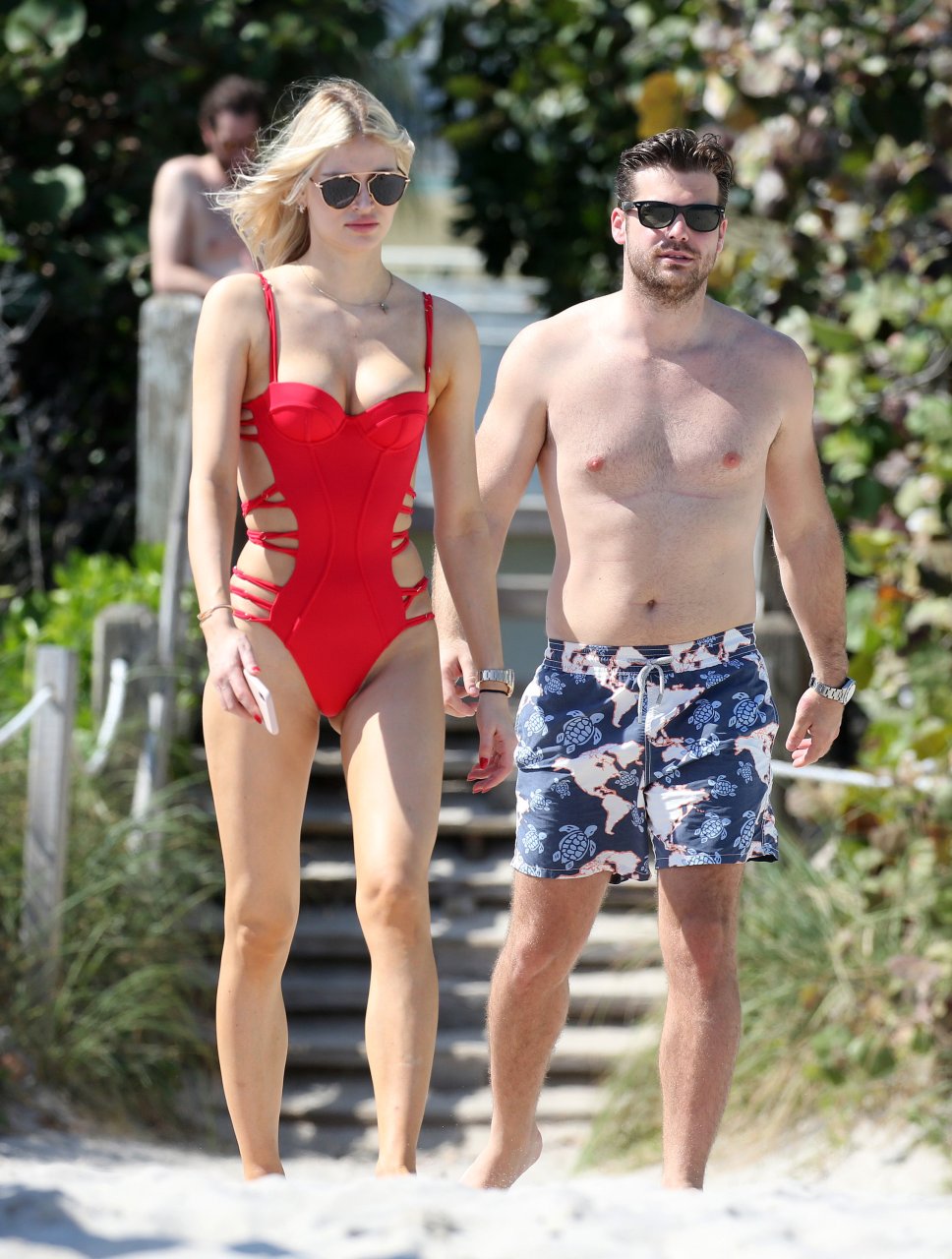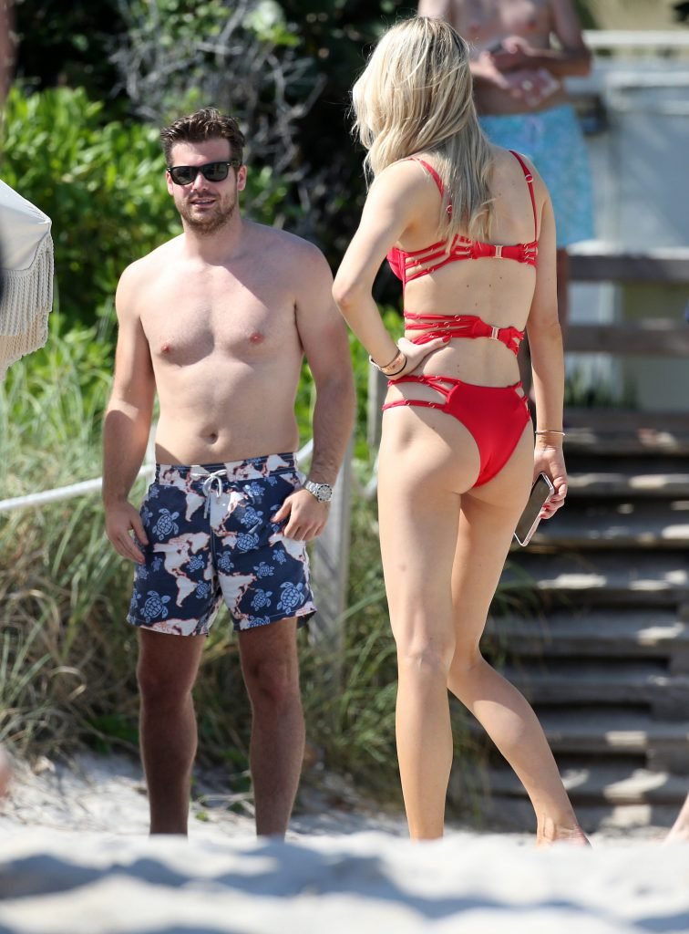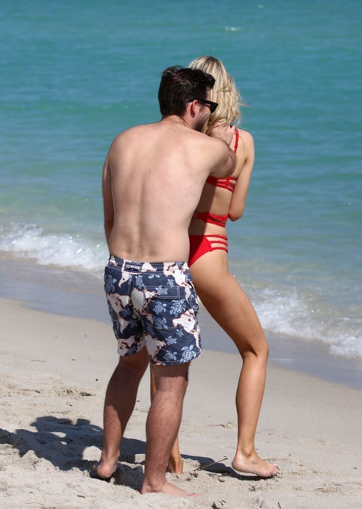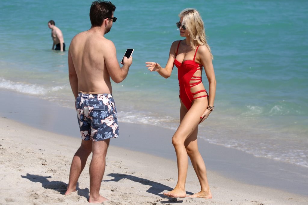 Le mannequin Sofija Milosevic, 25 ans, porte un bikini rouge alors qu’elle passe la Saint-Valentin avec le footballeur Adem Ljajic sur la plage de Miami, le 14/02/2018.