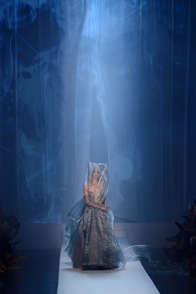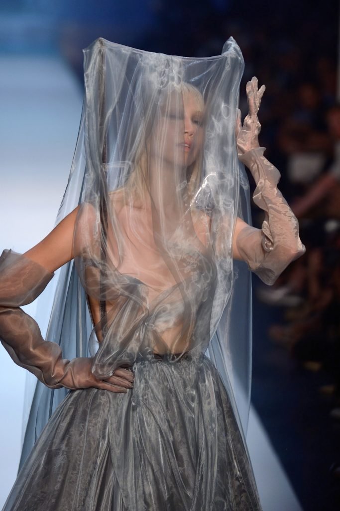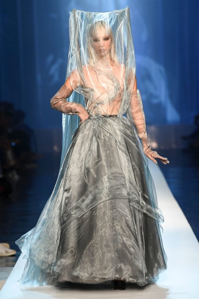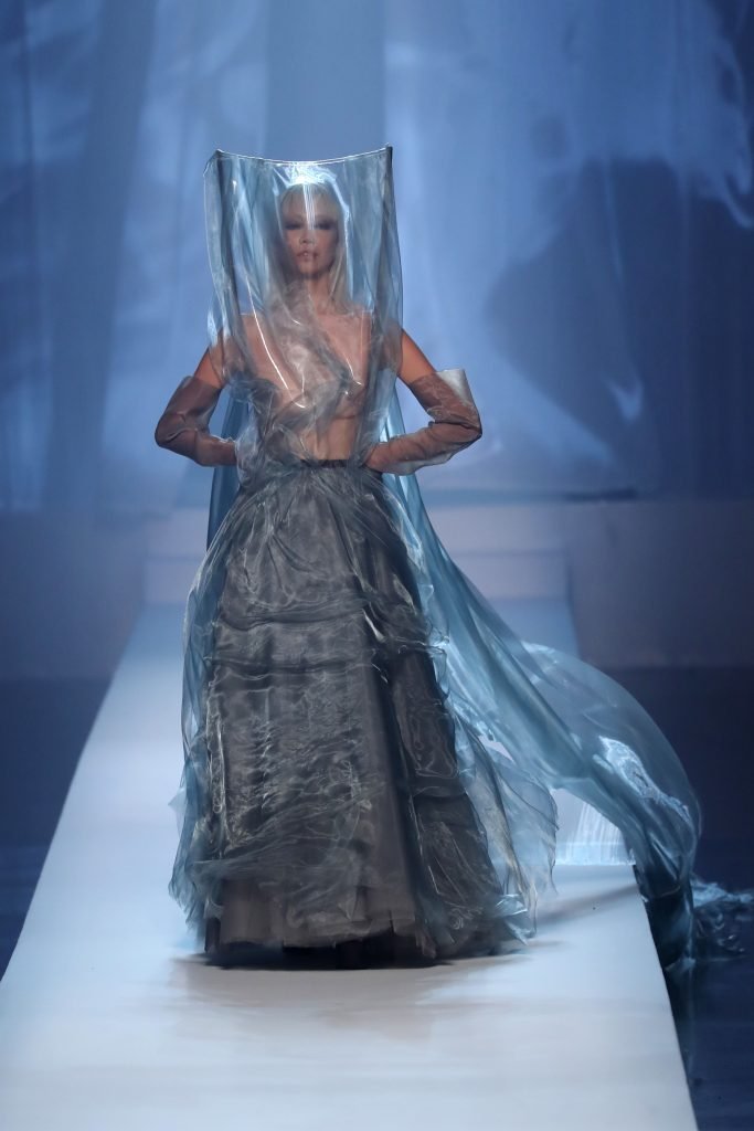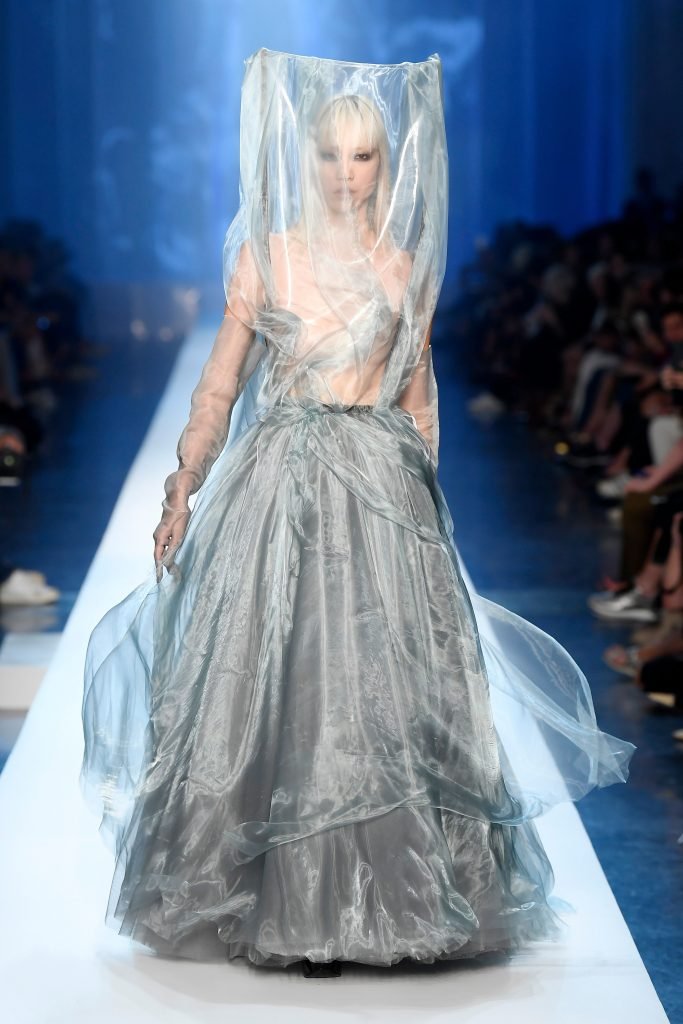 La mannequin asiatique Soo Joo Park défile en robe avec un voile transparent lors de la Semaine de la Mode Haute Couture Automne/Hiver 2018/19 de Jean-Paul Gaultier tenue à Paris, France, le 07/04/2018. Soo Joo Park est un mannequin coréen. Âge : 32 ans.
