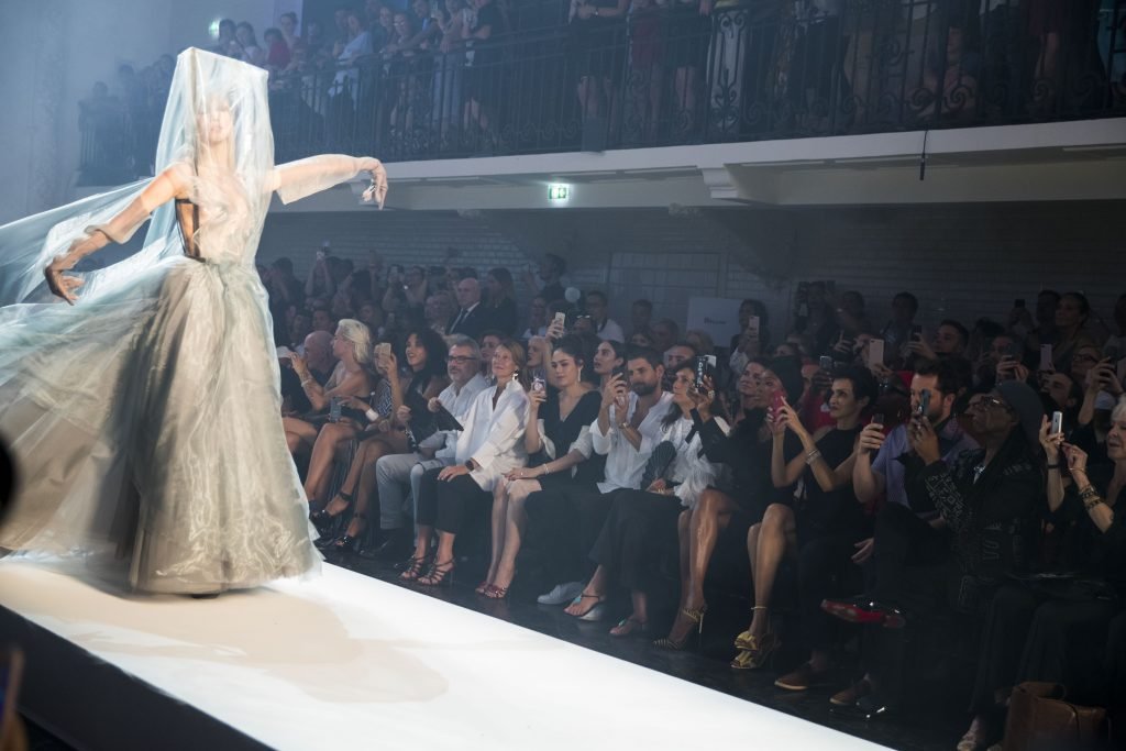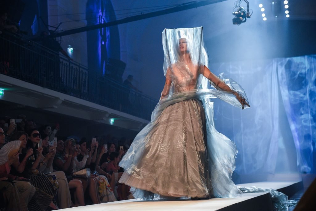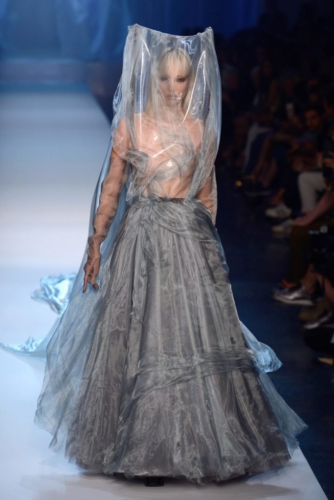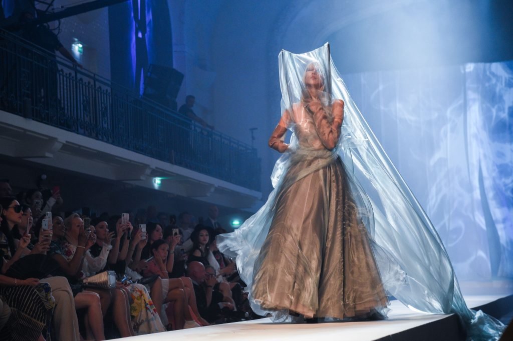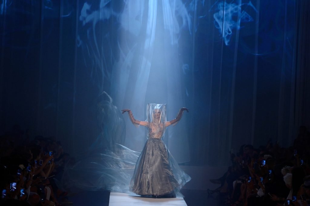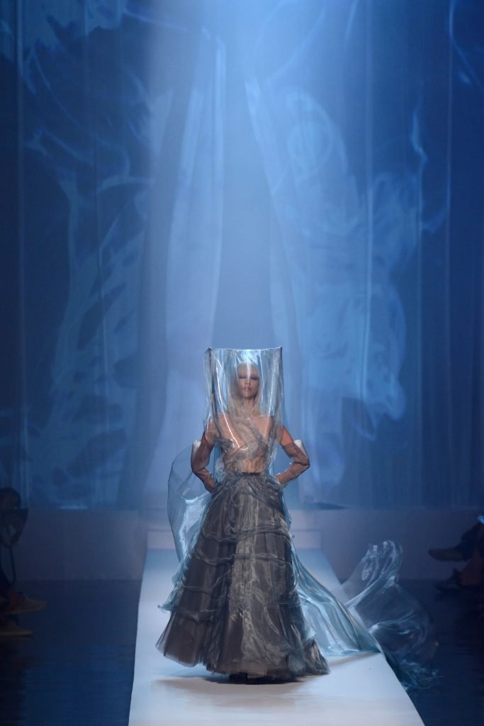 La mannequin asiatique Soo Joo Park défile en robe avec un voile transparent lors de la Semaine de la Mode Haute Couture Automne/Hiver 2018/19 de Jean-Paul Gaultier tenue à Paris, France, le 07/04/2018. Soo Joo Park est un mannequin coréen. Âge : 32 ans.