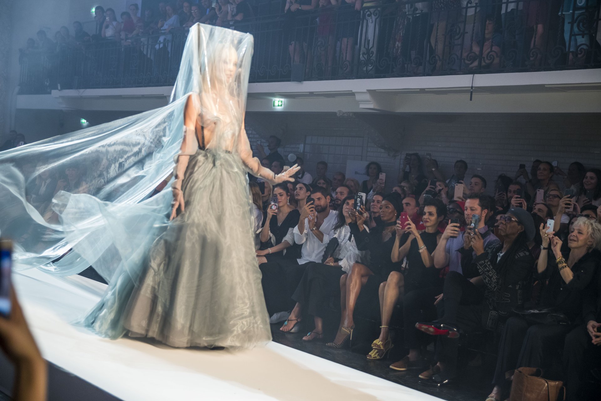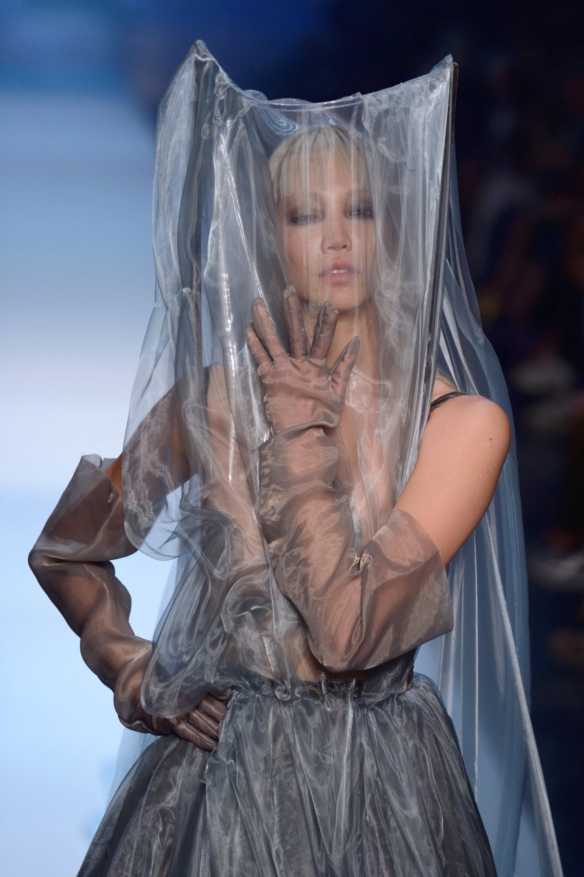 La mannequin asiatique Soo Joo Park défile en robe avec un voile transparent lors de la Semaine de la Mode Haute Couture Automne/Hiver 2018/19 de Jean-Paul Gaultier tenue à Paris, France, le 07/04/2018. Soo Joo Park est un mannequin coréen. Âge : 32 ans.