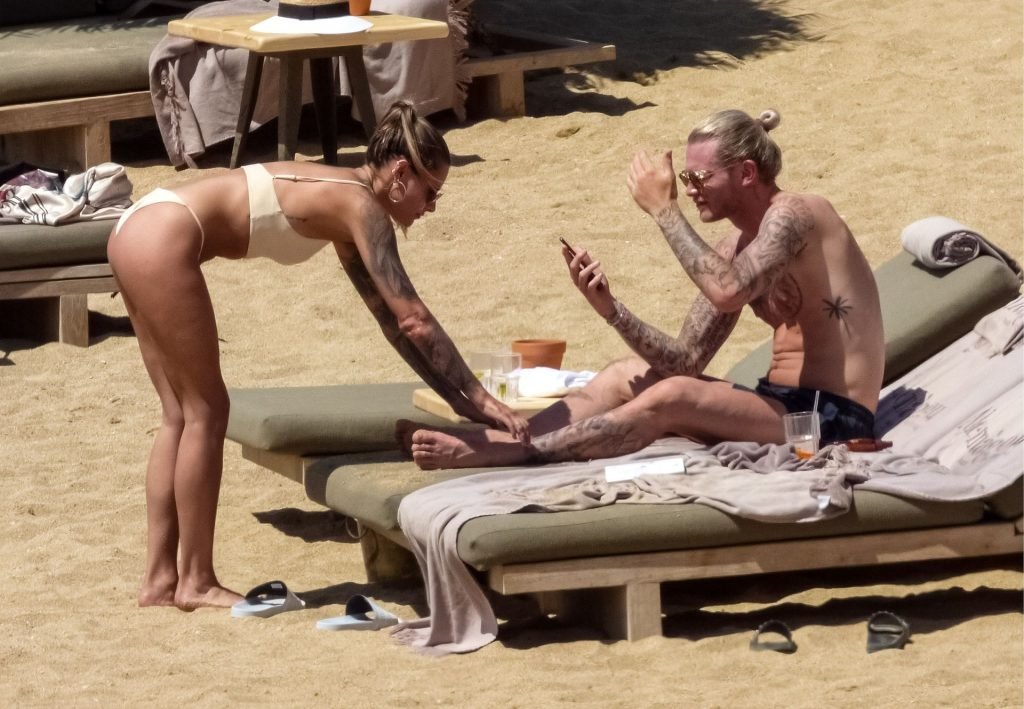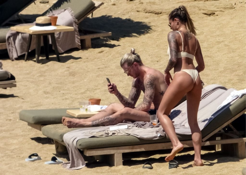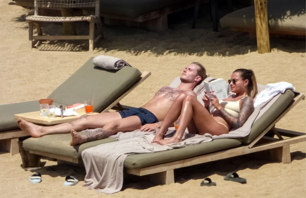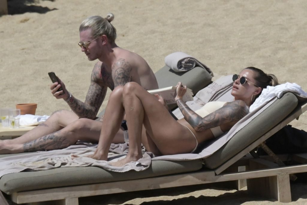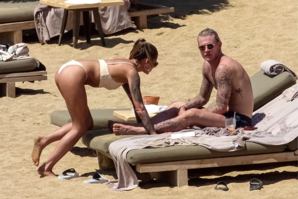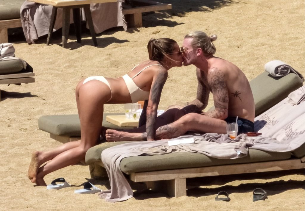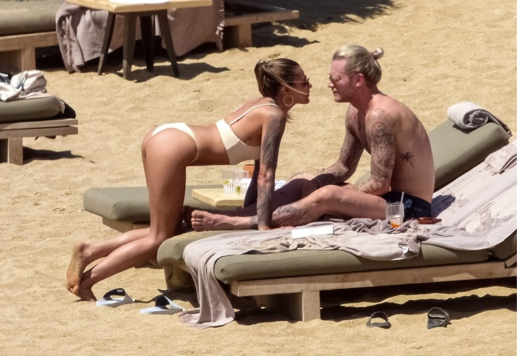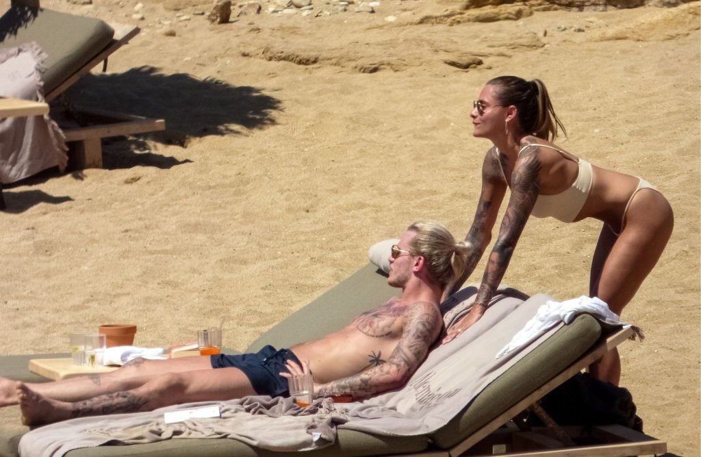 Le footballeur allemand Loris Karius et la personnalité allemande Sophia Thomalla ont été vus ensemble sur la plage de l’île de Mykonos, Grèce, le 02/06/2019.