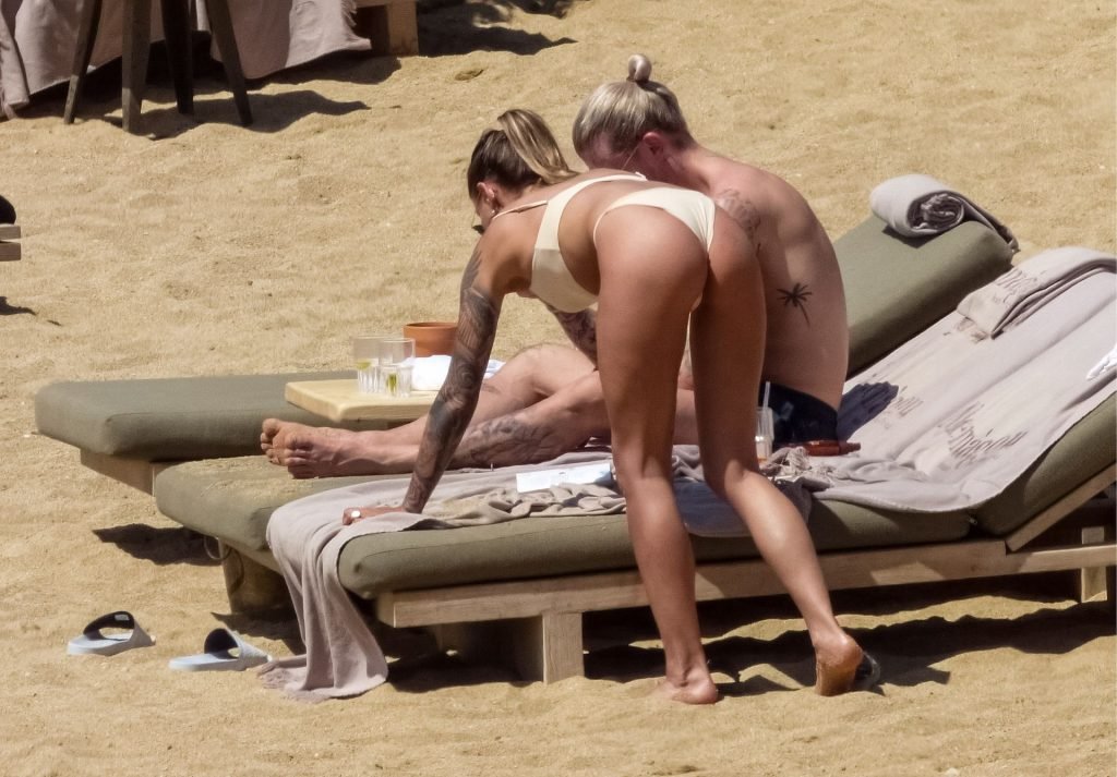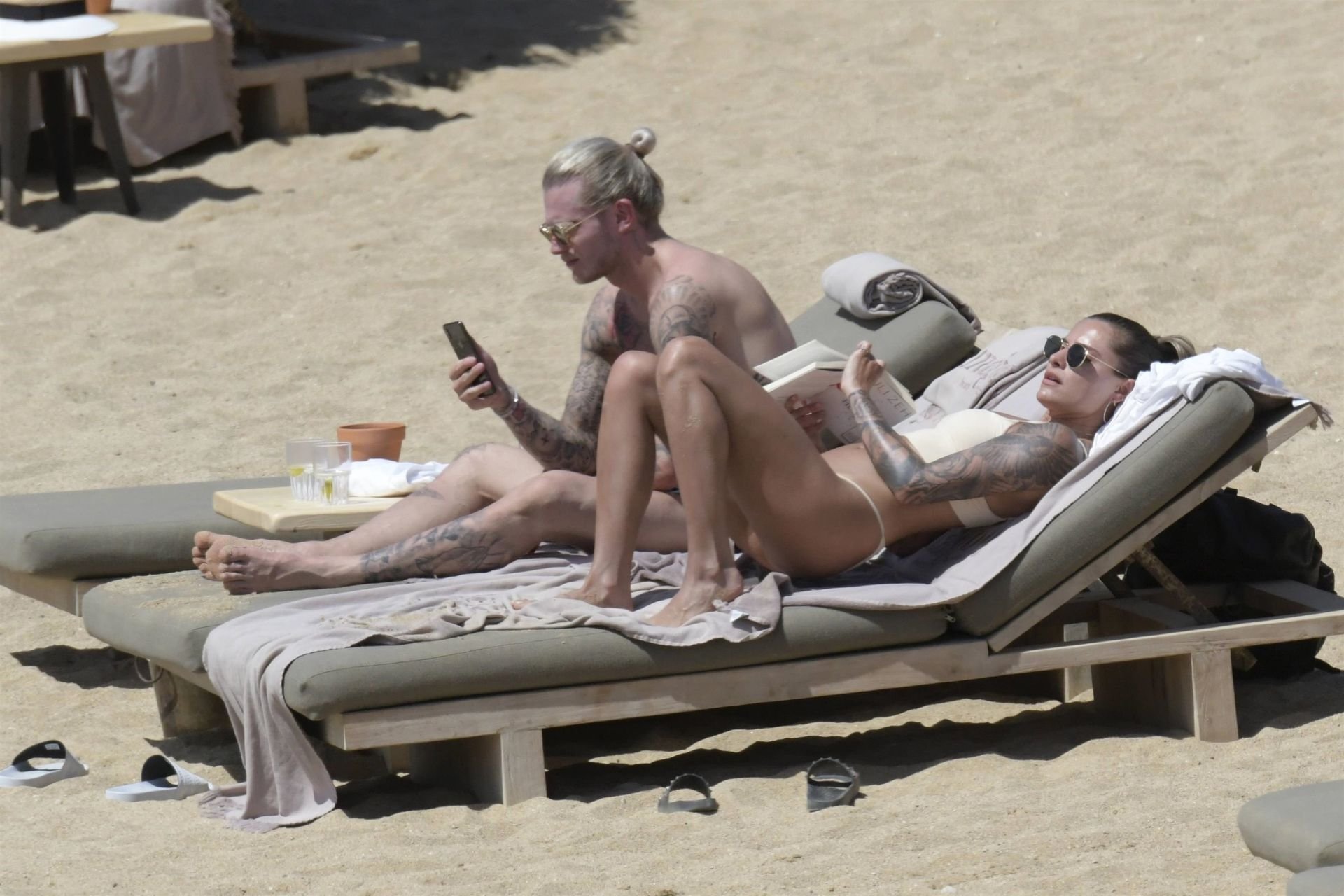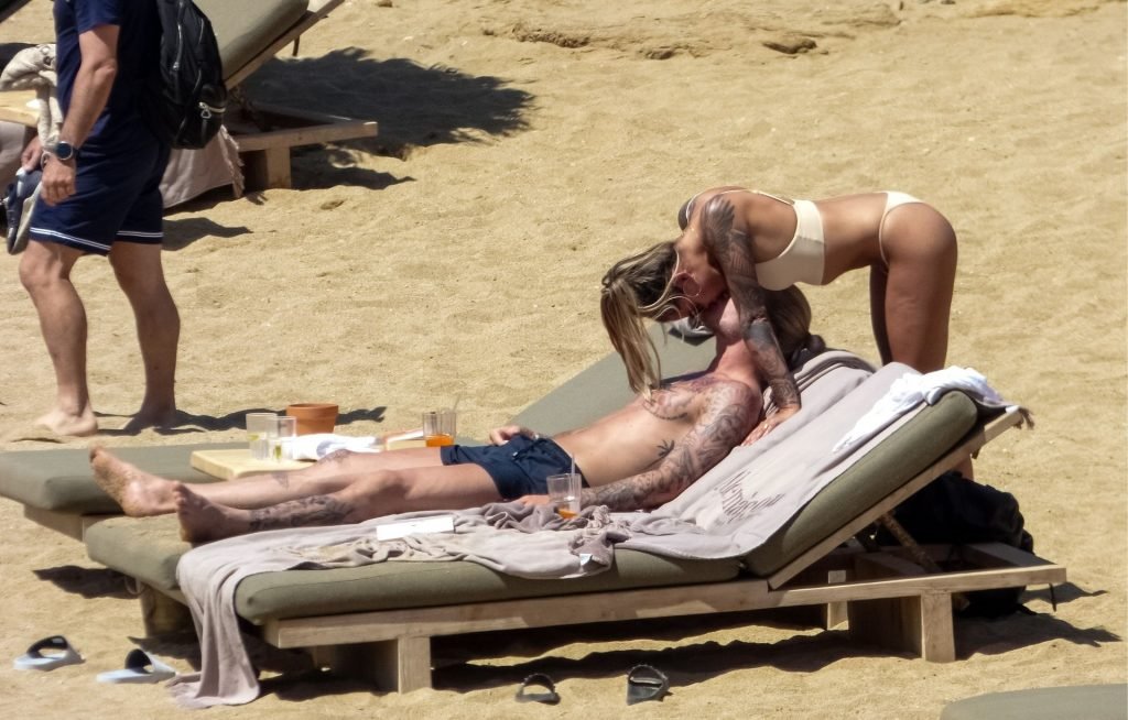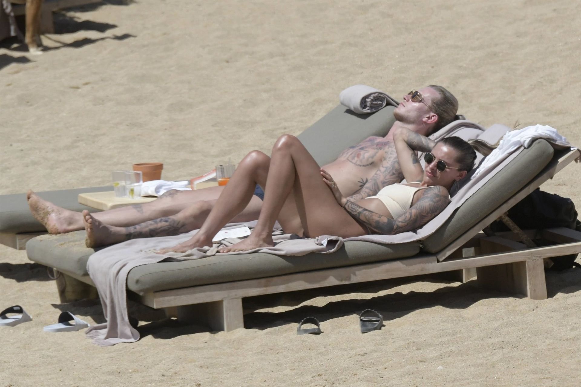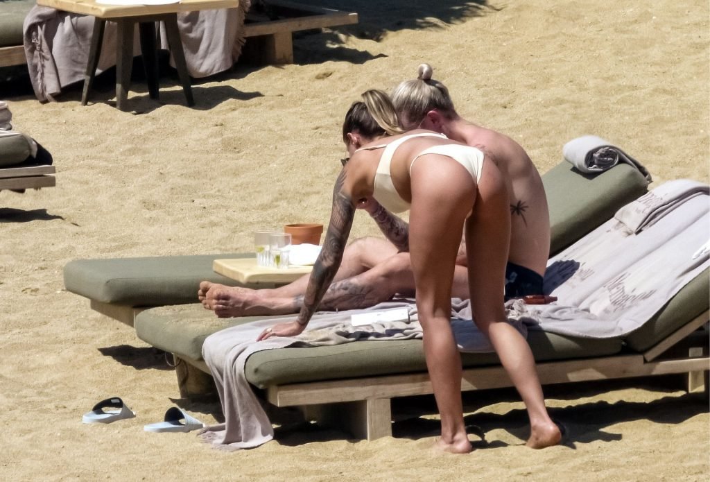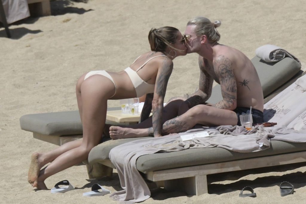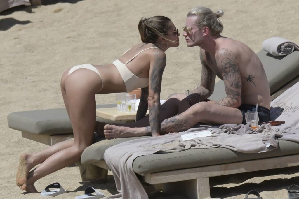 Le footballeur allemand Loris Karius et la personnalité allemande Sophia Thomalla ont été vus ensemble sur la plage de l’île de Mykonos, Grèce, le 02/06/2019.
