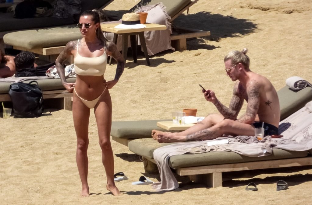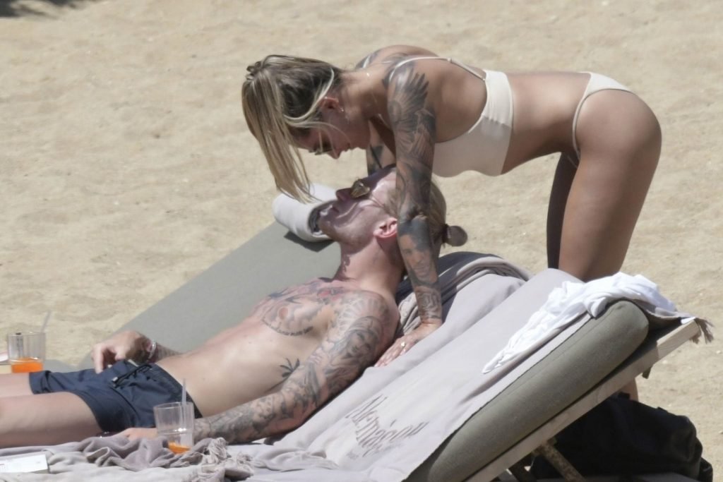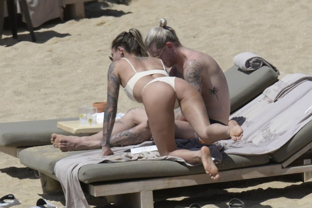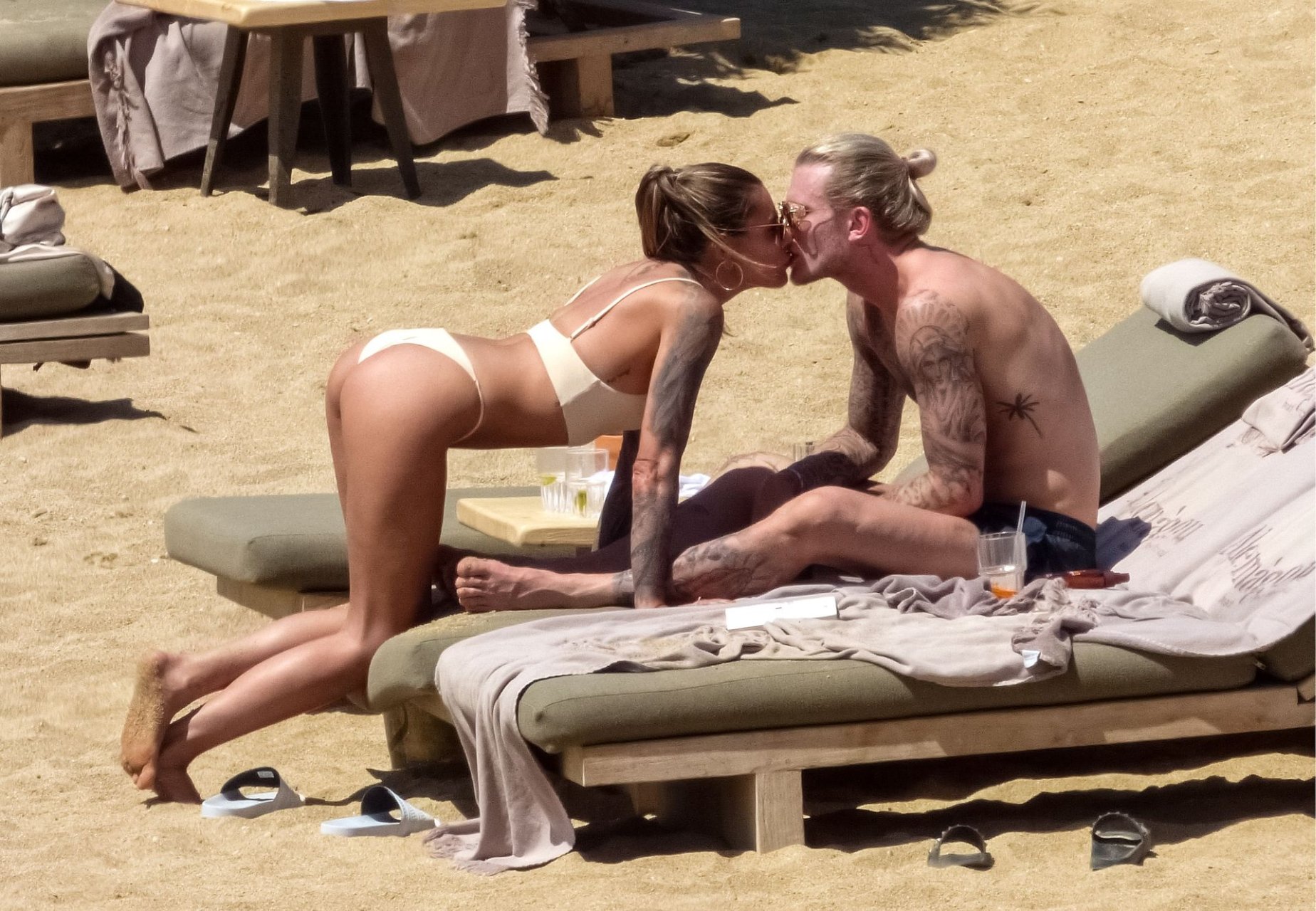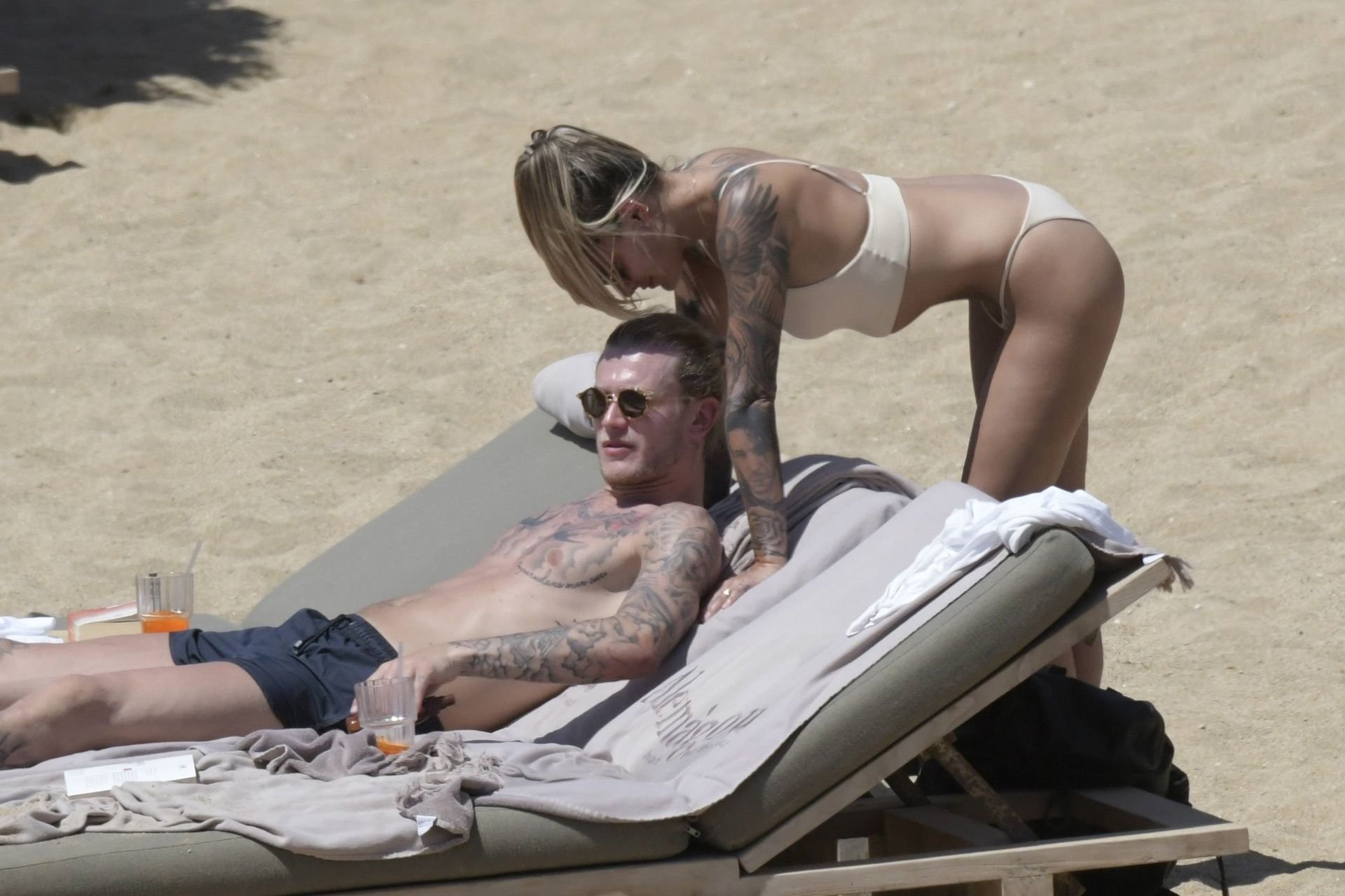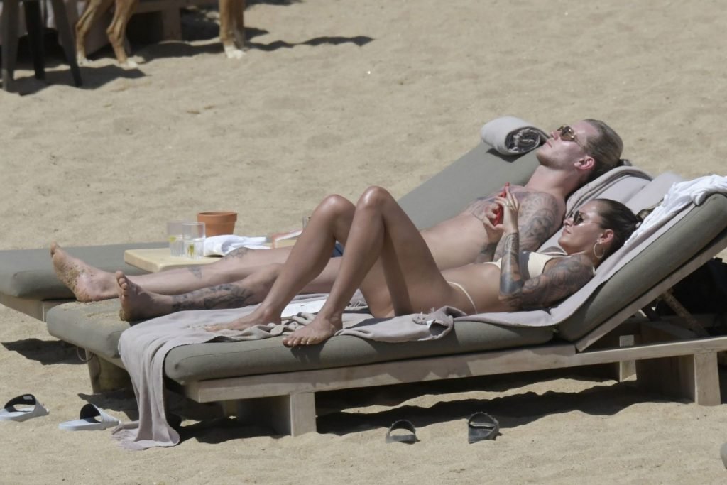 Le footballeur allemand Loris Karius et la personnalité allemande Sophia Thomalla ont été vus ensemble sur la plage de l’île de Mykonos, Grèce, le 02/06/2019.