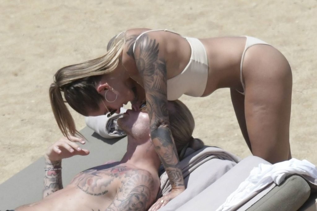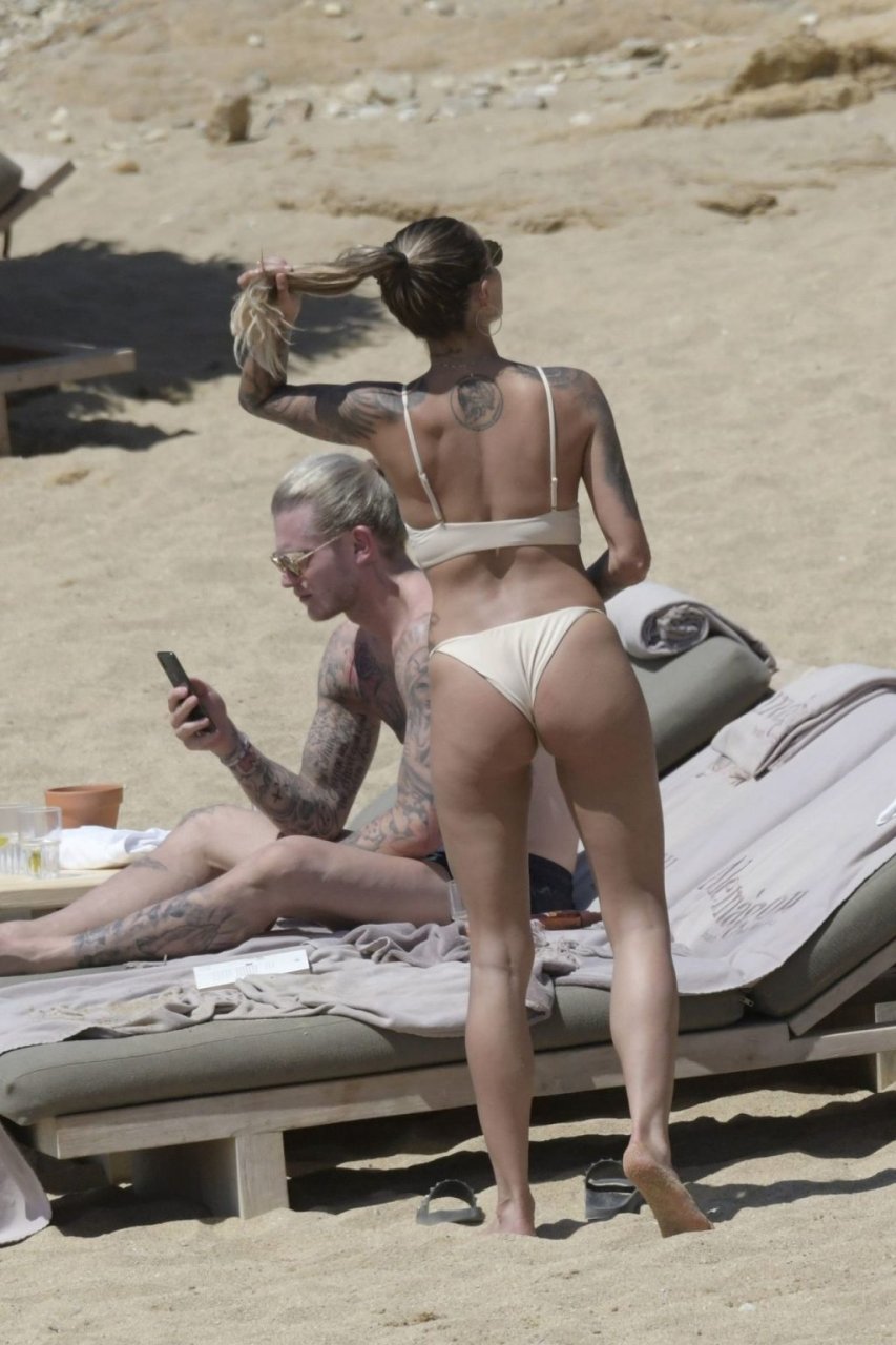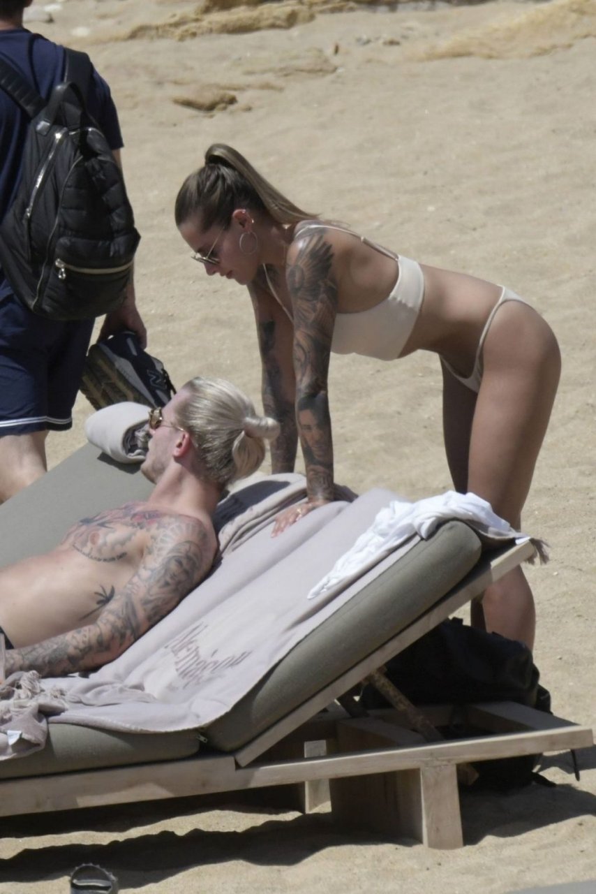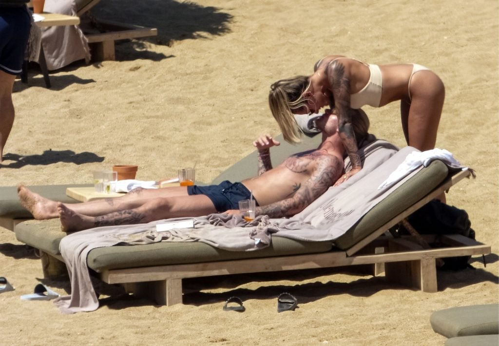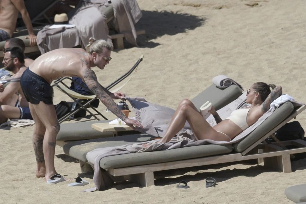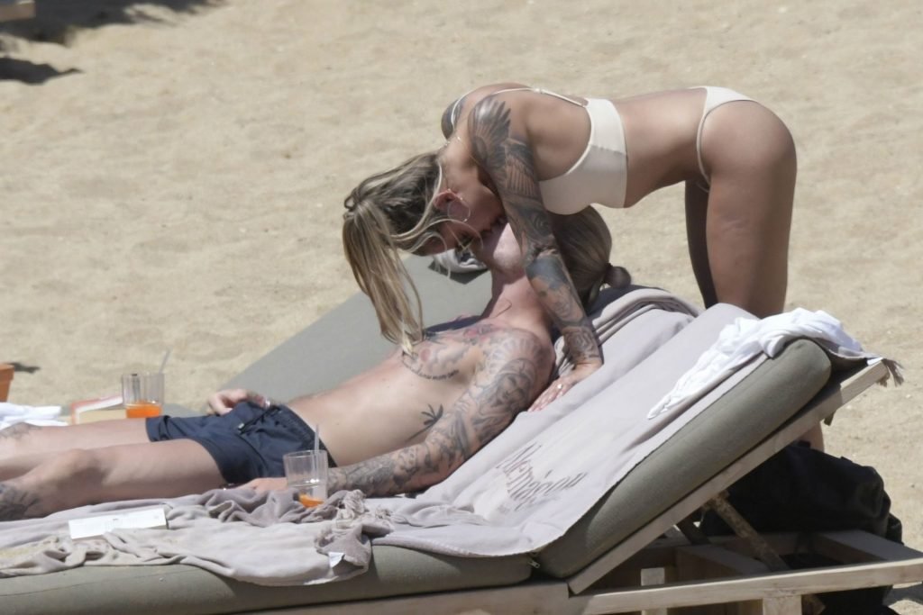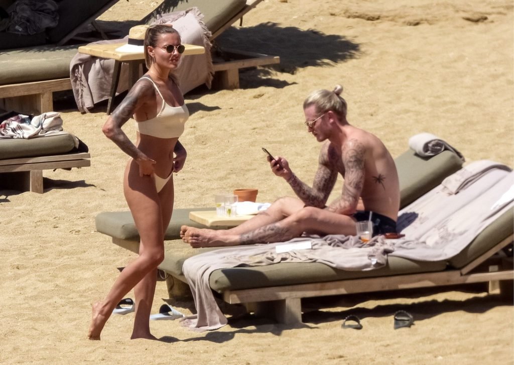 Le footballeur allemand Loris Karius et la personnalité allemande Sophia Thomalla ont été vus ensemble sur la plage de l’île de Mykonos, Grèce, le 02/06/2019.