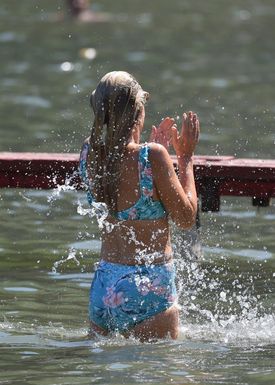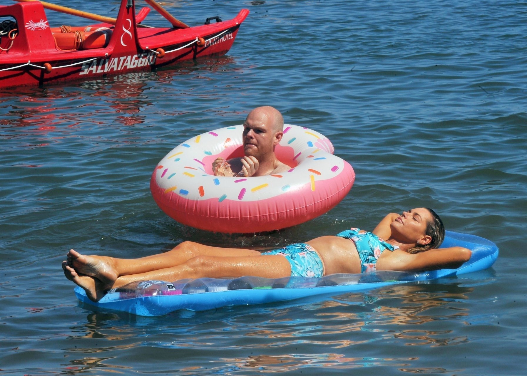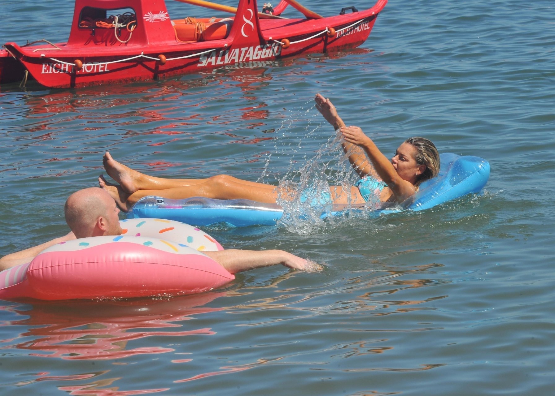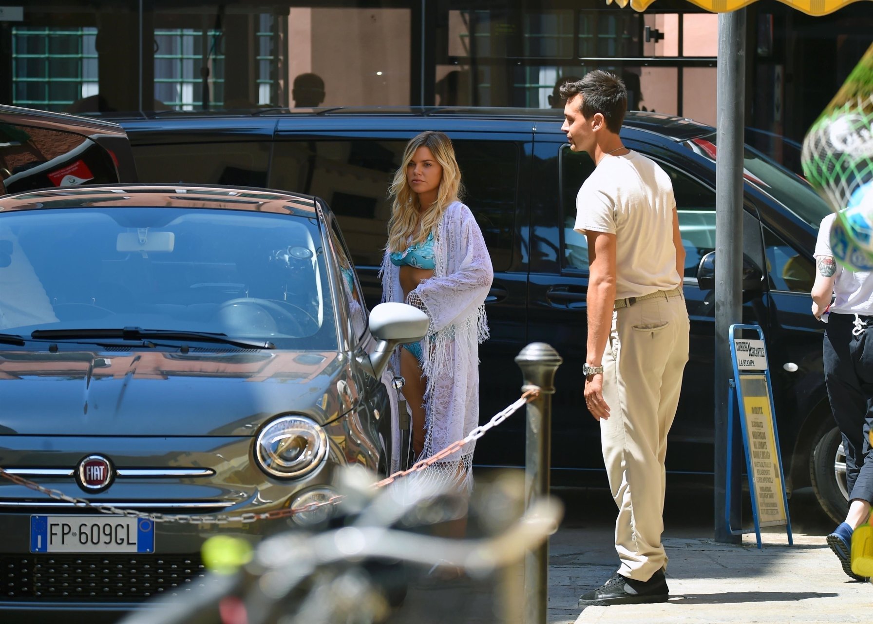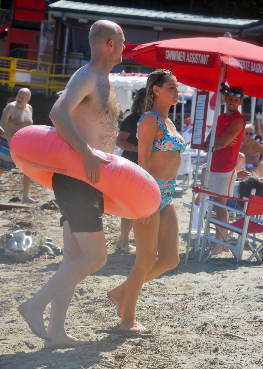 Sophie Monk a été photographiée avec un look cool dans un bikini bleu taille haute lors du tournage d’une émission de télévision avec Oscar Gordon sur la plage de Portofino, le 14/07/2018.